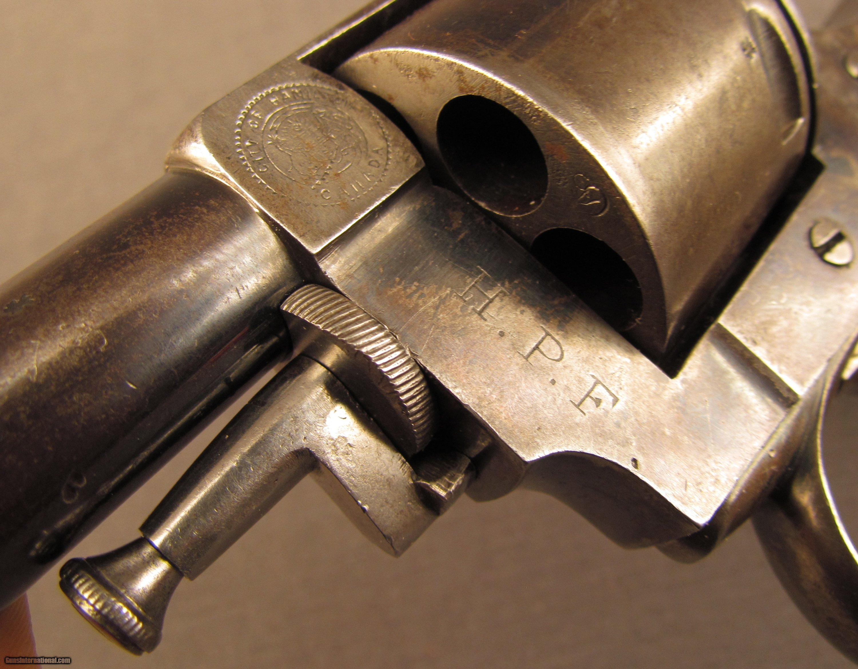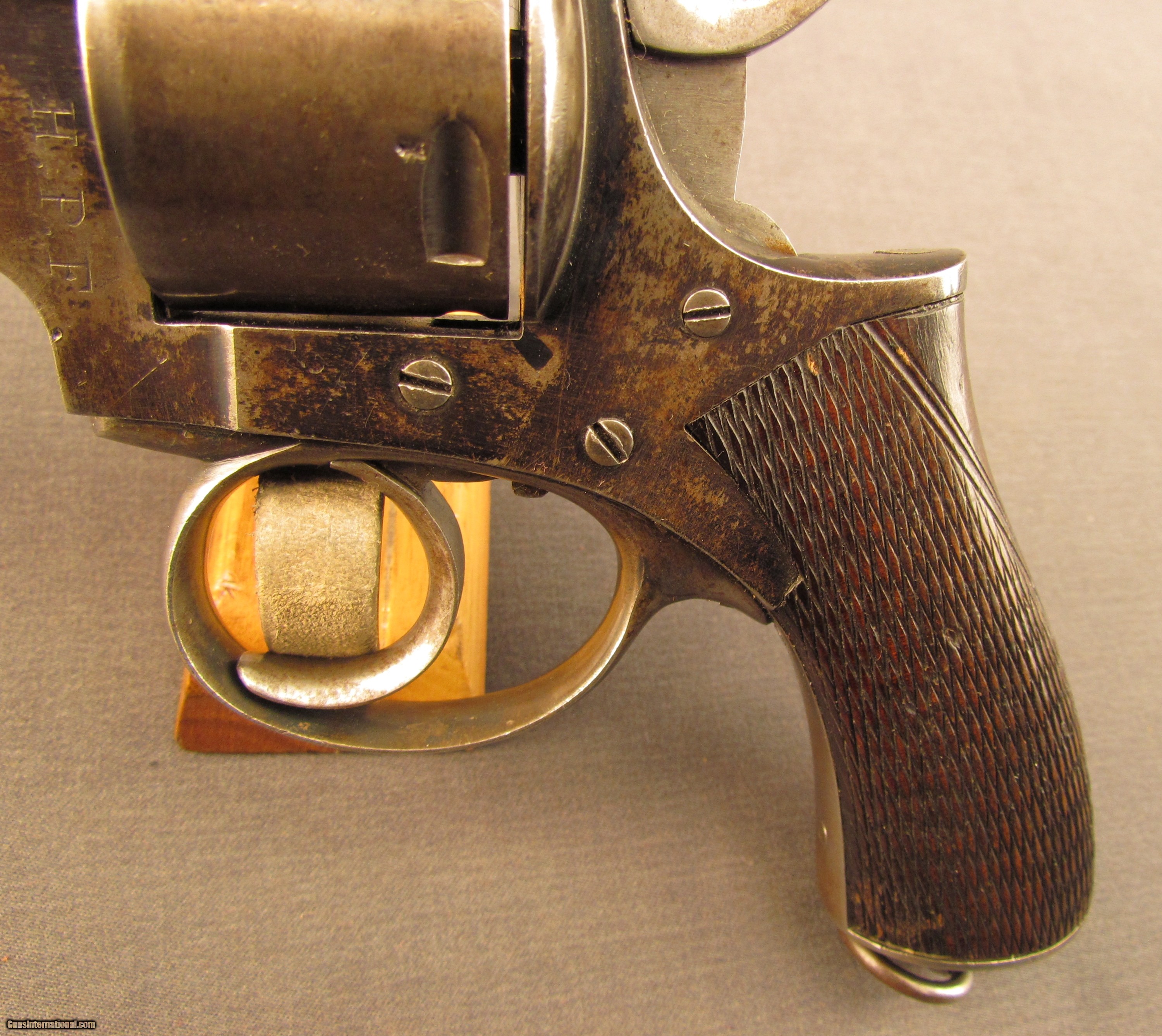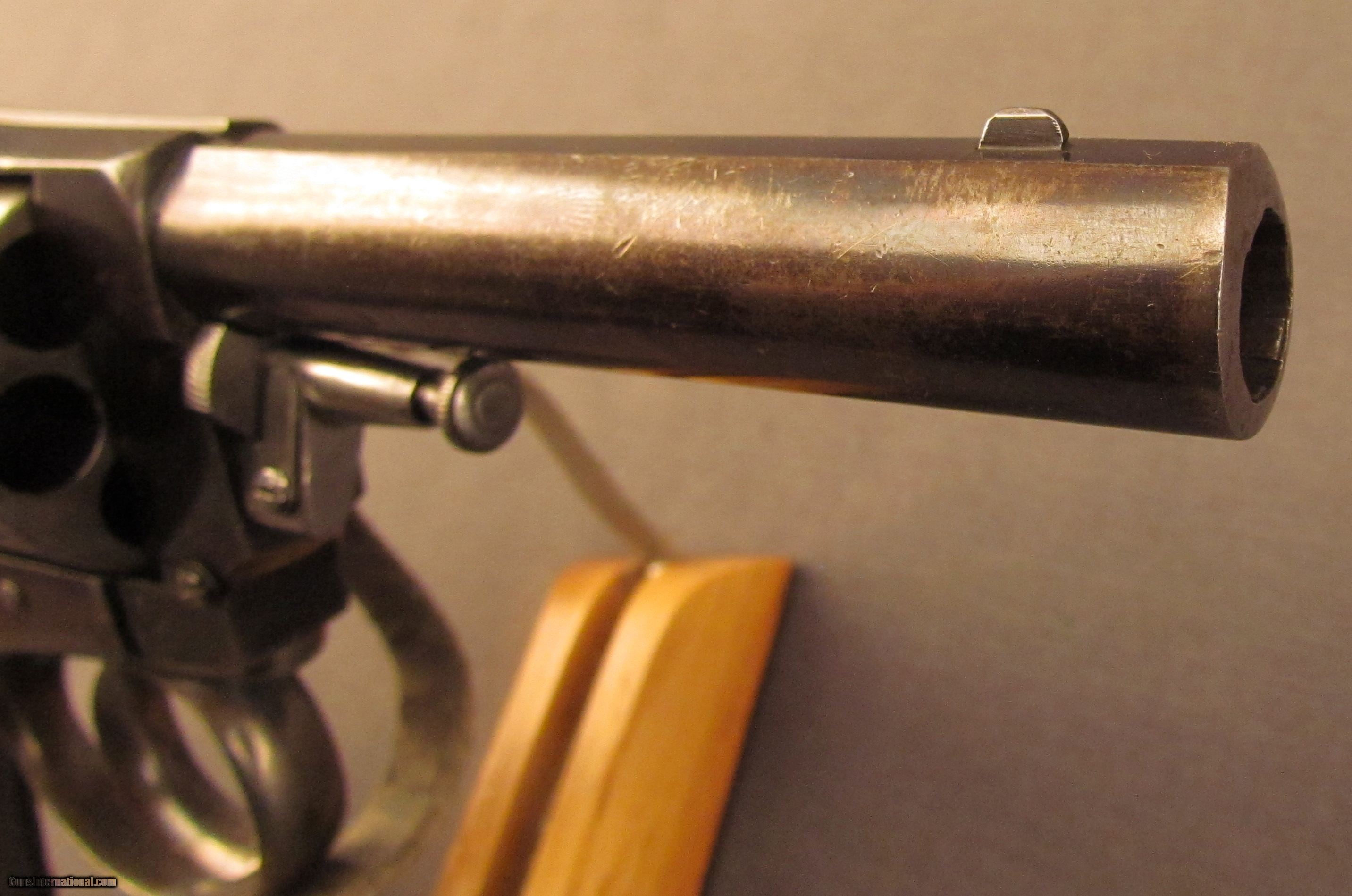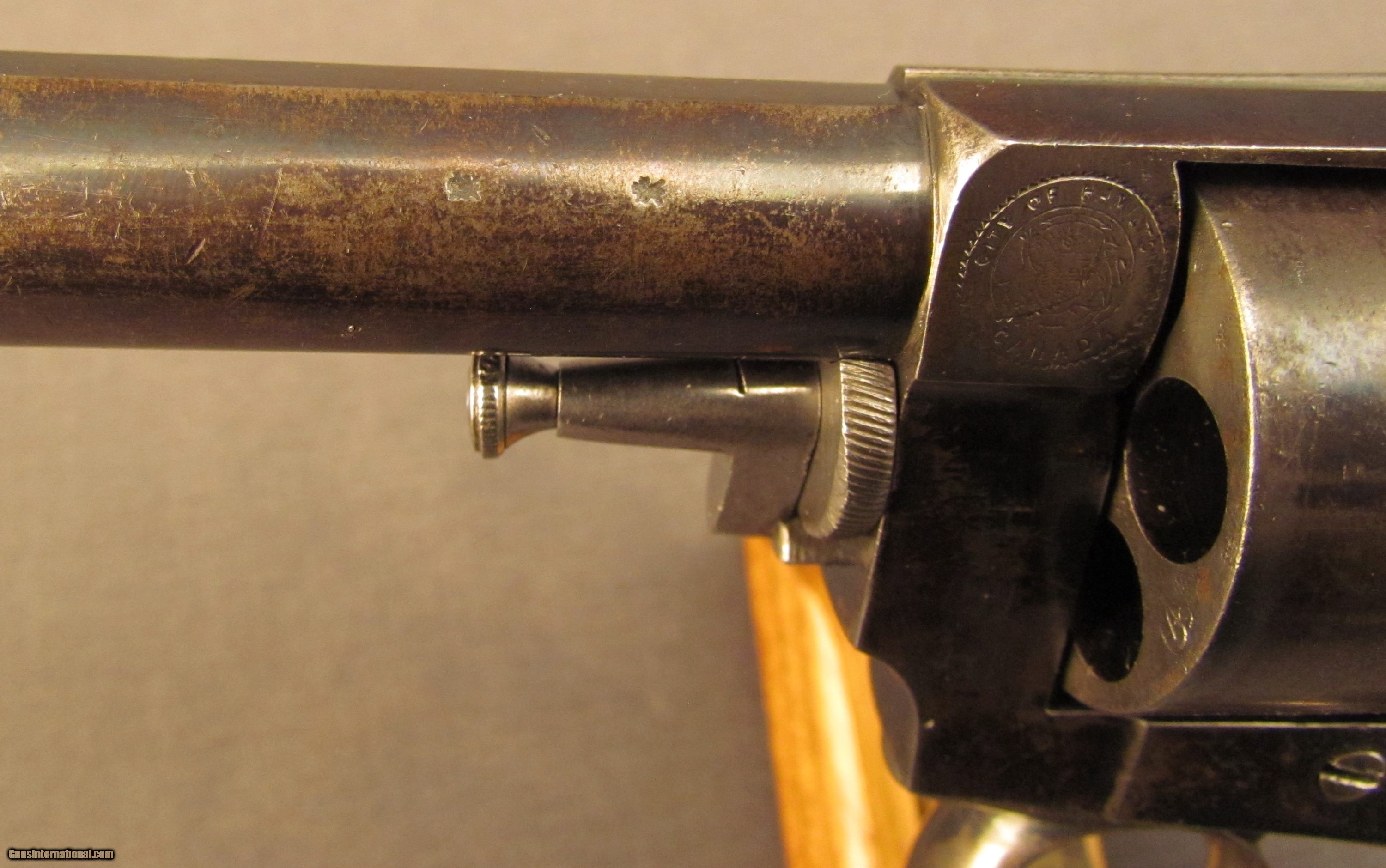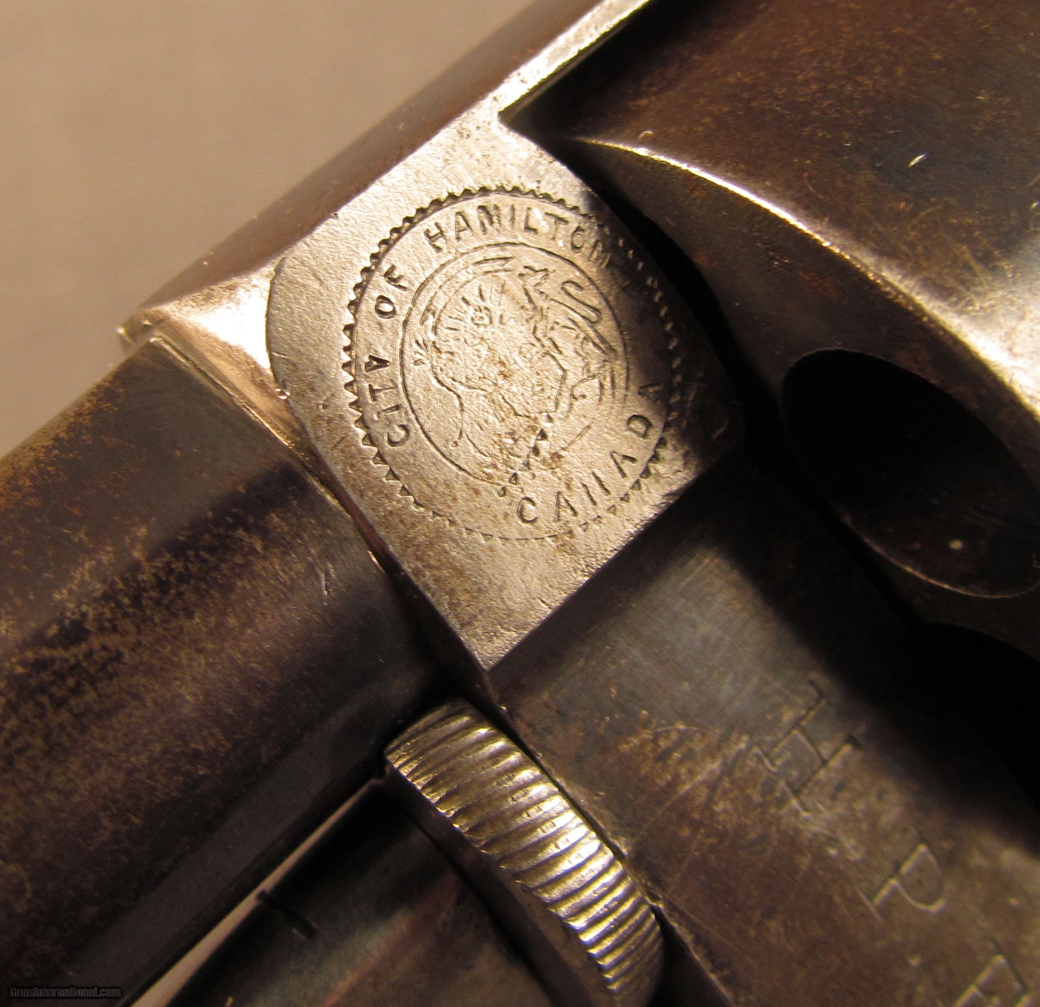 Description: A very scarce RICX type Police marked Revovler. This piece shows the city of Hamilton Canada City crest on the left side of the frame. In addition it is marked H.P.F. the finish rates as antique. 450 CF bore in the 4 3/8" barrel. The metal rates overall at 75 to 80% bright blue. There is no visible serial number other than 11 stamped twice on the rear cylinder face. The one piece checkered wood grips rate as excellent for reference see page 212 of "Webley Solid Frame Revolvers" by black, Davis and Michaud in the section of the work Ric Copies. This example is one of three Hamilton marked guns that we are aware of . This RIC is probably built from Belgium parts assembled in England a any Hamilton Ric is farscarcer than the Toronto marked RIC Revolvers. It would appear that very few were acquired for the Hamilton Police. It must also be a factor that the population of Hamilton in 1877 was very small compared to Toronto. There were only 32,641 residents of Hamilton in that year. This revolver is very scarce if not rare. An item for the Police, Ric or Webley Collector. SOLD Antique: Yes Manufacturer: Webley Model: RIC |