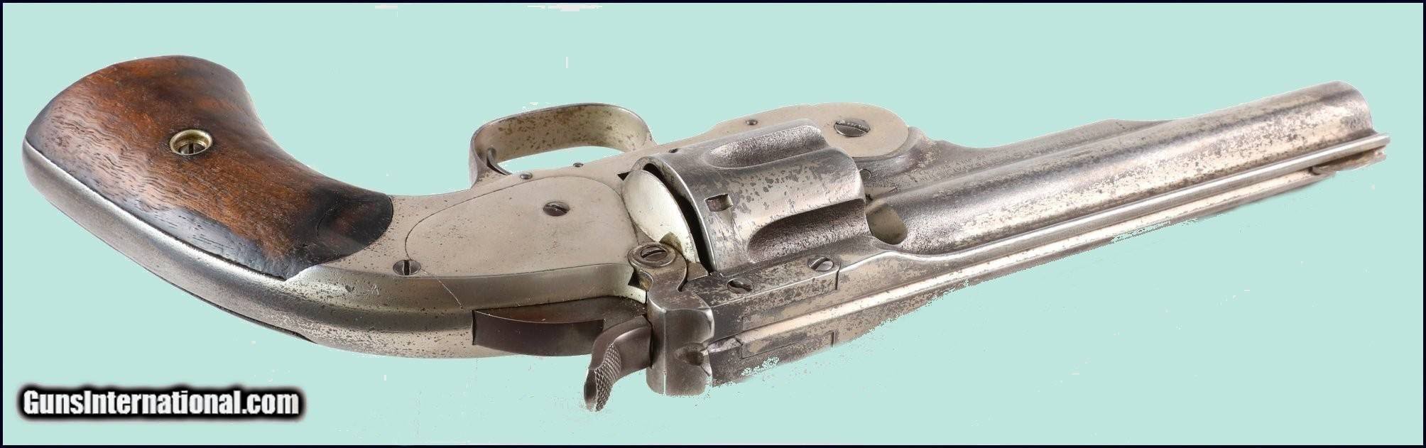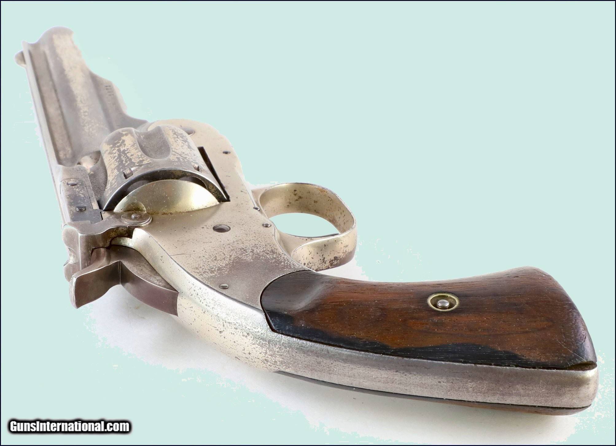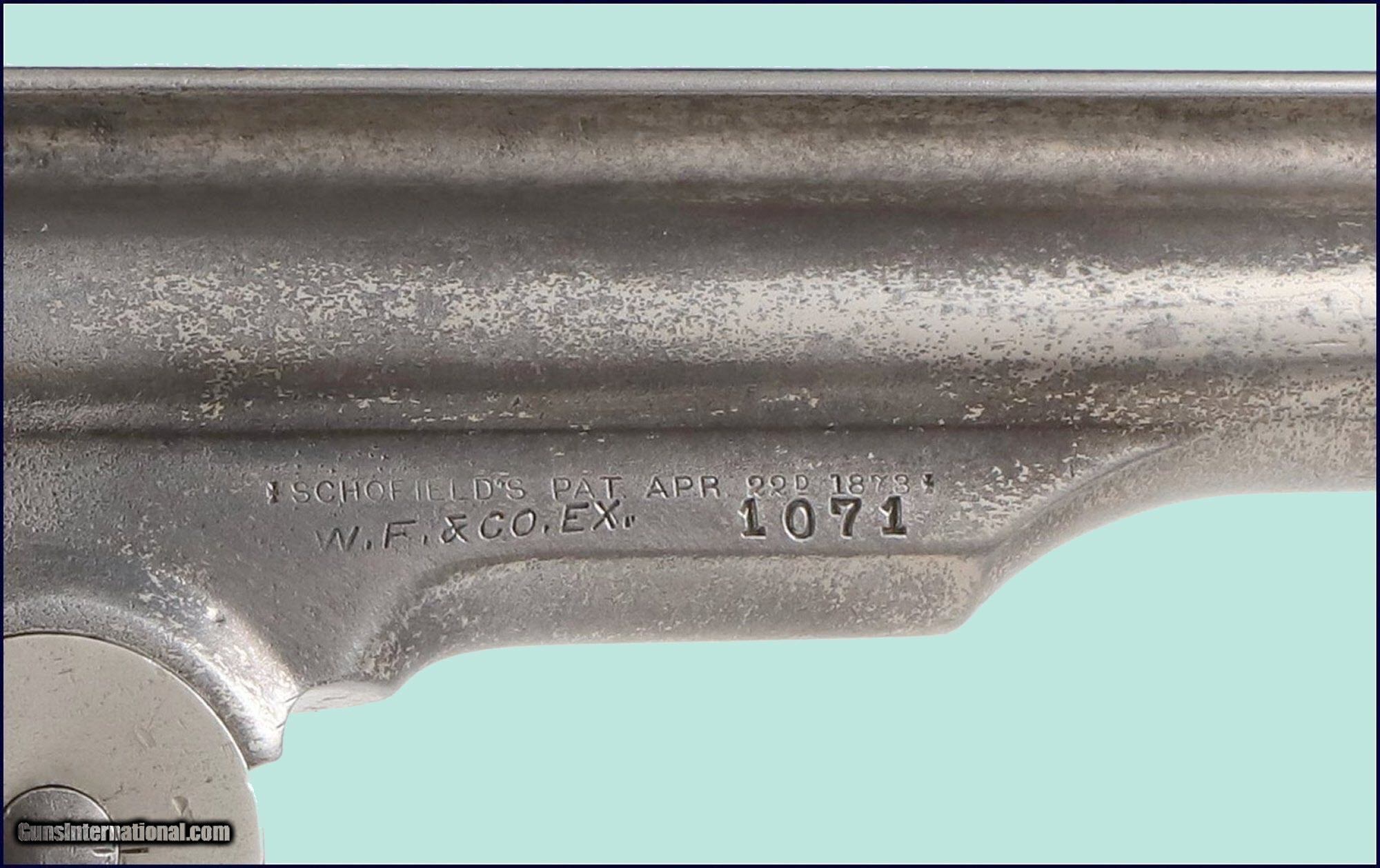 Description: Scarce "Wells Fargo & Co. Express" Marked Smith & Wesson First Model Schofield, Single Action Revolver. A total of 3,035 First Models were manufactured in 1875. This revolver was part of a group that was purchased when the Schofields were removed from the U.S. Calvary Service. The barrels were shortened to 5 inches at Bannerman Military Surplus, before being sold to "Wells Fargo & Co". This example has the standard First Model markings, with "W F & CO'S. EX 1071" added on the right side under the Schofield patent marking. Serial number 1071 has "U.S." stamped on the butt with serial number #2901 on the rear cylinder face (with an "L" below it), Both Serial Numbers were shipped to the United States Government, National Armory, Springfield MA. in the First Shipment. The cylinder was probably "switched during cleaning" or maintenance by the Calvary Armorer, and such was often the case. The mechanism is good and the screw heads are not buggered up. If you have been looking for an Authentic U.S. Cavalry Schofield that was issued to the 4th, 9th and 10th U.S. Cavalries, and the "Buffalo Soldiers" of the Indian Wars, and survived the U.S. expansion into the American West -- This is a Good One SOLD Antique: Yes |