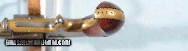 Description: WHITNEYVILLE ARMORY .32 RF CAL. BRASS FRAME NO. 1 ½ POCKET REVOLVER CA. 1870’s. 5 shot with 3 ½” octagon barrel stamped “WHITNEYVILLE ARMORY CT. U.S.A.” Excellent plus example with beautiful mellow brass and 60-70% blue on barrel. Cylinder with blue in the flutes. Hammer has much of the color case hardening. Walnut grips with nearly all the finish. Fine working order and excellent bore and chambers. SOLD Antique: Yes |