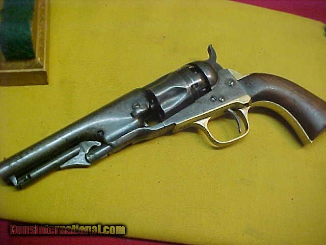 Description: #3816 Metropolitan 1862 Police revolver, 4-1/2”x36caliber percussion five shooter. Considered to mostly have been produced by Orison Blunt (of Blunt & Syms) these Metropolitan handguns, both the ’51-Navy, ’61-Navy, and the ’62-Police were just about identical copies of the Colt revolvers of the same model. They started up in the mid-Civil War period after Colt suffered a large factory fire, and lasted from 1864-1866 when law suits brought by Colt against Metropolitan were fought, delayed, postponed, and appealed. Metropolitan finally lost but still cranked out a few guns while taking advantage of the lack of good communications in that time. This particular Metropolitan is near “Fine” condition with liberal amounts of thinning blue and a very nice overall look. It has fine mechanics and bore, and shows no abuse at all. VG++ to near Fine overall. A scarce revolver, less than 3000 ever made. $1495 .....SALE!! $1350 SOLD Antique: Yes |