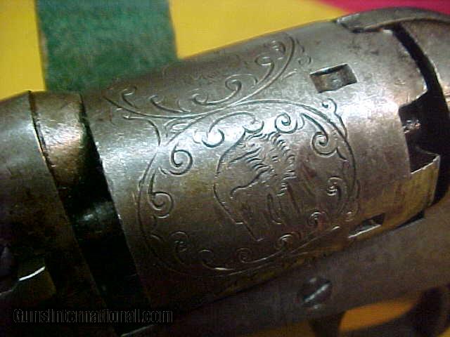 Description: #3817 Hopkins & Allin “Dictator” Pocket-Navy 36cal five shot percussion revolver.Fine action and VG+ bore. Made in the late 1860s and well into the 1870s with only about 1000 made in percussion and over 5000 made as 38RFs. Basically just being a bored out Bacon Pocket Model revolver, these well well-built post Civil War revolvers just couldn’t compete with Colt and Manhattan in the highly competitive small personal percussion handgun market. This particular gun has only the faintest traces of original blue, but the metal is Fine with minimal bumps and bruises, the scene is almost Excellent, and the grips are VG. For the collector of percussion revolvers, this is a nice addition. VG++. $775 SOLD Antique: Yes |