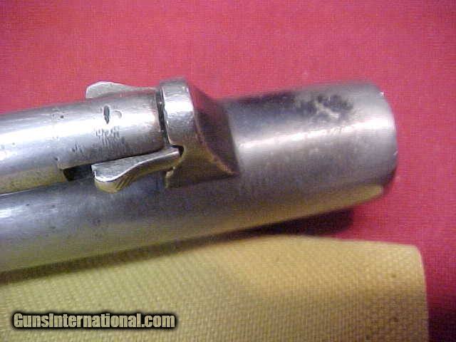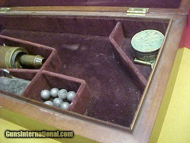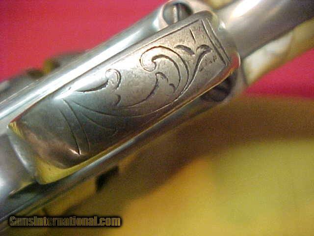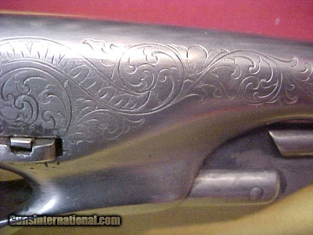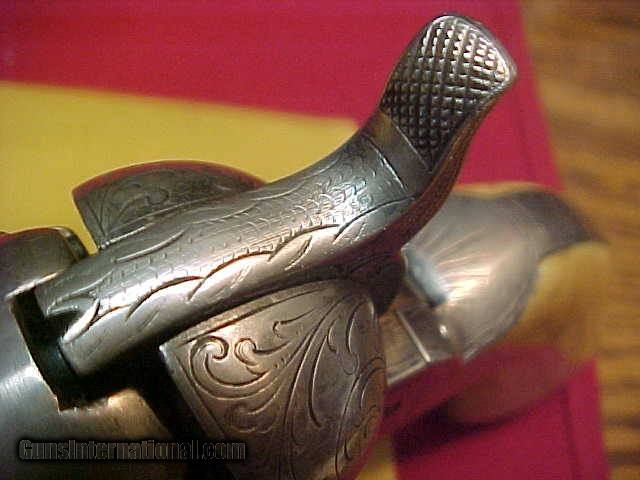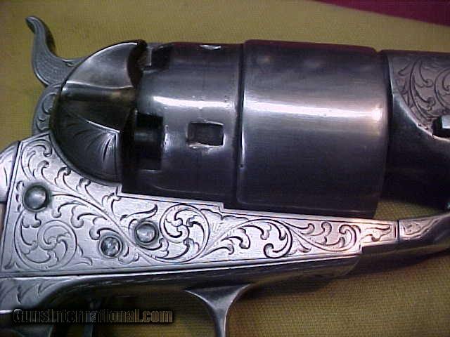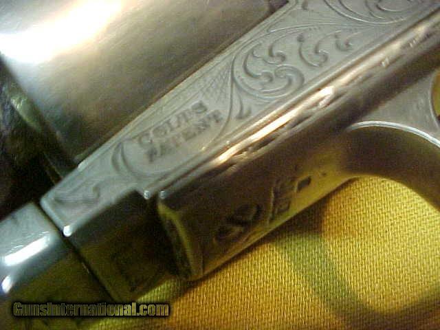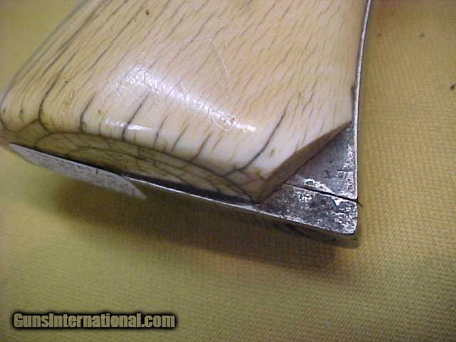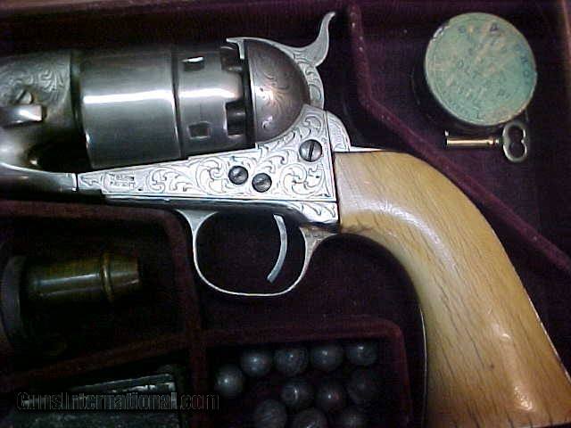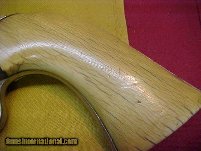 Description: #4846 Colt 1860 Army revolver, 8”x44-percussion, 167XXX (1866), Civilian model with the recoil shield not having the cut for shoulder stock. Tight action with VG bore, about a 7 on a scale of 10. The serial number has the factory “E” below the number indicating “engraving” which this gun is, but being a modest grade without the stipple background and muzzle treatment. The metal is very smooth with no pitting at all, and looks to be silver plated (having traces of tarnish in more protected areas) and it is fitted with original deeply age cracked ivory grips. It comes with a reasonably decent reproduction case and has an unmarked original old flask, Colt Army bullet mold with some cast lead bullets, and a partially filled tin of Ely percussion caps. The bullet mold is heavily pitted, but has a readable marking and usable cavities to make lead bullets. It is doubtful that the flask, while usable also, is the correct one for a cased Army. So, the point here being to not place a big value on the casing; it has some value, but nowhere near the $2500 for an original case with accessories would be if it were original. Also, on the downside of the revolver, it has a mismatched wedge and cylinder. These two pieces do match each other, but do NOT match the revolver. However, it is still a VERY handsome and very showy revolver, and it is not priced at the $20,000-$25,000 that it would be if it were a totally original cased set. VG+ as described. $3495 SOLD Antique: Yes |