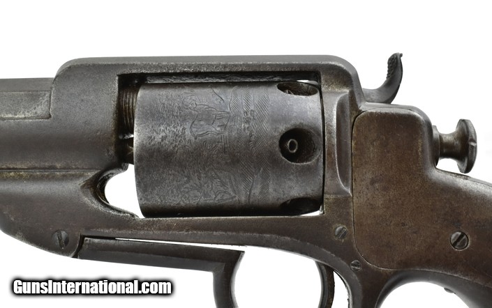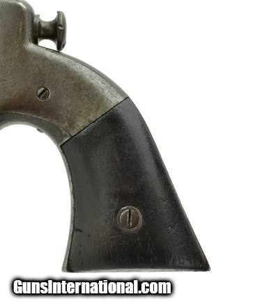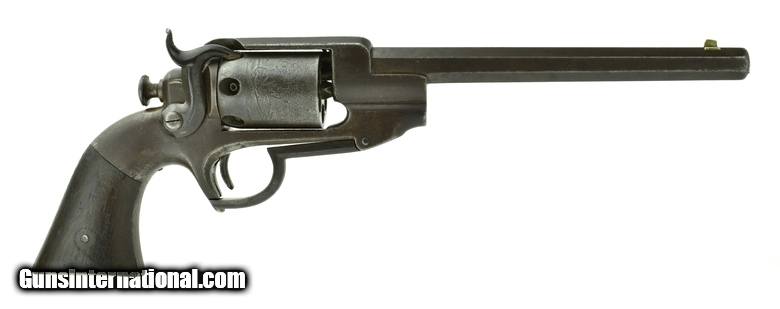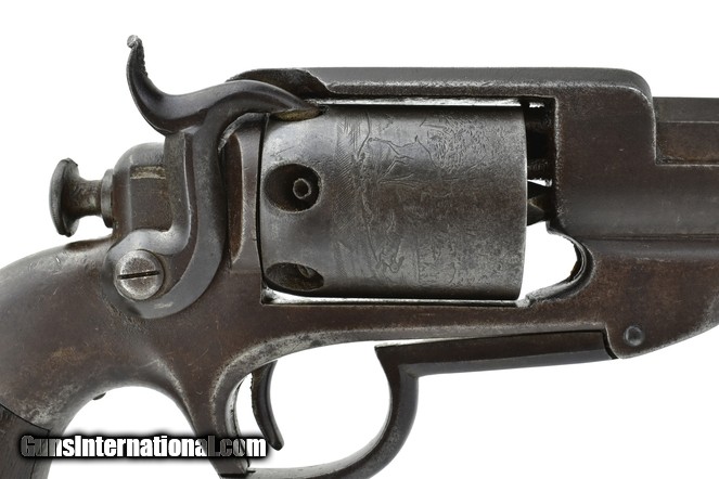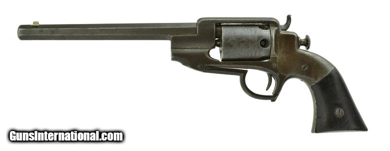 Description: Allen & Wheelock Side Hammer Navy Revolver with the desirable 8” barrel. .36 Caliber. Bore is very good. Action works perfectly. Gun has an even patina overall. Barrel markings are mostly clear and legible. Cylinder scene is excellent. Grips are about very good, no chips or cracks. This is a hard to find 8” Navy recently obtained from an old collection.