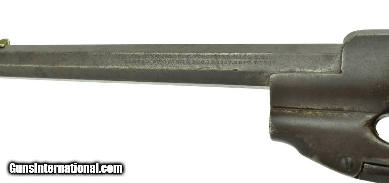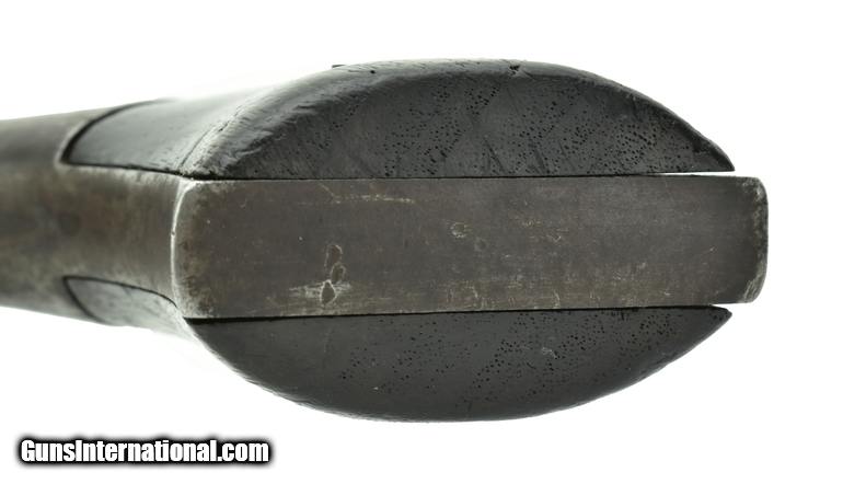Allen & Wheelock Side Hammer Navy Revolver with the desirable 8” barrel. .36 Caliber. Bore is very good. Action works perfectly. Gun has an even patina overall. Barrel markings are mostly clear and legible. Cylinder scene is excellent. Grips are about very good, no chips or cracks. This is a hard to find 8” Navy recently obtained from an old collection.