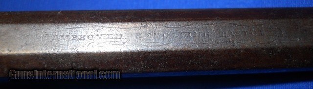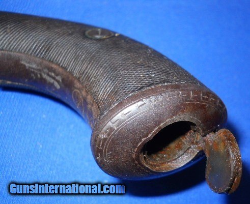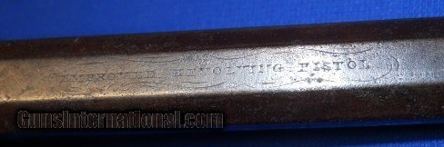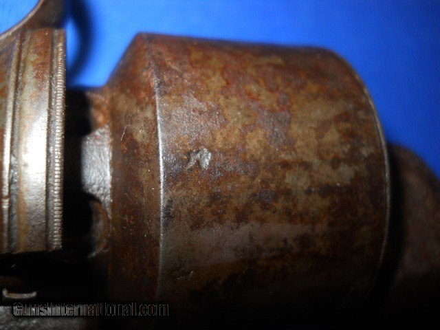 Description: ANTIQUE ENGLISH BIRMINGHAM PROOFED "IMPROVED REVOLVING PISTOL" SO MARKED. ABOUT 12" OVERALL WITH 5 5/8" OCTAGON BARREL SER. # 3. ORIGINAL AGED FINISHES A DARK BROWN PATINA HAVING ENGRAVING ON FRAME AND ELSEWHERE. ACTION FUNCTIONS WELL, CRISP, IN TIME WITH TIGHT CYLINDER LOCK-UP. CHECKERED WALNUT GRIPS FEATURING CAP BOX BUTT, SHOWING WEAR & USE, RIGHT PANEL HAS REPAIRED CRACK. A GOOD REASONABLY PRICED EXAMPLE FOR YOUR COLLECTION. ONE ORIGINAL NIPPLE & 6 REPLACEMENT NIPPLES THAT NEED FITTING INCLUDED, AS PICTURED. $20.00 S&H DIRECT TO BUYER ANYWHERE THAT'S OK. INTERNATIONAL S&H ADDITIONAL COST DEPENDING ON DESTINATION. SOLD Antique: Yes Handgun Caliber: .36 Model: IMPROVED REVOLVING PISTOL Serial Number: 3 Barrel Length: 5 5/8 Bore: GOOD Chambers: CLEAR Condition: GOOD AS PICTURED Metal Condition: AGED Wood Condition: WORN Bore Condition: DISTINCT RIFLING Barrel Type: OCTAGON Action: CRISP & TIGHT Triggers: SINGLE Stock: WALNUT CHECKERED Butt Pad: CAP BOX Finish: ORIGINAL AGED Weight: 2 lb Sights: FACTORY ORIGINAL Manufacture Date: 1850s ERA Proof:Black: ENGLISH |