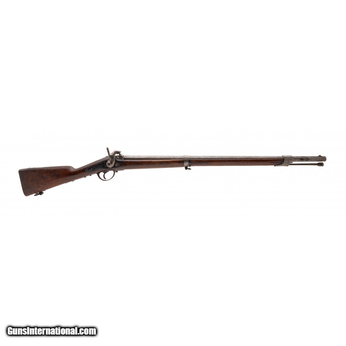 Description: " NSN, circa 1860's, .80 caliber, 34.25"" octagonal to round smooth bore barrel. Barrel and other iron parts are a light grey patina with scattered areas of oxidation visible. The rear sight has been removed, screw holes have been welded over and smooth out. Left side of the barrel is Liege stamped. Stock is good with expected handling wear, action holds at half and full cock. SOLD Antique: Yes |