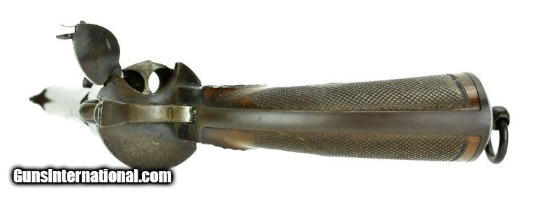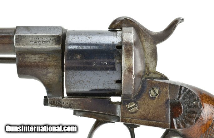 Description: "Lefaucheux Model 1854 Pattern Pinfire Revolver. Very fine gun with a smooth chocolate brown patina on barrel. The cylinder has a lot of blue, approximately 75%. Frame has blue in protected areas. Grips are excellent with nice sharp checkering. SOLD |