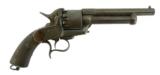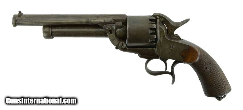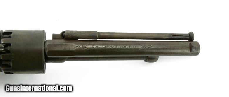 Description: Very Good Lemat Transitional Revolver. Smooth light brown patina throughout metal. This is a Parisian Lemat and is so marked on the top of the barrel. This is an early gun being serial number 421 and is all matching. This gun has the trigger guard spur making it a transitional model with the loading lever on the left hand side of the gun. The 1st Models had the loading lever on the right hand side of the gun. The loading lever is a well made replacement. SOLD Antique: Yes |