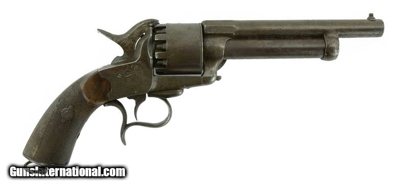Very Good Lemat Transitional Revolver. Smooth light brown patina throughout metal. This is a Parisian Lemat and is so marked on the top of the barrel. This is an early gun being serial number 421 and is all matching. This gun has the trigger guard spur making it a transitional model with the loading lever on the left hand side of the gun. The 1st Models had the loading lever on the right hand side of the gun. The loading lever is a well made replacement.