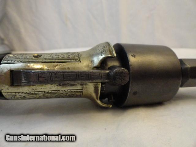 Description: Nice early example in .45 caliber purcusion revolver with 6" octagon barrel. English type with the bar hammer most commonly found on early pepper box type guns. Gun is silver plated and engraved including the butt. Barrel and cylinder retain most of the blue finish. Works like a fine clock. Checkered walnut stocks with light spider line split about half an inch but barely noticeable in the finely checkered stocks. This is a double action only revolver. Really super unusual pistol. Antique SOLD Antique: Yes |