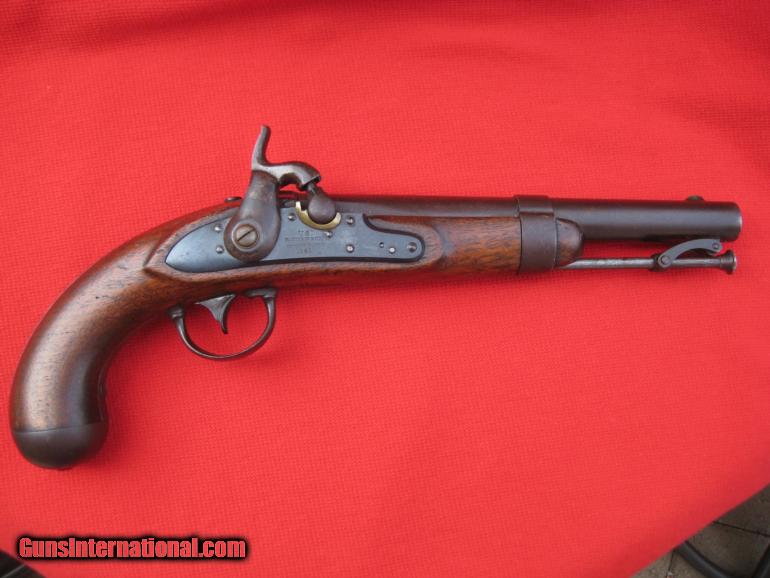 Drum type conversion of an 1836 flintlock martial pistol. Not US arsenal work and similar to many converted to percussion at the Fayetteville, NC works. Hammer shows that it has been heated and twisted to match added drum and nipple, a musket type. There is a black powder class for .54 cal. Astons, Johnsons and 1836 flint conversions.