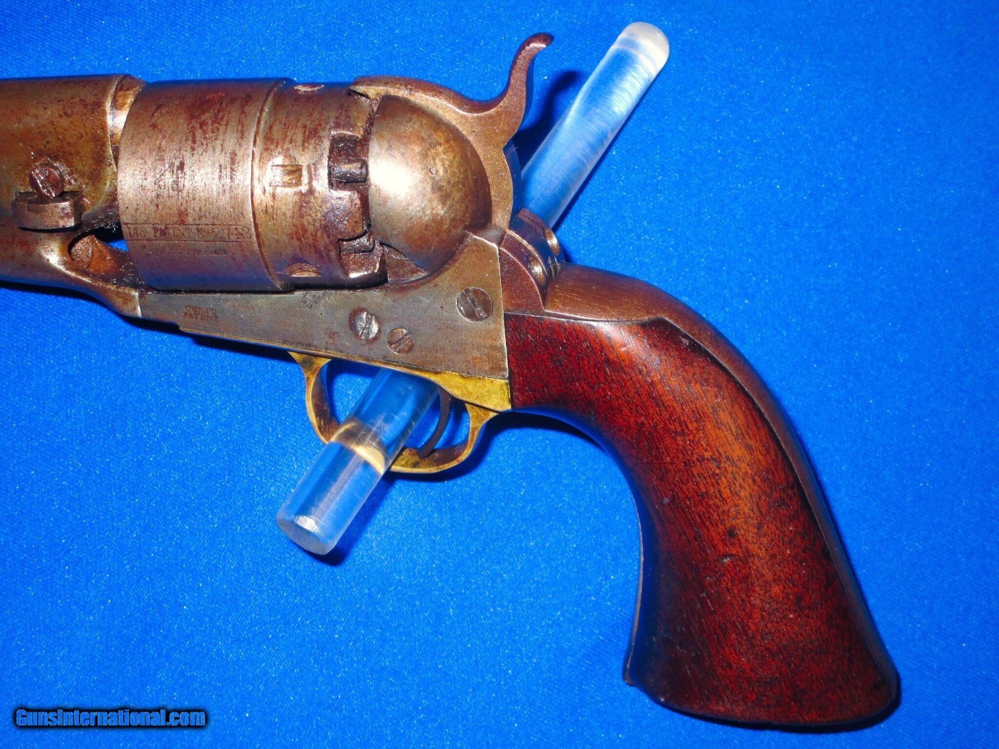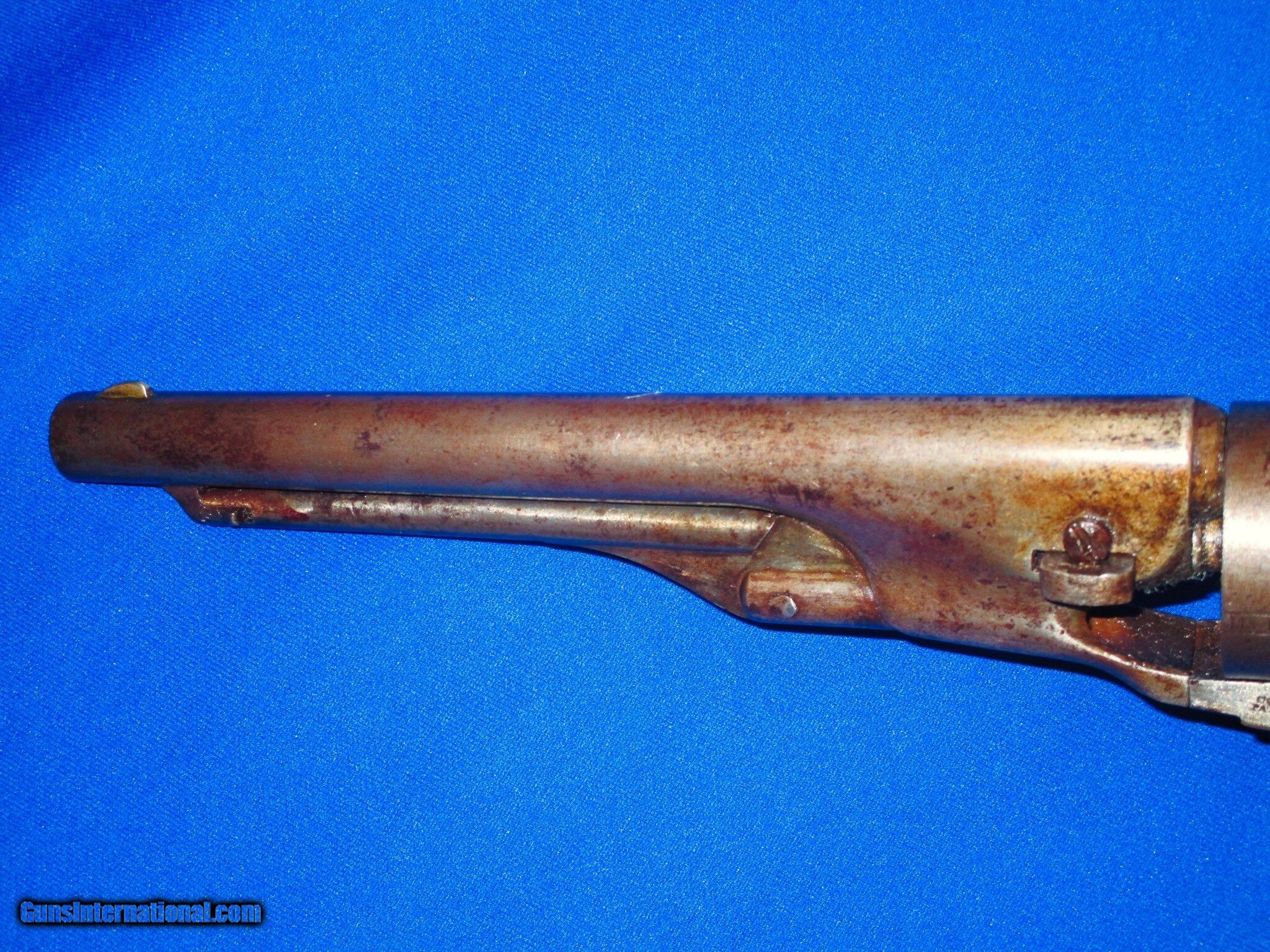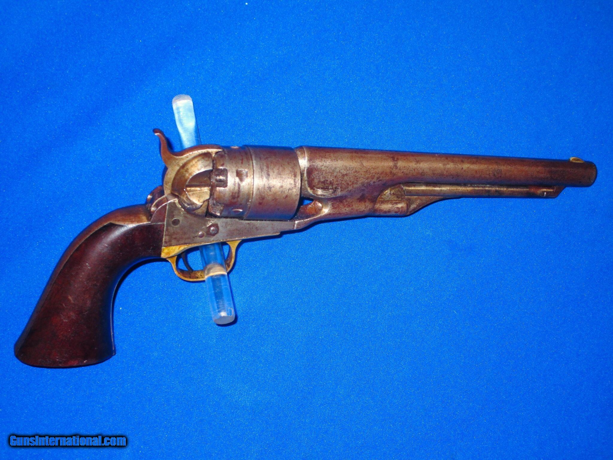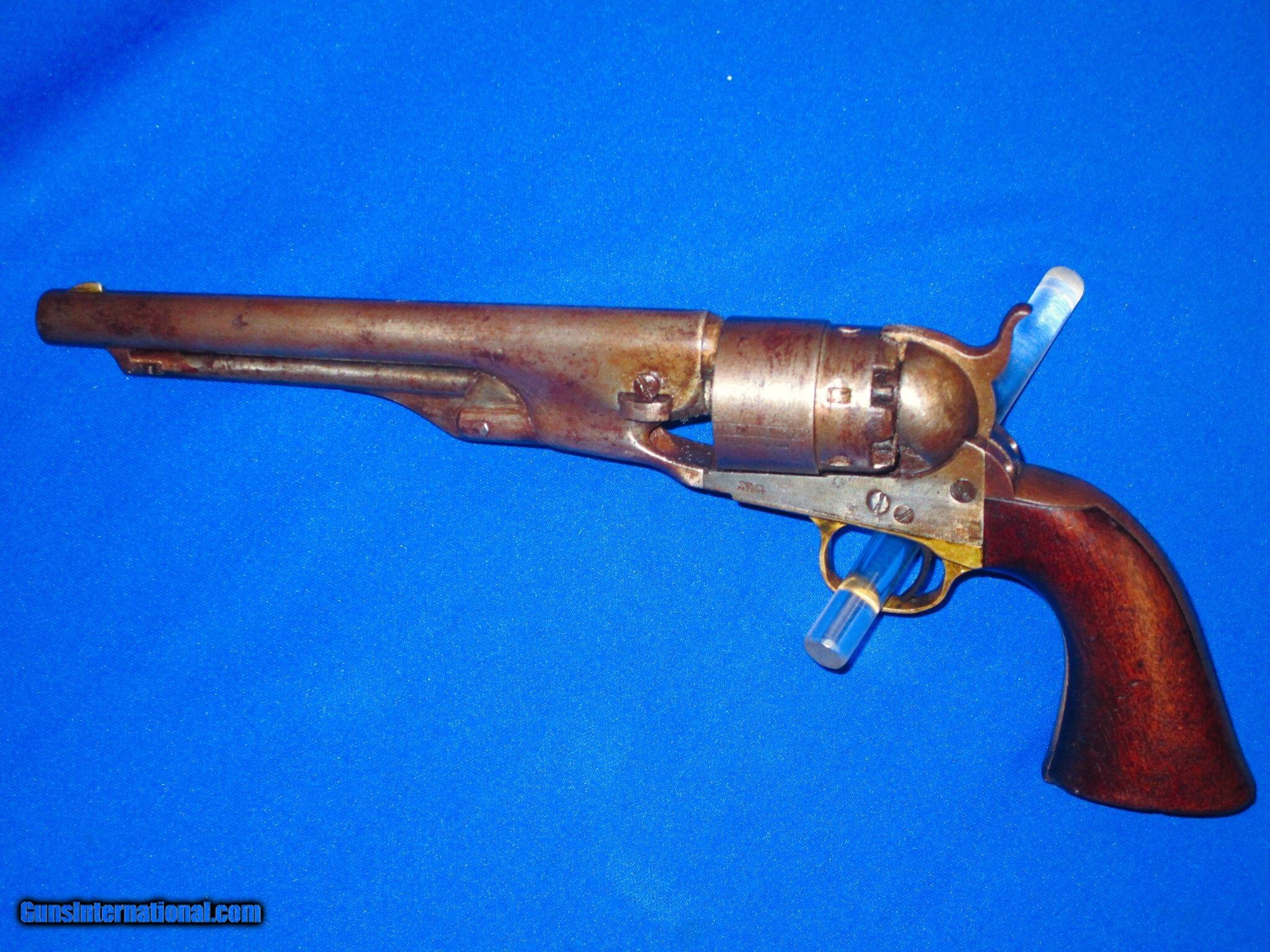 Description: A U.S. Civil War Military Issued Percussion Colt Model 1860 Army Revolver In Nice untouched Condition. Serial #62,742, all matching numbers. Made in 1862, all original and complete. The revolver has nice metal, markings, and edges. The cylinder scene is visible all the way around. It is fully U.S. Sub Inspected. All of the metal on the revolver has an untouched light to dark natural patina throughout it. All the screws are original and very good. The original grips are fine throughout and have clear U.S. Inspectors Cartouches on both sides. It has a very good, tight action and a good bore in it. This Is A Nice Untouched Example Of A U.S. Civil War Military Issued Percussion Colt Model 1860 Army Revolver. It Would Be A Fine Addition To Any Civil War Or Colt Collection! SOLD Antique: Yes Manufacturer: Colt Model: Model 1860 Army Serial Number: 62742 Condition: Nice untouched Condition Action: Single Manufacture Date: 1862 |