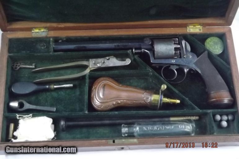 This is a licensed copy of the Deane & Adams. Is inscribed on the top rib "MANUF' BY ANCION & C LEIGE BY DEANE ADAMS & DEANE LONDON" . On the right frame side is inscribed "ADAMS PATENT NO 2096" with a 2096 inscribed on the cylinder. On the left frame side is stamped "ADAMS PATENT 1851". There is some very nice engraving on the frame, 7" barrel, and buttcap. This is a double action only gun with most all of the blue on the frame and barrel. It appears the cylinder was case hardened and still retains some of the colors but mostly faded to a grey. The Case is very nice and probably original to this gun. It includes percussion caps, oil bottle, cleaning rod, screwdriver, bullet mold, wads, and wad making punch.As always, we will entertain any legitimate offer, we love trades and are happy to do lay a ways at 30% down and balance in 90 days. We also are well informed on International Shipments and are registered dealers to ship to CA and welcome all of your business. If you are looking for something specific, please let us know as we get upwards of 50 new guns a month and will always buy guns, parts, memorbilia, Vintage Western holsters, collectable ammo, Old scopes and sights, grips, etc, etc. We attend many National shows and look forward to meeting with you at one of these venues.