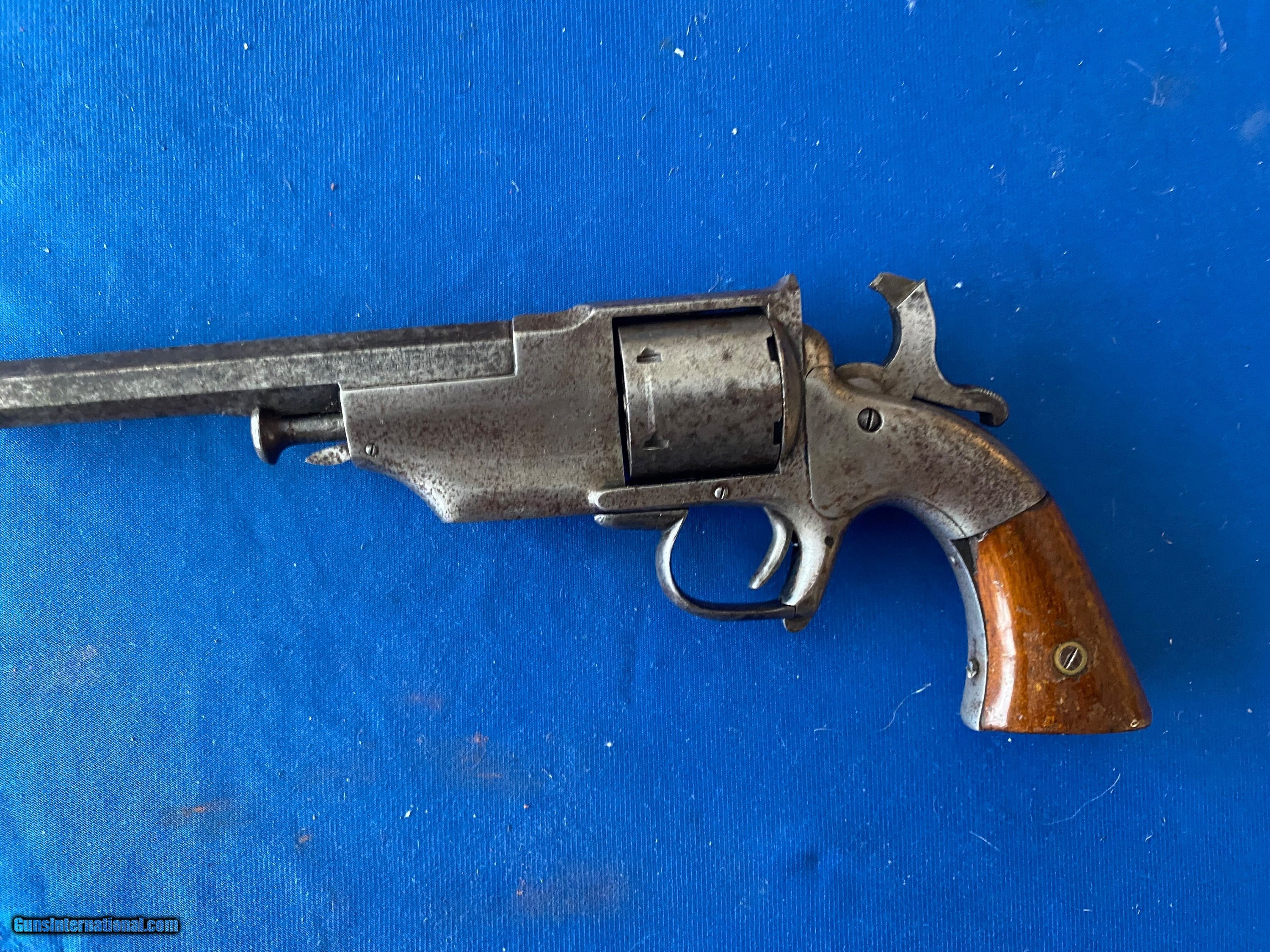 Description: This is one of the survivor of the five hundred lipfire Allen Revolvers production of which was stopped by legal action by Smith and Wesson regarding their Rolling White patent. This is a five shot 36CAL.with a six inch barrel in very good condition with a fine bore..The mechanical function is fine and the metal is smooth with no pitting or polishing.The black marks seem to be exaggerated by my lighting in the picture are not pitting,but stains they could be removed,but I leave guns as I find them. SOLD Antique: Yes |
