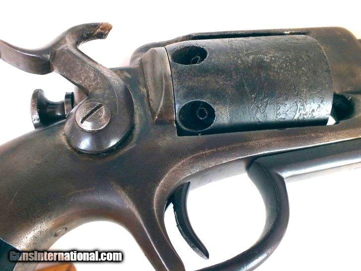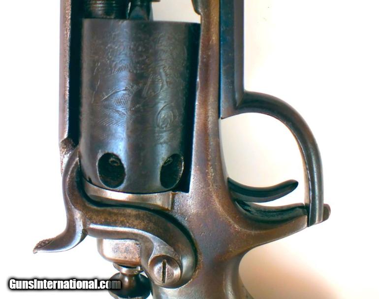 Description: ALLEN & WHEELOCK SIDEHAMMER NAVY REVOLVER: 36 Caliber Large Frame, (First photo shown for frame size difference)... 6 shot, with 7" Octagon barrel. Most collectors acknowledge this ALLEN , as a U.S. MARTIAL Percussion Revolver of the American Civil War. Many of these ended up in the hands of Union soldiers during the Civil War. See photo... Condition: Standard Model, The pistol functions extremely well... times and indexes perfectly. The cylinder rotates when the hammer is cocked and the trigger functions as it should. The half-cock notch also works correctly. The pistol is Mechanically Excellent. The Loading Lever functions correctly and smoothly,,, and operates exactly as it should. All of the SIX cones (nipples) appear Original and they are in Excellent, condition as well. The walnut grips rate about VERY GOOD with very light scratches and mars.. The revolver is mostly a SMOOTH PLUMB throughout, with only some small, scattered areas of minor peppering and pinpricking present on the Left side of the frame and barrel. The cylinder and triggerguard --loading lever have a similar matching patina..Most of the CYLINDER SCENE IS PRESENT . The hammer has a similar dark patina ... Good readable Markings. SOLD |