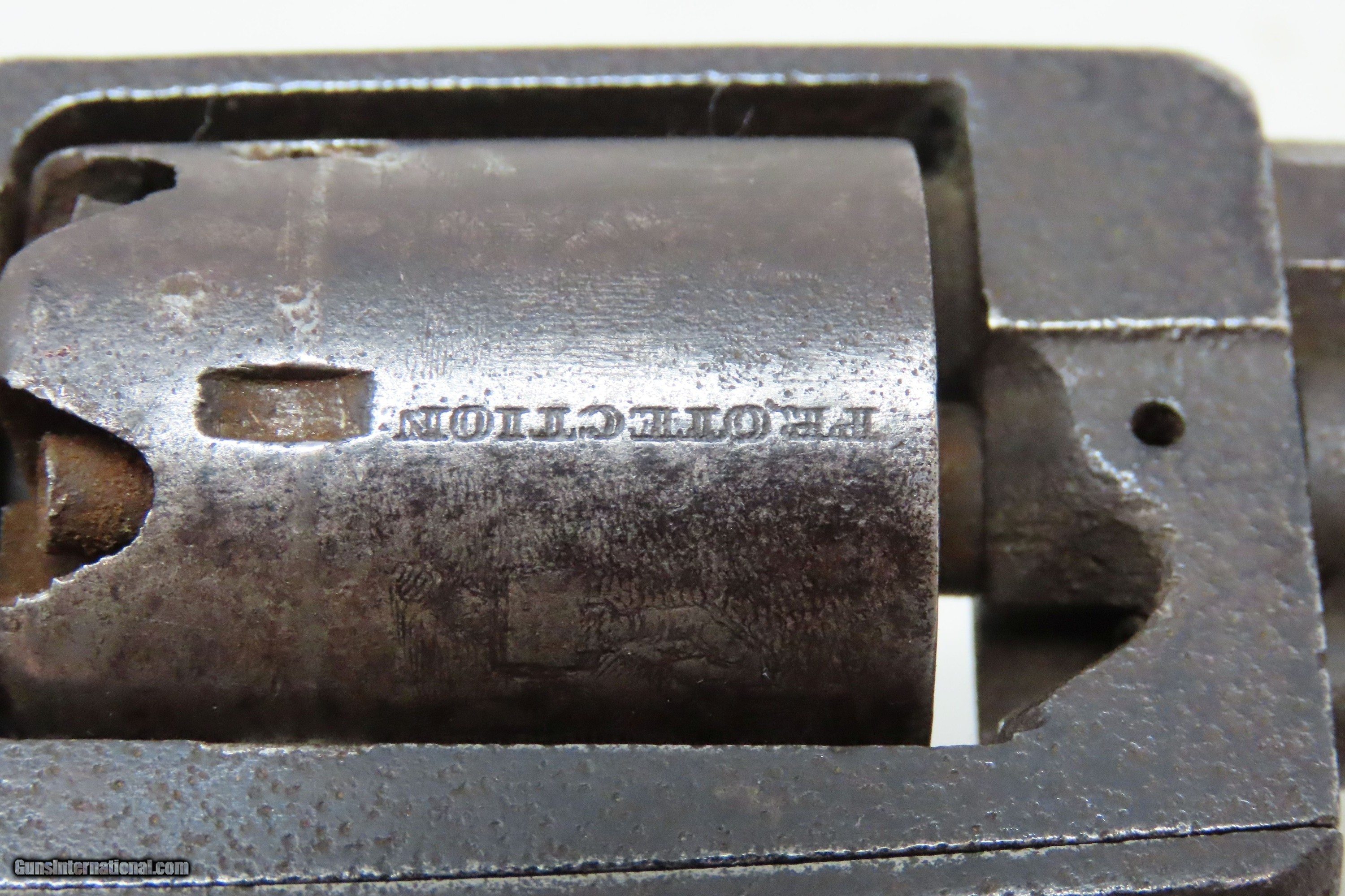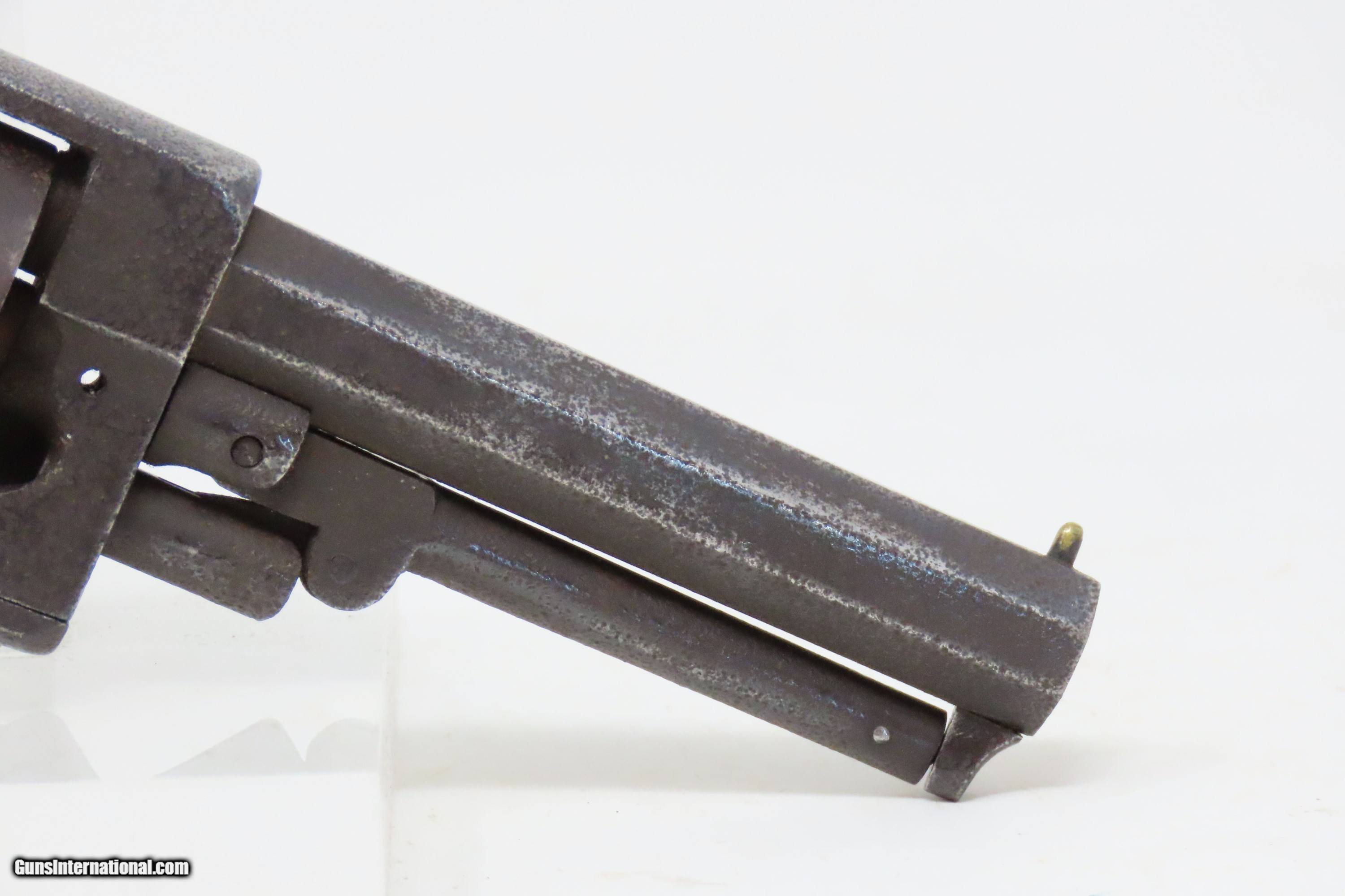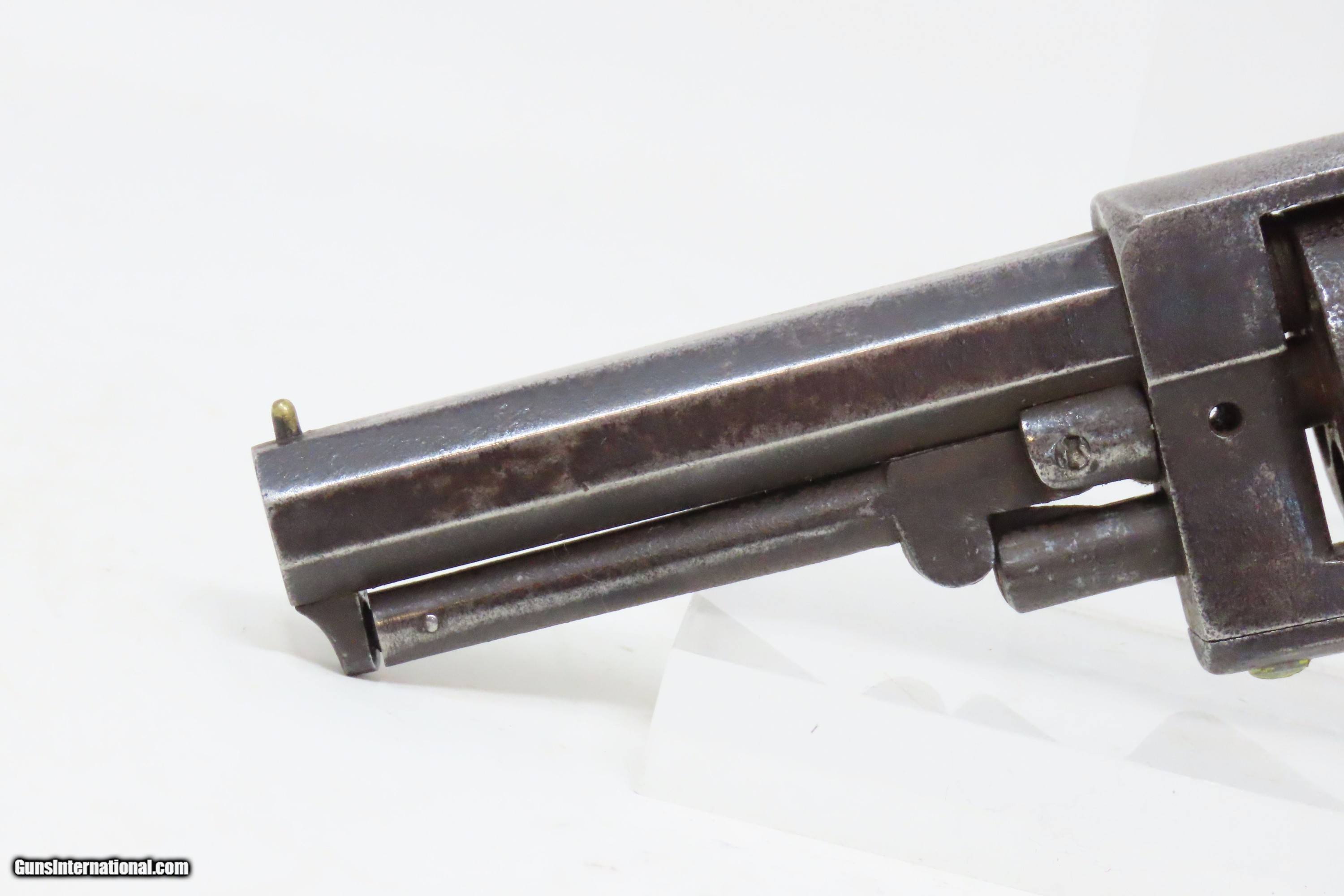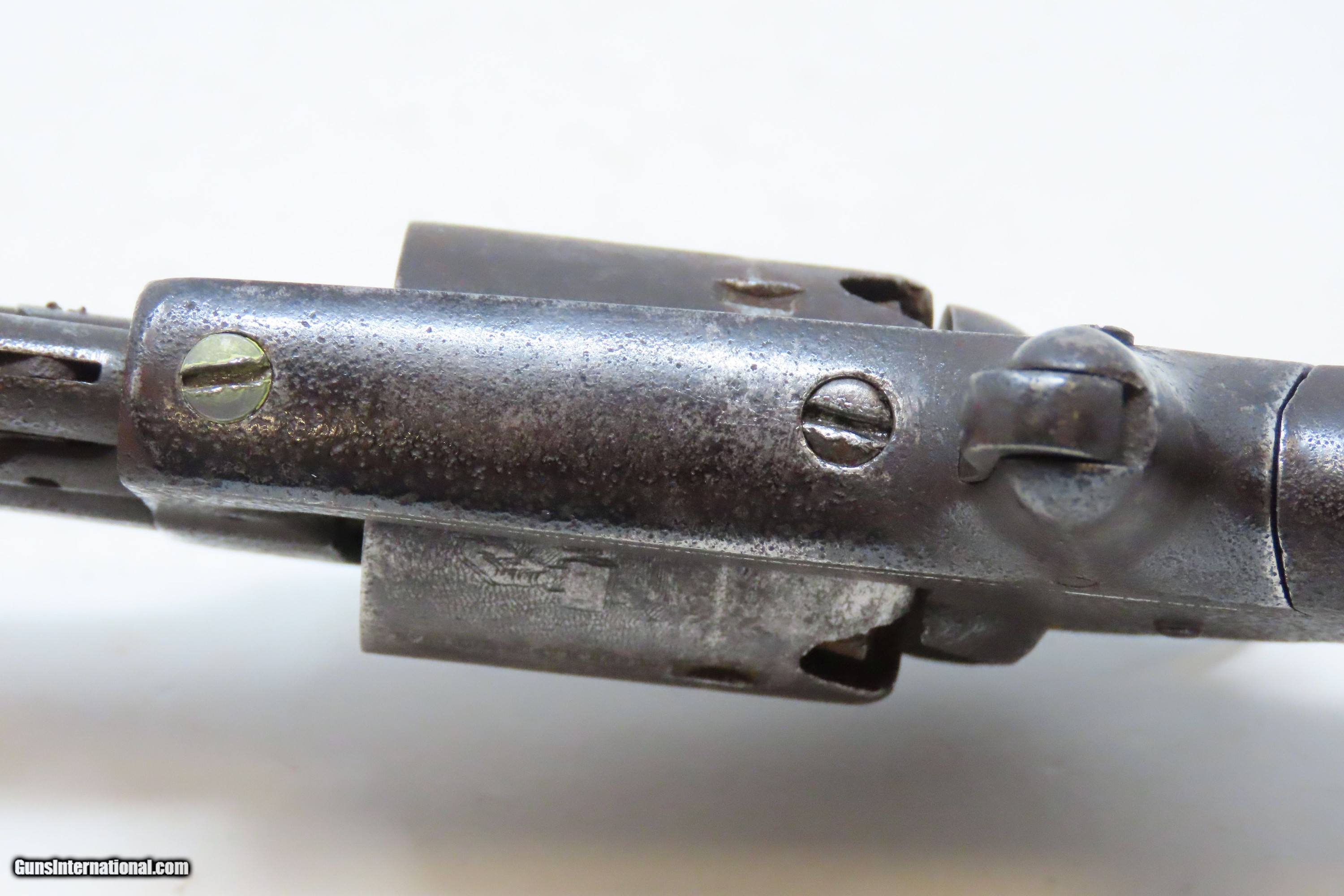 Description: Antique CIVIL WAR Era “PROTECTION” Marked .28 PERCUSSION Pocket Revolver Single Action .28 Caliber Spur Trigger Revolver Here we present an antique “Protection” Marked Percussion Spur Trigger Pocket Revolver, made circa 1857-58. According to Flayderman’s catalog on page 368 of the 9th Edition, the maker of this little self defense pistol is unknown, although some authorities attribute its production to Eli Whitney. These revolvers were made at the time when Colt’s master patents were expiring. Around 1,000 were manufactured in total. This little self-defense pistol would have been most at home in the pocket of anyone in a busy city like New York or Philadelphia during the tumultuous times of the mid-1800s. The “Pocket Pistol” name says it all. Men would carry them concealed in a waistcoat pocket and women would hide them in a hand muff. As mentioned, this was of course made primarily for self-defense, and very well would tell stories if it could. Much happened in the United States and abroad during this period. With six shots, a short barrel, and a small bore of .28 caliber, this revolver would have been very easy to conceal and would have been quite the shock for the ne’er do wells roaming the big city streets. Though worn on this example, the cylinder featured rolled engraving of a policeman, two burglars, and a traveler with two highwaymen. Though not primary military arms during the American Civil War, this style of handguns was commonly privately purchased by soldiers for use on the battlefield. Whether legend or fact, it is interesting to note something commonly read about pocket revolvers of the day, that while they could be used for self-defense against the enemy, many soldiers kept them on their person to defend themselves against an unwanted amputation in the primitive field hospitals that were notorious, even in their day. The overall condition is good. Dark patina throughout. Part of the cylinder scene remains visible and shows a man holding a case or a bag and pointing a handgun, it is marked “PROTECTION” beside him. The action of the hammer and trigger are strong. The cylinder does not lock up. The bore is dim with strong rifling. Grips show use and remain solid. Own the original! This is a legitimate antique and not a reproduction. Barrel is 3-1/4 inches. Caliber: .28 Percussion Overall condition as seen in photos. Very Fast. Very Safe. FREE SHIPPING WORLDWIDE. Delivered directly to your door by express mail! Guaranteed AUTHENTIC & Includes CERTIFICATE OF AUTHENTICITY. ancestryguns $1200 #240272 SOLD Antique: Yes |