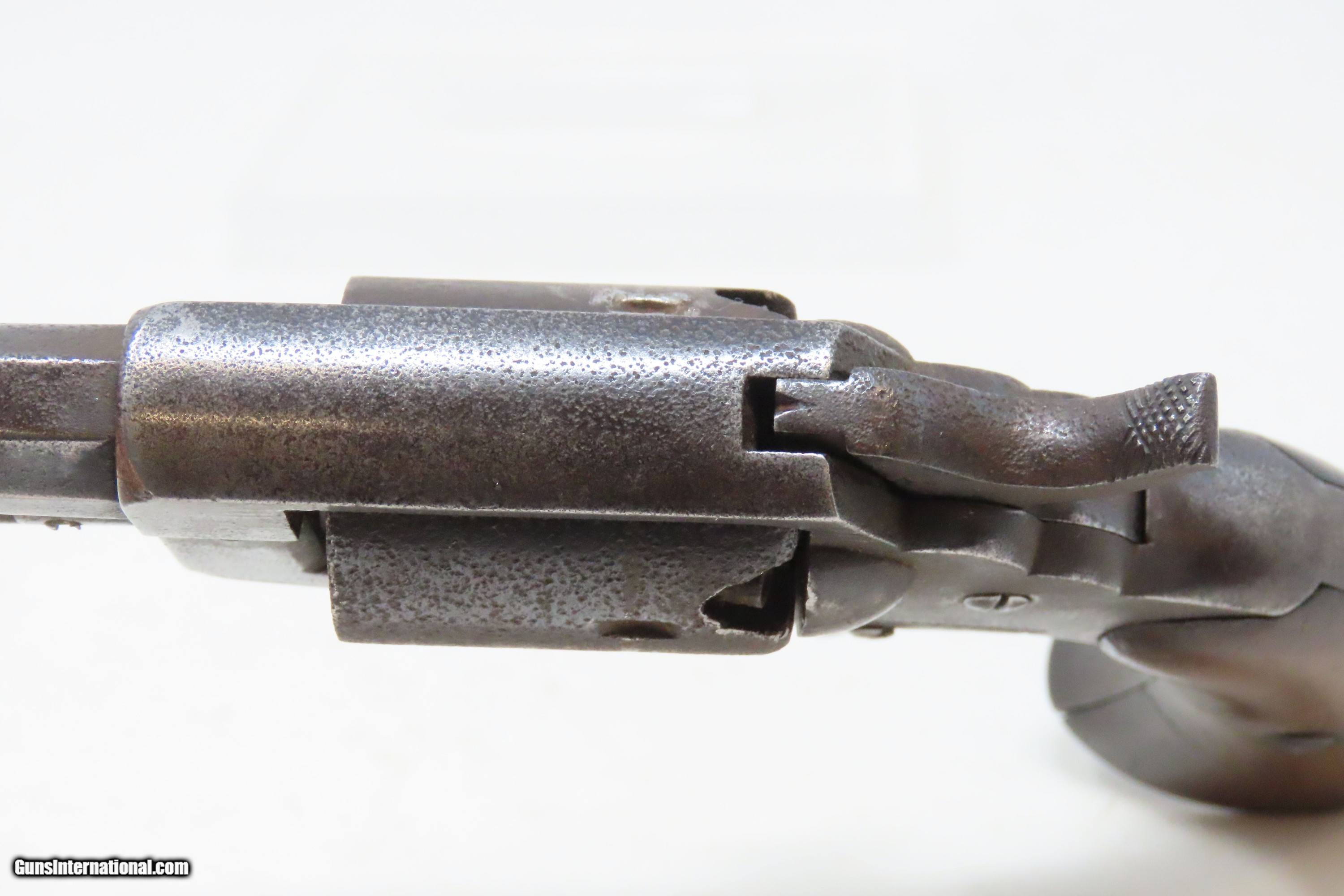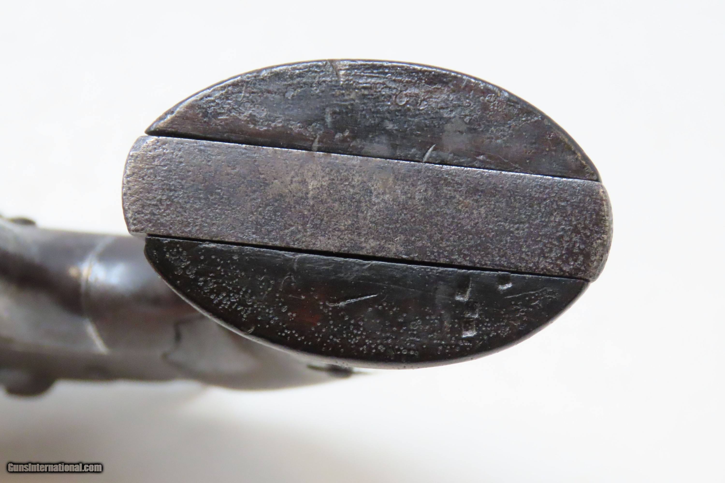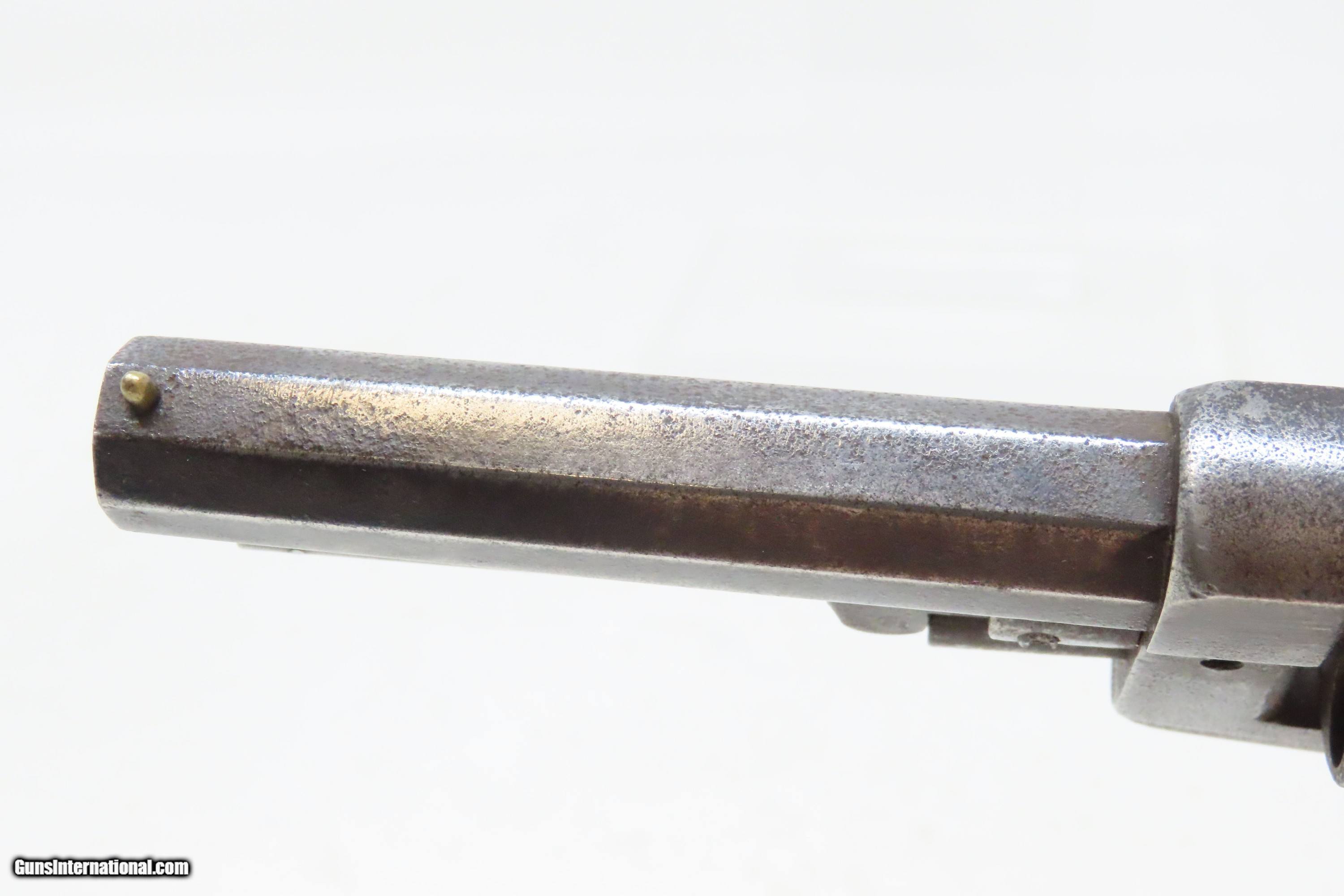 Description: Antique CIVIL WAR Era “PROTECTION” Marked .28 PERCUSSION Pocket Revolver Single Action .28 Caliber Spur Trigger Revolver Here we present an antique “Protection” Marked Percussion Spur Trigger Pocket Revolver, made circa 1857-58. According to Flayderman’s catalog on page 368 of the 9th Edition, the maker of this little self defense pistol is unknown, although some authorities attribute its production to Eli Whitney. These revolvers were made at the time when Colt’s master patents were expiring. Around 1,000 were manufactured in total. This little self-defense pistol would have been most at home in the pocket of anyone in a busy city like New York or Philadelphia during the tumultuous times of the mid-1800s. The “Pocket Pistol” name says it all. Men would carry them concealed in a waistcoat pocket and women would hide them in a hand muff. As mentioned, this was of course made primarily for self-defense, and very well would tell stories if it could. Much happened in the United States and abroad during this period. With six shots, a short barrel, and a small bore of .28 caliber, this revolver would have been very easy to conceal and would have been quite the shock for the ne’er do wells roaming the big city streets. Though worn on this example, the cylinder featured rolled engraving of a policeman, two burglars, and a traveler with two highwaymen. Though not primary military arms during the American Civil War, this style of handguns was commonly privately purchased by soldiers for use on the battlefield. Whether legend or fact, it is interesting to note something commonly read about pocket revolvers of the day, that while they could be used for self-defense against the enemy, many soldiers kept them on their person to defend themselves against an unwanted amputation in the primitive field hospitals that were notorious, even in their day. The overall condition is good. Dark patina throughout. Part of the cylinder scene remains visible and shows a man holding a case or a bag and pointing a handgun, it is marked “PROTECTION” beside him. The action of the hammer and trigger are strong. The cylinder does not lock up. The bore is dim with strong rifling. Grips show use and remain solid. Own the original! This is a legitimate antique and not a reproduction. Barrel is 3-1/4 inches. Caliber: .28 Percussion Overall condition as seen in photos. Very Fast. Very Safe. FREE SHIPPING WORLDWIDE. Delivered directly to your door by express mail! Guaranteed AUTHENTIC & Includes CERTIFICATE OF AUTHENTICITY. ancestryguns $1200 #240272 SOLD Antique: Yes |
