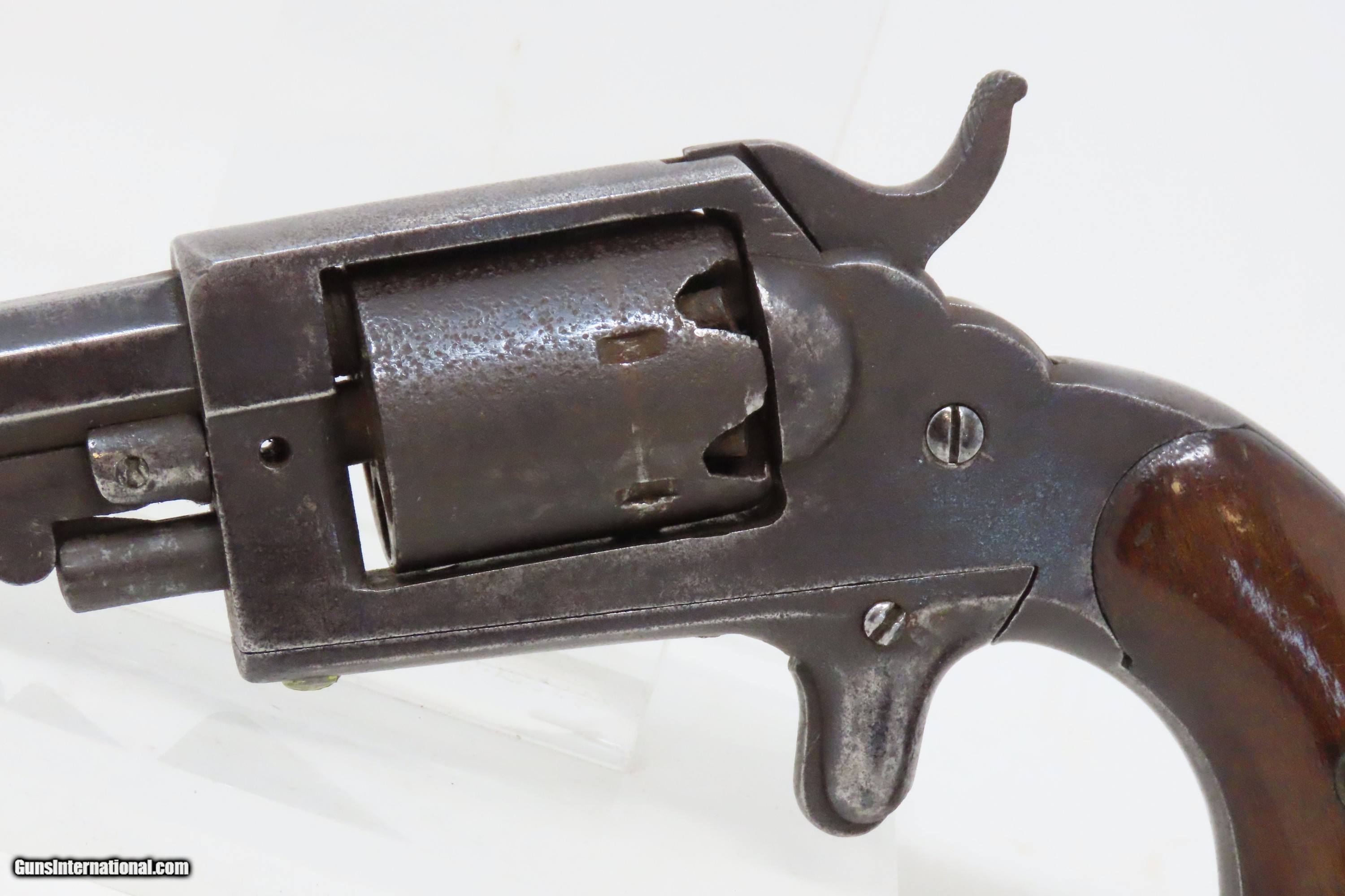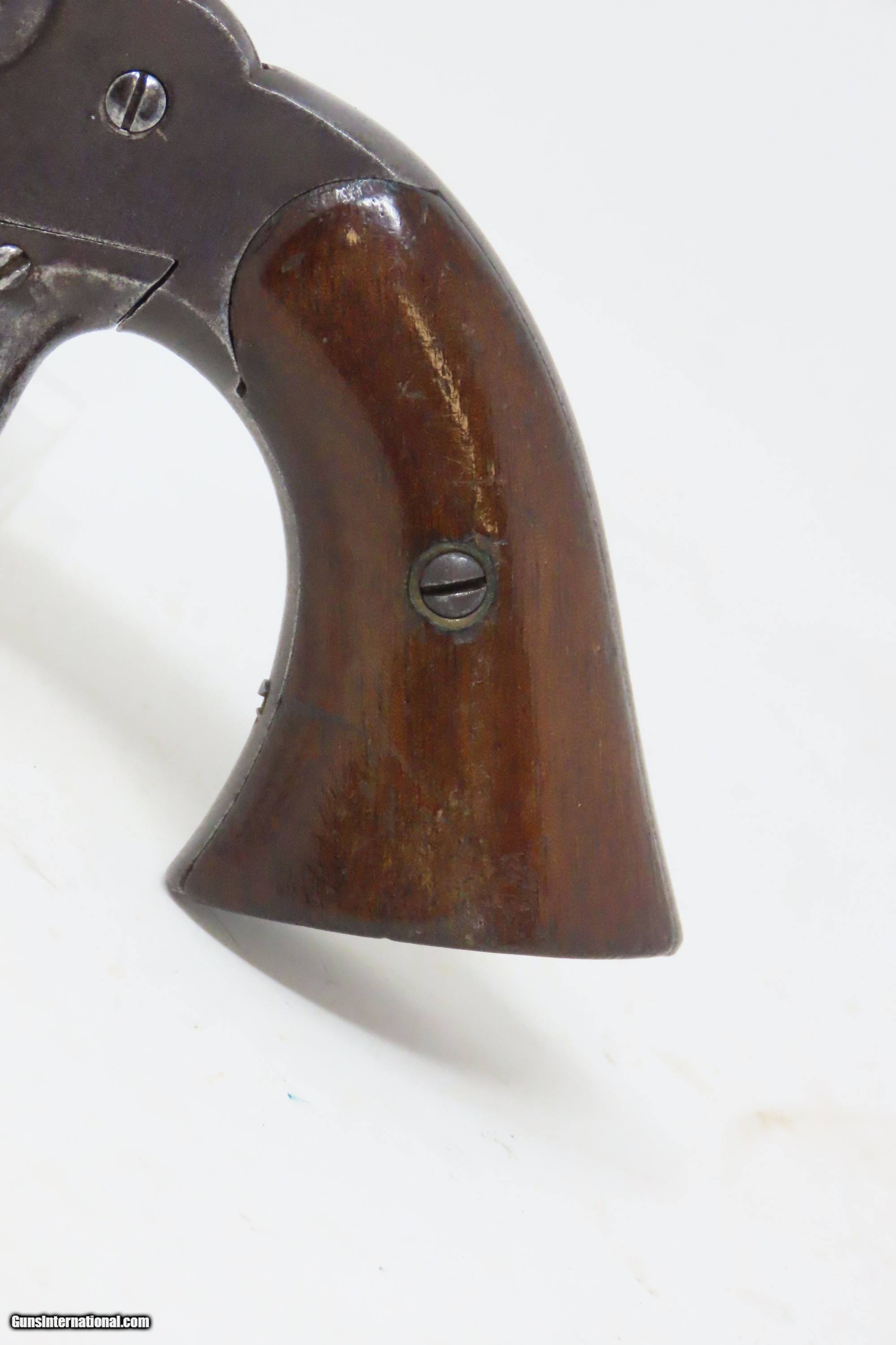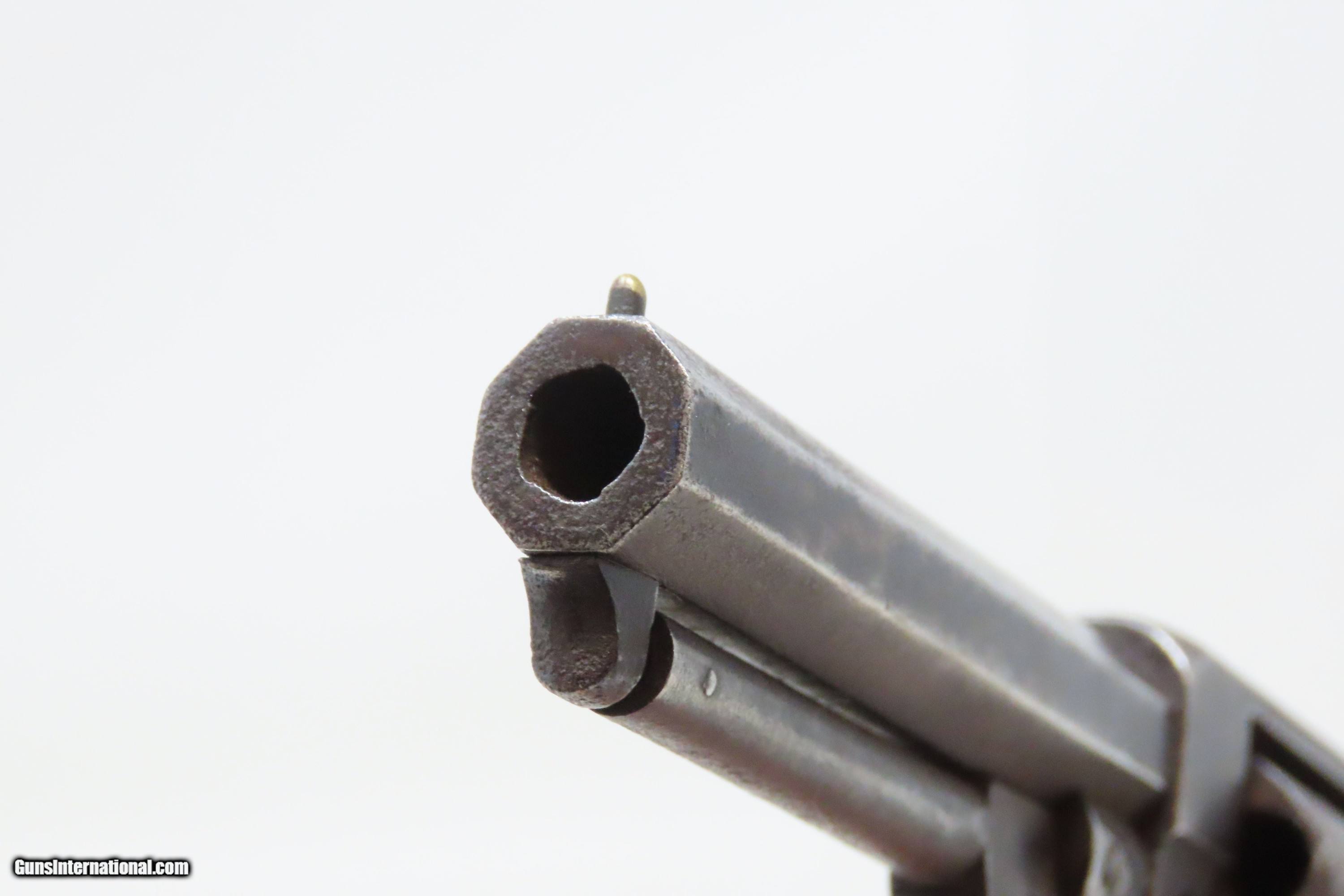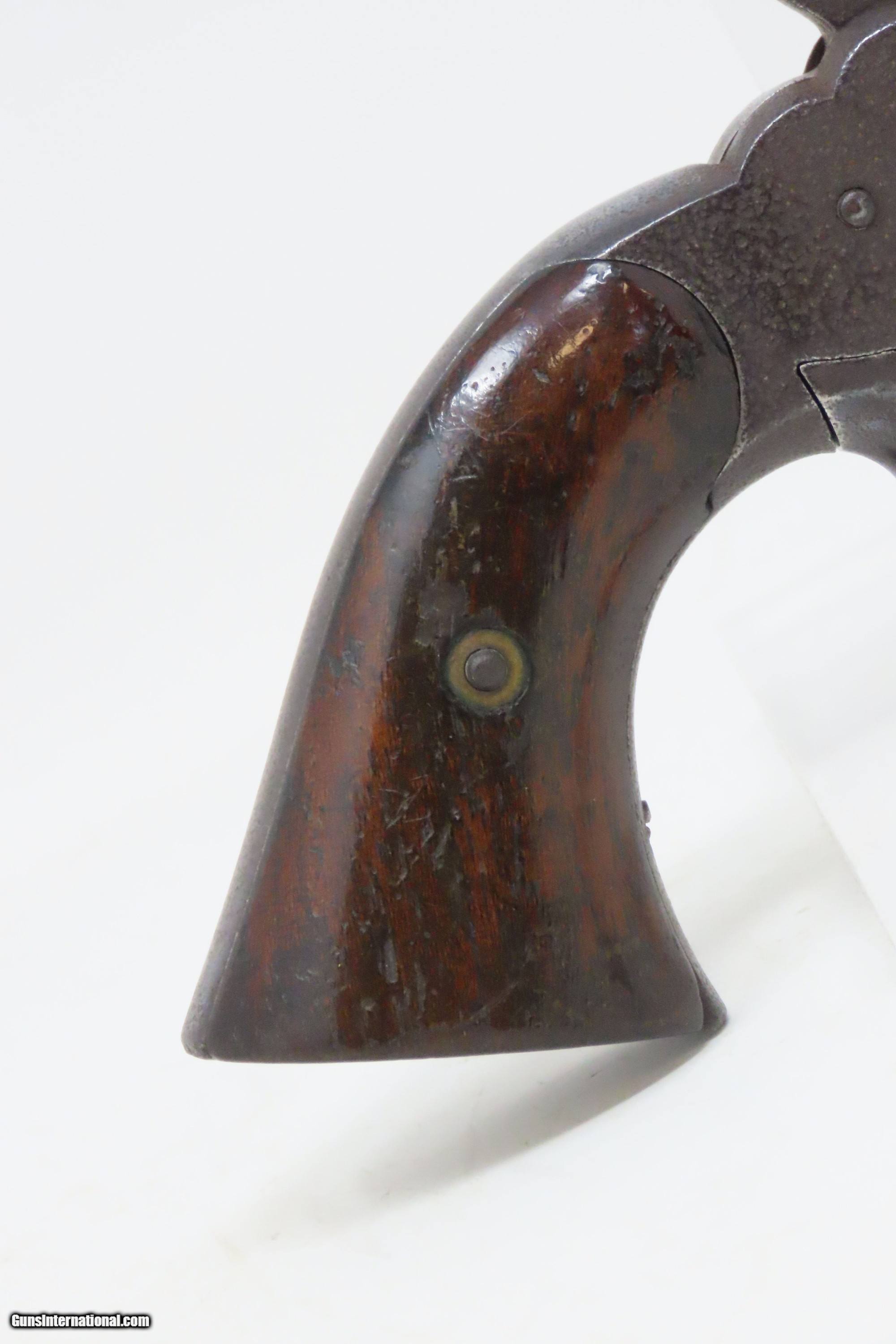 Description: Antique CIVIL WAR Era “PROTECTION” Marked .28 PERCUSSION Pocket Revolver Single Action .28 Caliber Spur Trigger Revolver Here we present an antique “Protection” Marked Percussion Spur Trigger Pocket Revolver, made circa 1857-58. According to Flayderman’s catalog on page 368 of the 9th Edition, the maker of this little self defense pistol is unknown, although some authorities attribute its production to Eli Whitney. These revolvers were made at the time when Colt’s master patents were expiring. Around 1,000 were manufactured in total. This little self-defense pistol would have been most at home in the pocket of anyone in a busy city like New York or Philadelphia during the tumultuous times of the mid-1800s. The “Pocket Pistol” name says it all. Men would carry them concealed in a waistcoat pocket and women would hide them in a hand muff. As mentioned, this was of course made primarily for self-defense, and very well would tell stories if it could. Much happened in the United States and abroad during this period. With six shots, a short barrel, and a small bore of .28 caliber, this revolver would have been very easy to conceal and would have been quite the shock for the ne’er do wells roaming the big city streets. Though worn on this example, the cylinder featured rolled engraving of a policeman, two burglars, and a traveler with two highwaymen. Though not primary military arms during the American Civil War, this style of handguns was commonly privately purchased by soldiers for use on the battlefield. Whether legend or fact, it is interesting to note something commonly read about pocket revolvers of the day, that while they could be used for self-defense against the enemy, many soldiers kept them on their person to defend themselves against an unwanted amputation in the primitive field hospitals that were notorious, even in their day. The overall condition is good. Dark patina throughout. Part of the cylinder scene remains visible and shows a man holding a case or a bag and pointing a handgun, it is marked “PROTECTION” beside him. The action of the hammer and trigger are strong. The cylinder does not lock up. The bore is dim with strong rifling. Grips show use and remain solid. Own the original! This is a legitimate antique and not a reproduction. Barrel is 3-1/4 inches. Caliber: .28 Percussion Overall condition as seen in photos. Very Fast. Very Safe. FREE SHIPPING WORLDWIDE. Delivered directly to your door by express mail! Guaranteed AUTHENTIC & Includes CERTIFICATE OF AUTHENTICITY. ancestryguns $1200 #240272 SOLD Antique: Yes |