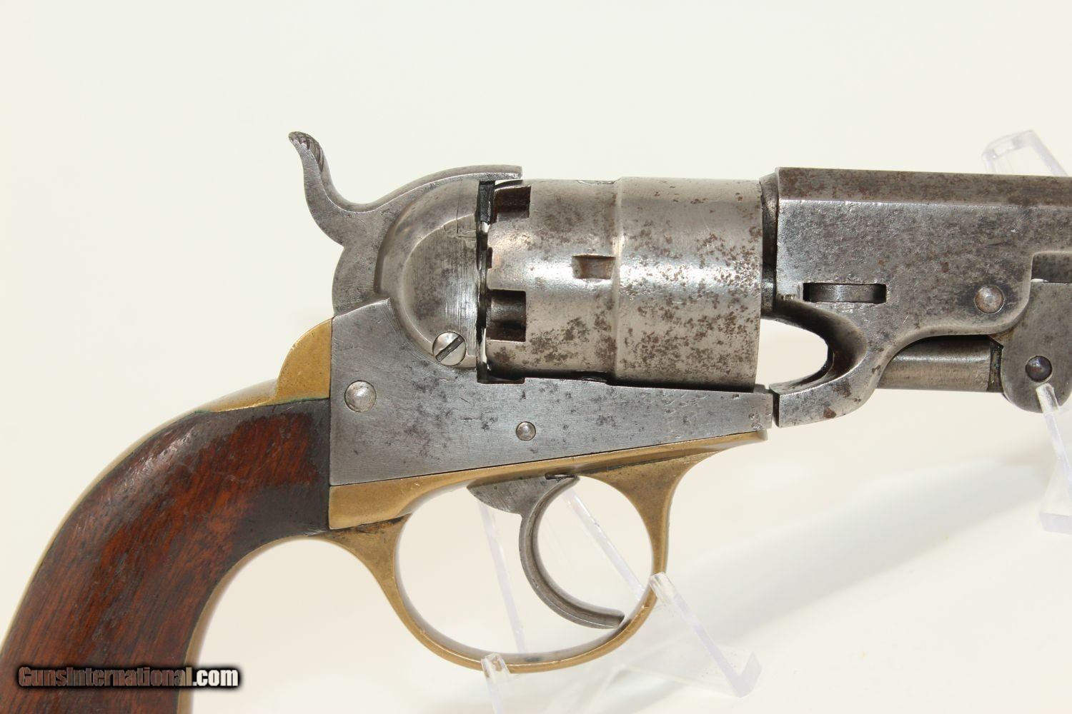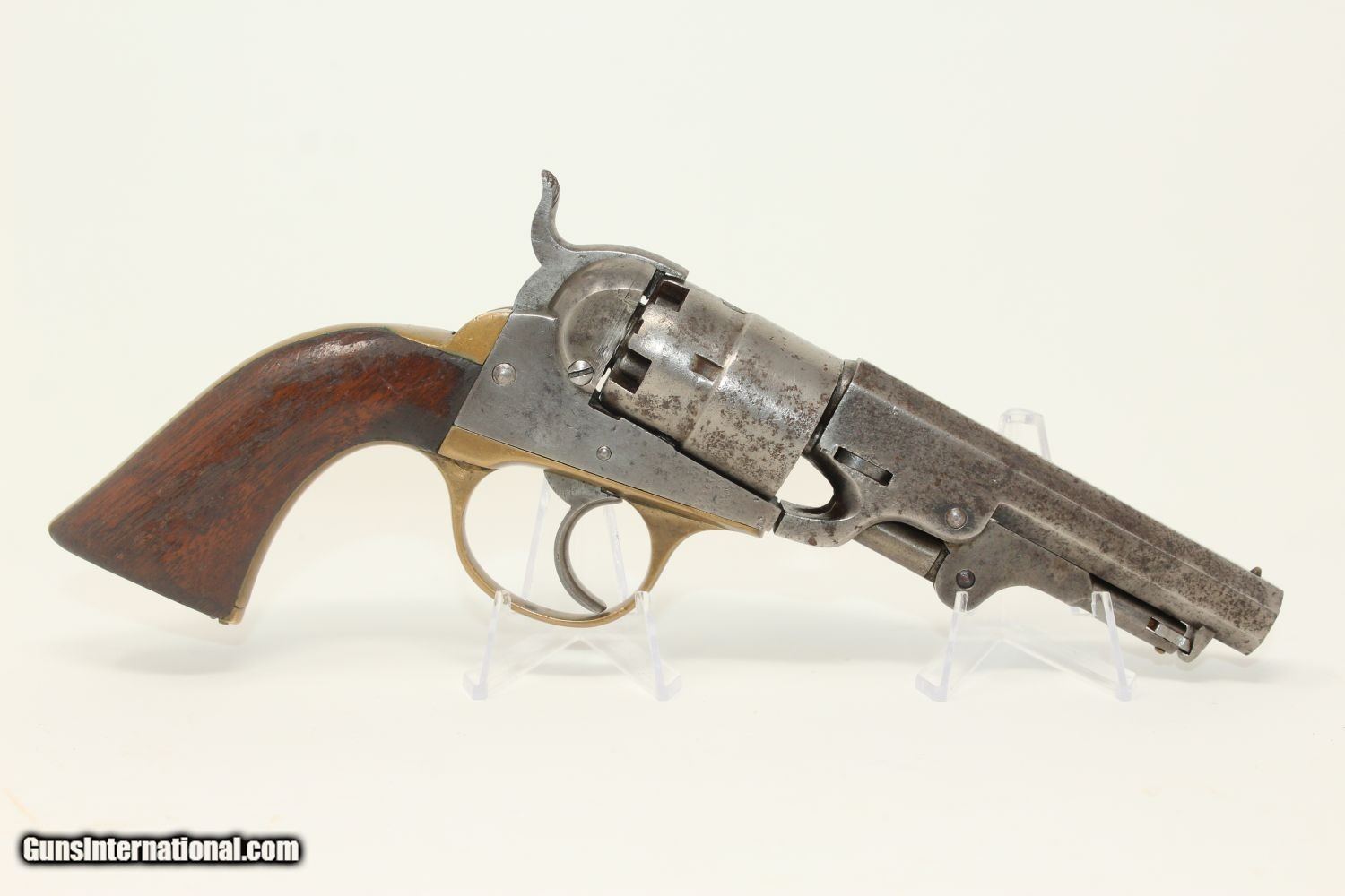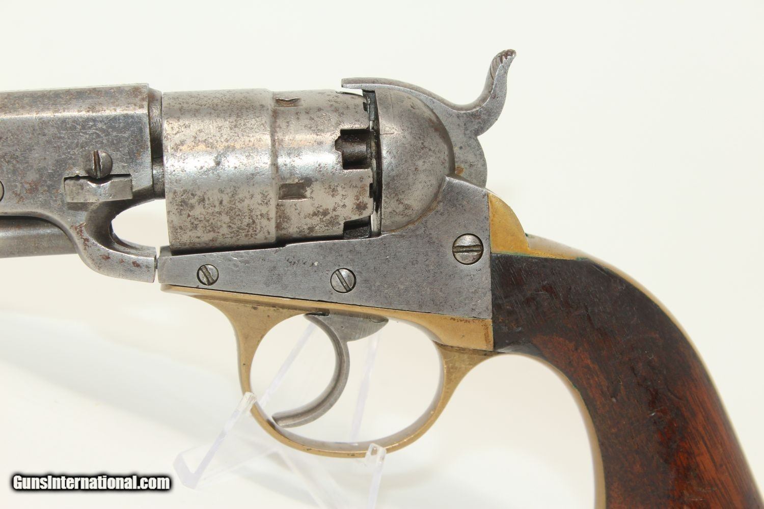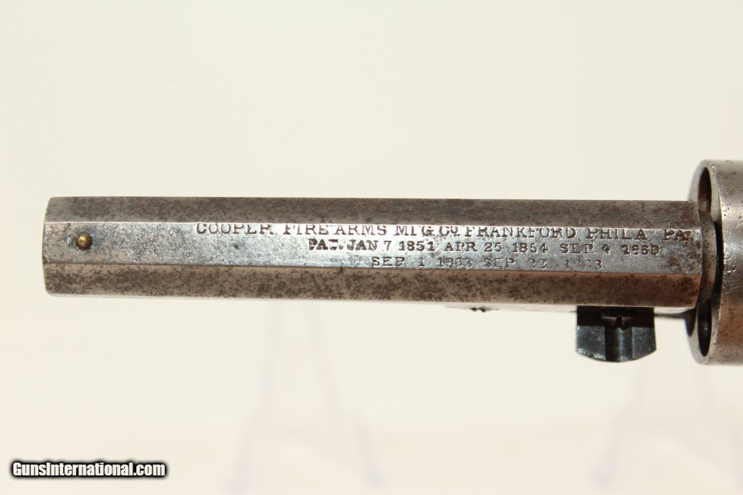 Description: Antique COOPER Double Action NAVY Revolver 1860s Double Action Answer to Colt’s 1849 Pocket! Here we present an antique J.M. Cooper Double Action Navy Revolver, made circa 1867 in Philadelphia, Pennsylvania. During a time of rapid innovation in firearms technology and an insatiable market due to rapid expansion and the American Civil War, dozens of makers seized their opportunity to put their ideas on the market. The J.M. Cooper Double Action Revolver took the concept of the Colt 1849 Pocket Model and improved it by giving it a double action firing mechanism, resulting in their own “Pocket” model. This is an example of a slightly larger, .36 caliber revolver. Only about 15,000 of these Navy caliber Models were made from 1864 to 1869. The overall condition is fair. The iron parts have a light gray patina. The markings are clear. The grips are in good shape. The bore is in very good condition with nice rifling. The forcing cone has been taken down a bit. The action of the revolver is not functional. The hammer is currently locked in place. Own the original! This is a legitimate antique and not a reproduction. Barrel is 4 inches. Caliber: .36 Percussion Overall condition as seen in photos. Very Fast. Very Safe. FREE SHIPPING WORLDWIDE. Delivered directly to your door by express mail! Guaranteed AUTHENTIC & Includes CERTIFICATE OF AUTHENTICITY. ancestryguns $800 #190772 SOLD Antique: Yes |