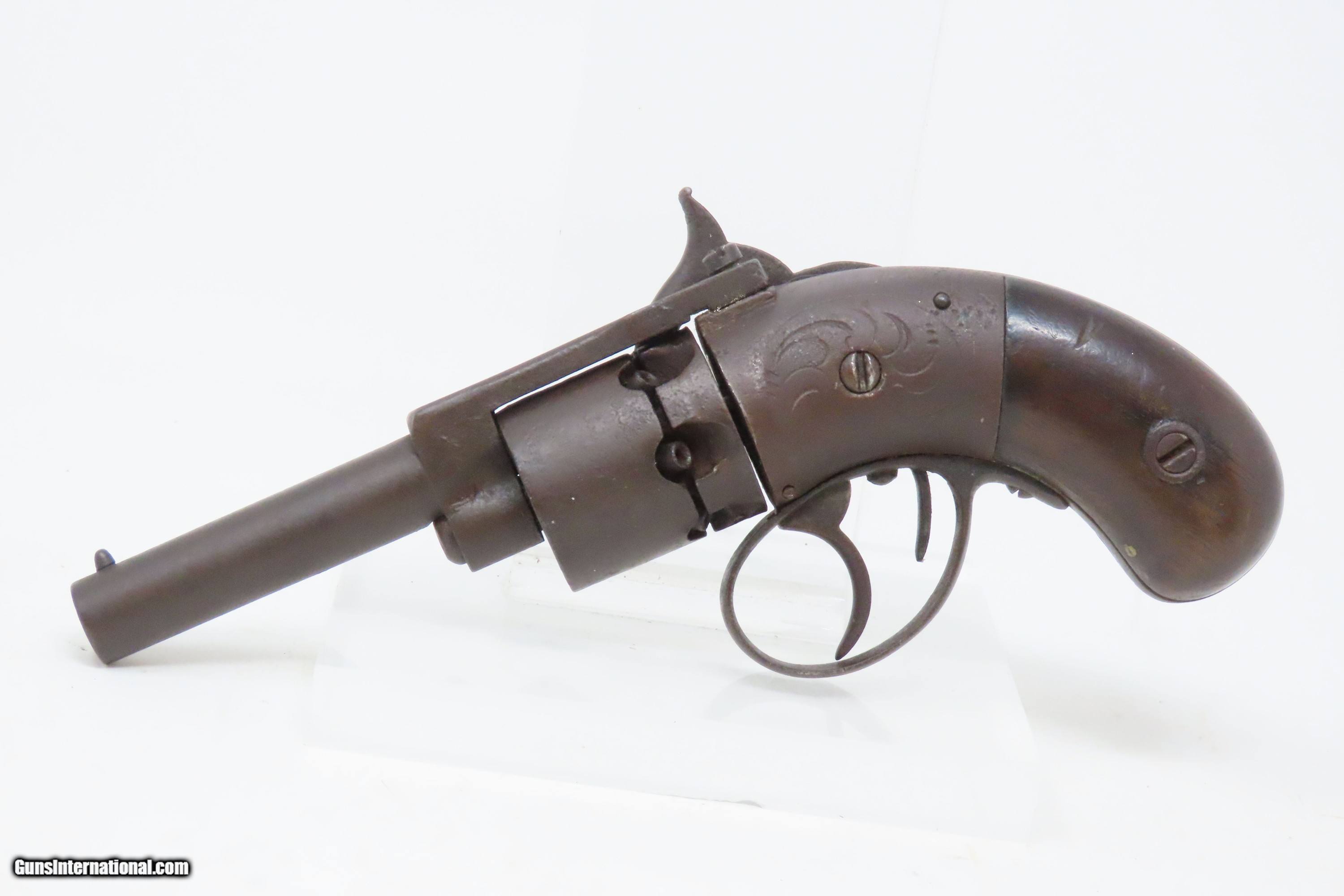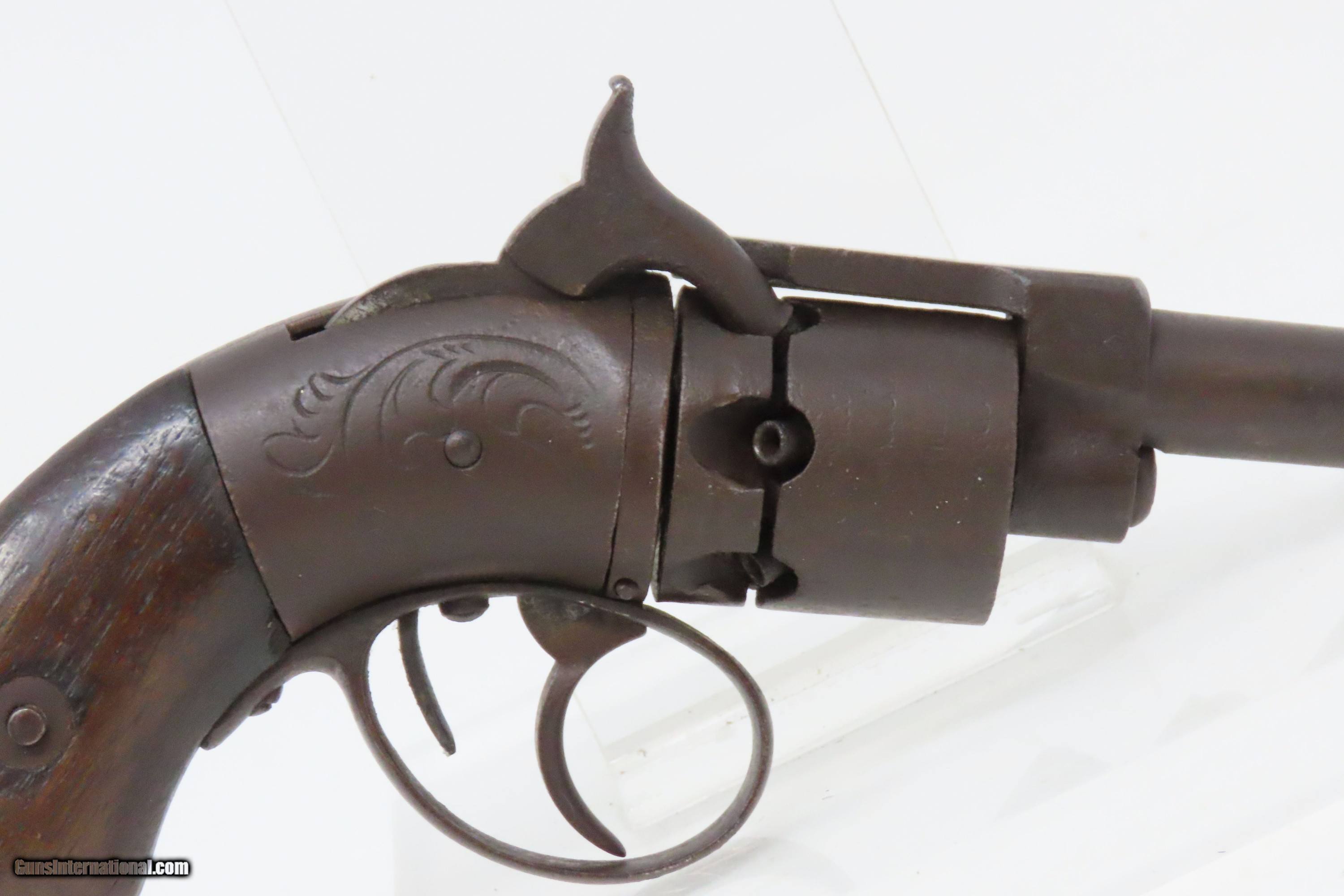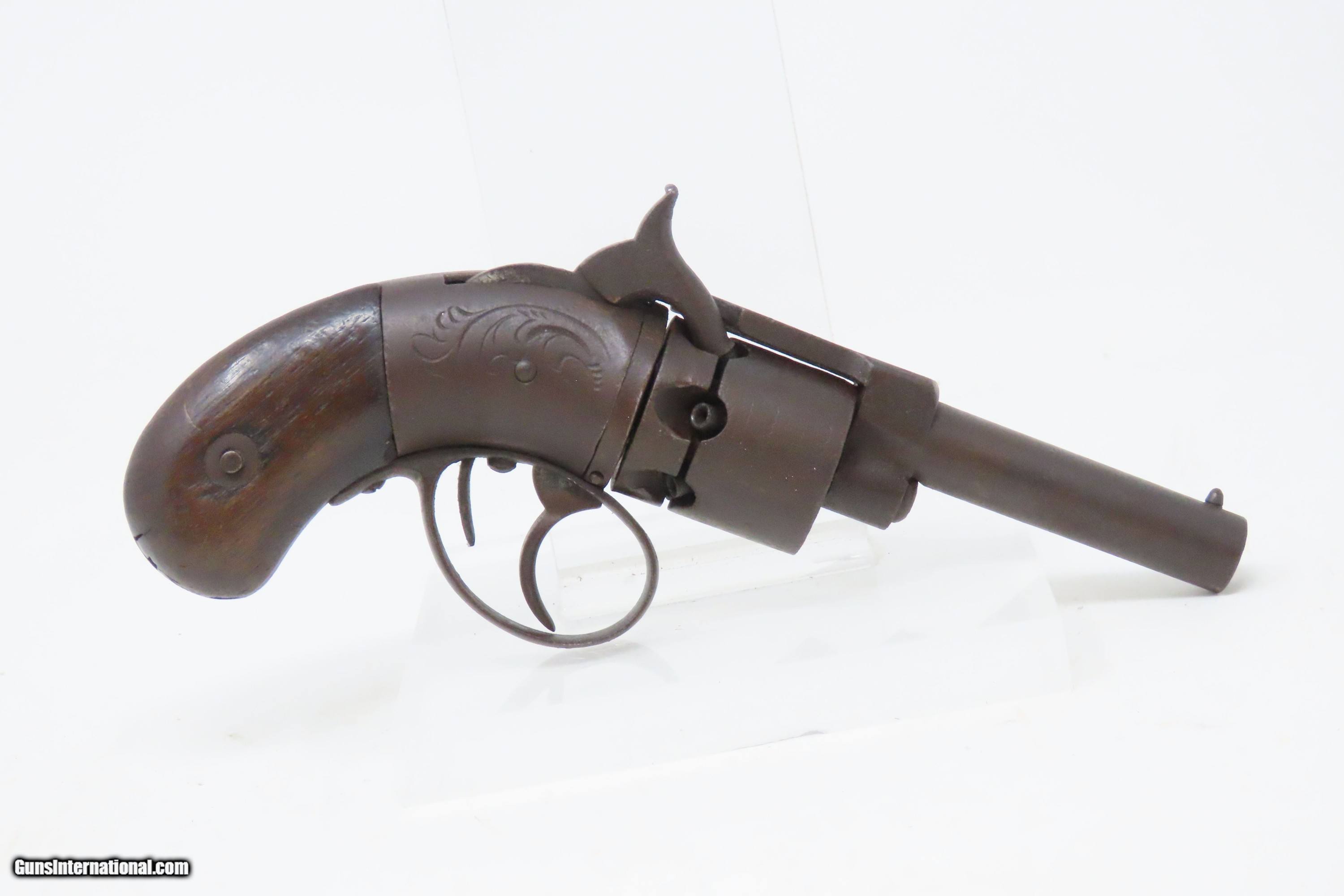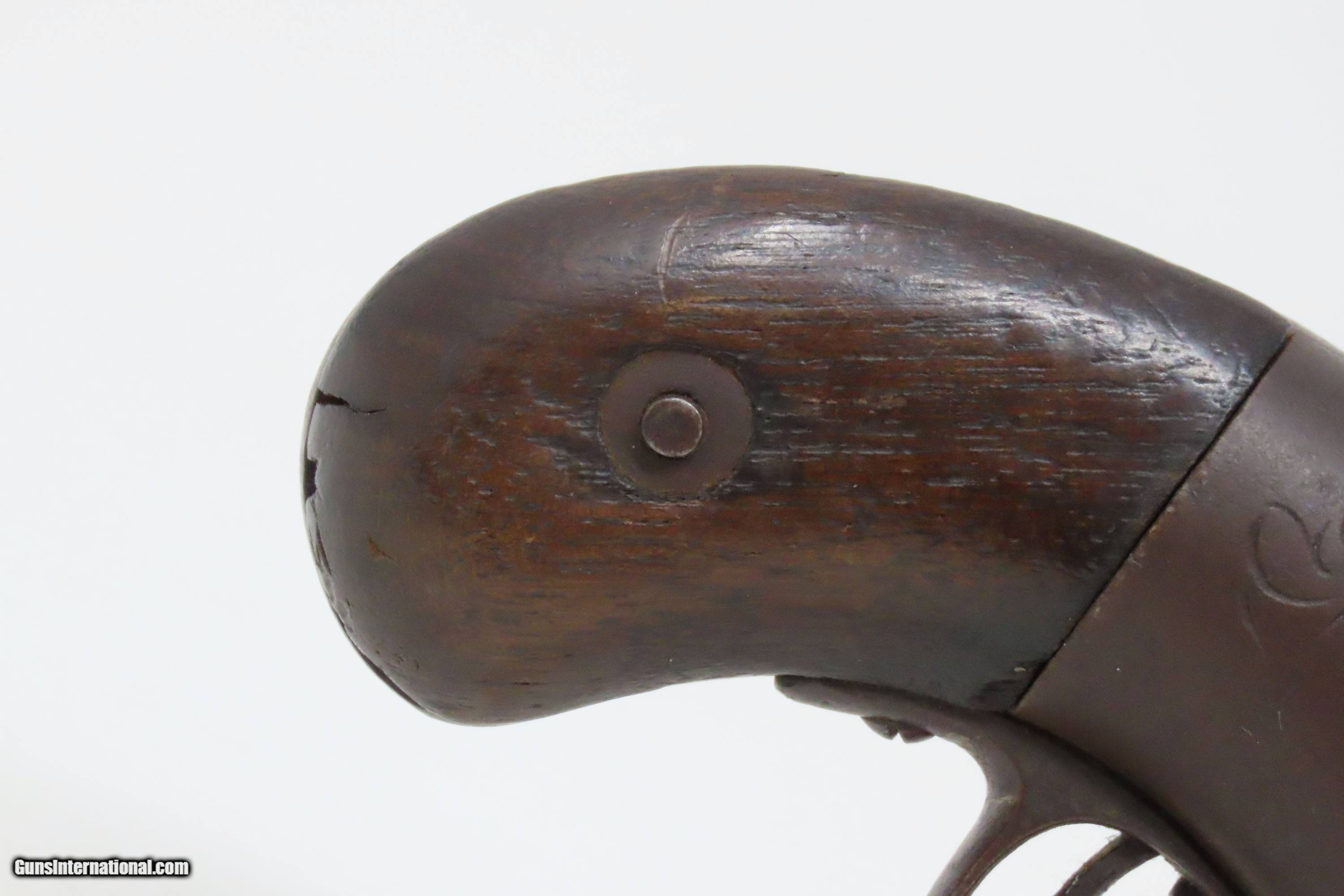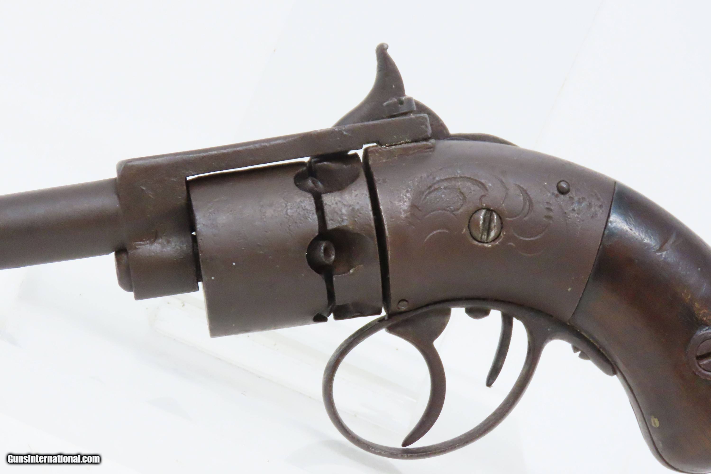 Description: Antique SPRINGFIELD ARMS Co Double Trigger POCKET Model PERCUSSION Revolver SCARCE! 1 of only 125 Manufactured in 1850-51 Here we present an antique engraved Springfield Arms Company Double Trigger Pocket Model Percussion Revolver, manufactured circa 1850-51 in Springfield, Massachusetts. The Springfield Arms Company existed only for a brief period in 1850 and 1851, making revolvers designed by its chief engineer, James Warner, before being driven out of business by Colt patent lawyers. During that time, Springfield Arms, which had no relation to the arsenal, made models in .28, .31, and .36 caliber and with a variety of barrel lengths and other features, including a well-designed safety notch to allow the guns to be carried fully loaded safely. Warner designed two different revolvers, one with two triggers and one with only one trigger. On the one trigger models, he was blatantly infringing on Colt’s Patent and only made 125 of these. On the two trigger models, in an attempt to avoid patent infringement, Warner separated the cylinder rotation and firing mechanisms into two different triggers. The front trigger would rotate and lock the cylinder, and then it would trip the rear trigger which released the sear and fired the gun. This was not sufficient to save him from copyright infringement suits, though, and only about 125 of the double-trigger revolvers were made. Out of the 250 total revolvers manufactured, 125 single trigger and 125 two triggers, this example is one of the few built, and realistically, how many total are known existing out of only 125 of these double triggers? Very few. Here is a great opportunity to pick up an extremely scare early 1850s revolver that you won’t see around very often. The overall condition is fair. Solid plum patina throughout. The action (hammer/trigger) is functional but there is no indexing or lockup of the cylinder. The bore is dim with rifling visible. The grips show much use, with the right grip showing some old damage, but they are both solid. Own the original! This is a legitimate antique and not a reproduction. Barrel is 2-5/8 inches. Caliber: .28 Percussion Overall condition as seen in photos. Very Fast. Very Safe. FREE SHIPPING WORLDWIDE. Delivered directly to your door by express mail! Guaranteed AUTHENTIC & Includes CERTIFICATE OF AUTHENTICITY. ancestryguns $1200 #233161 SOLD Antique: Yes |