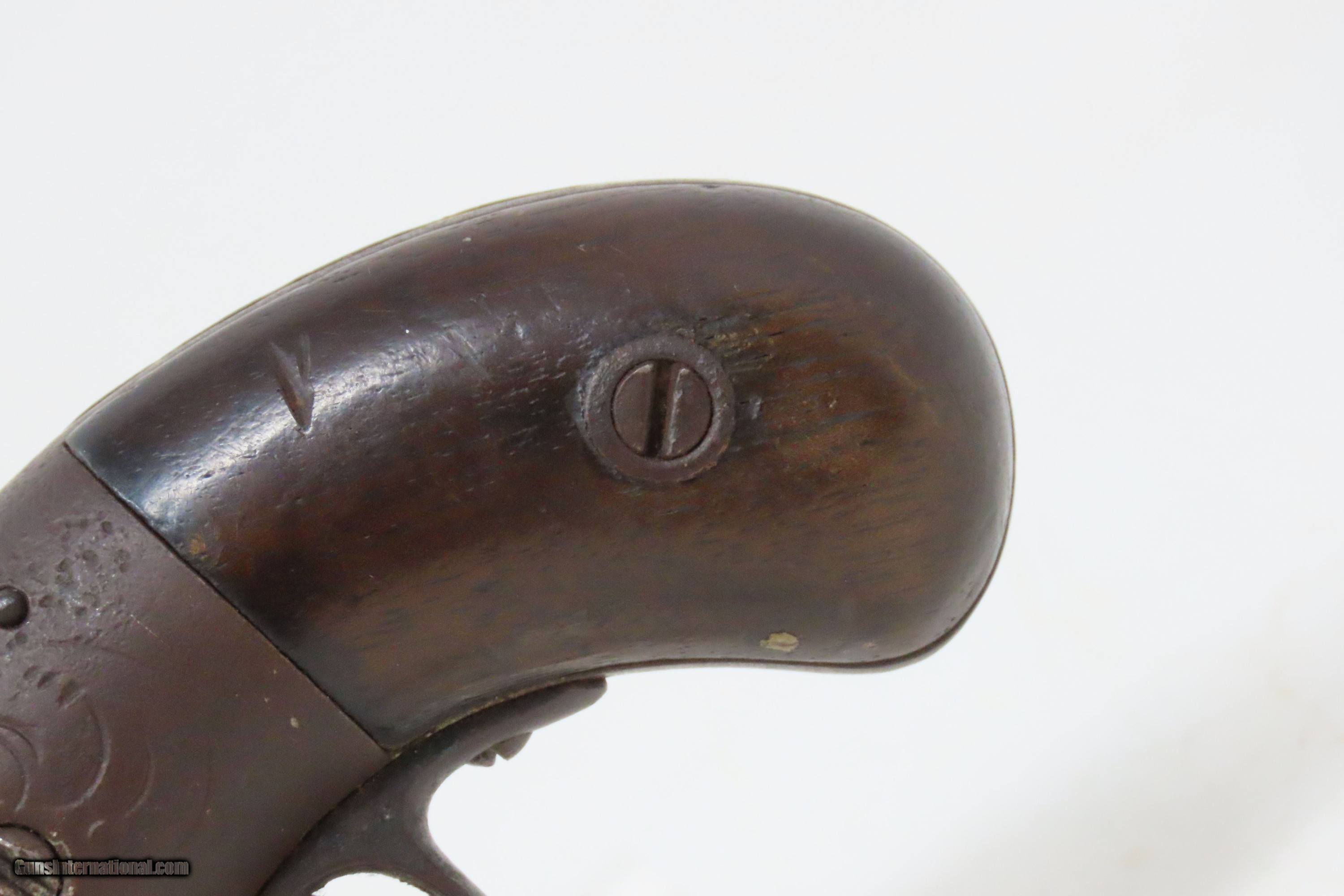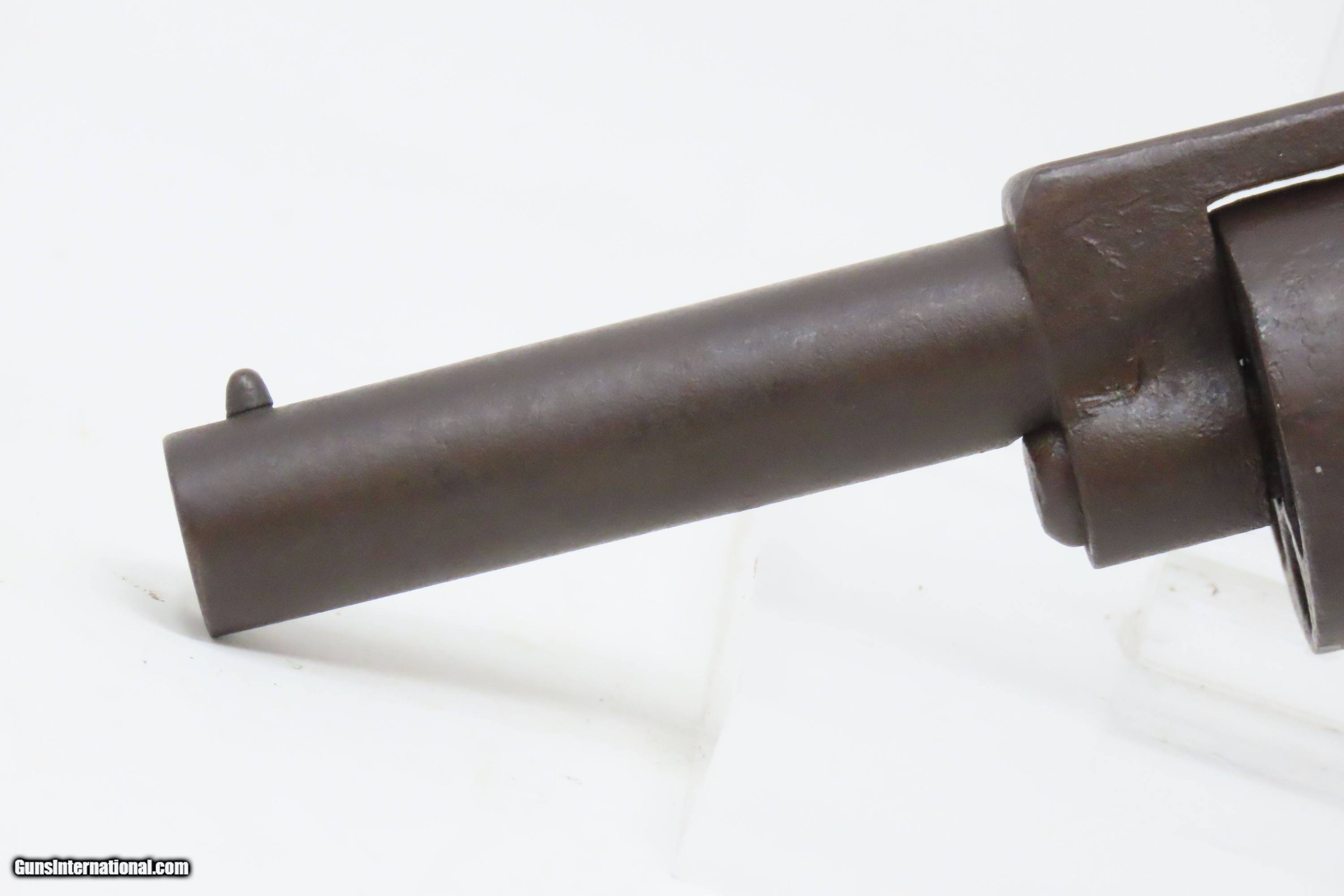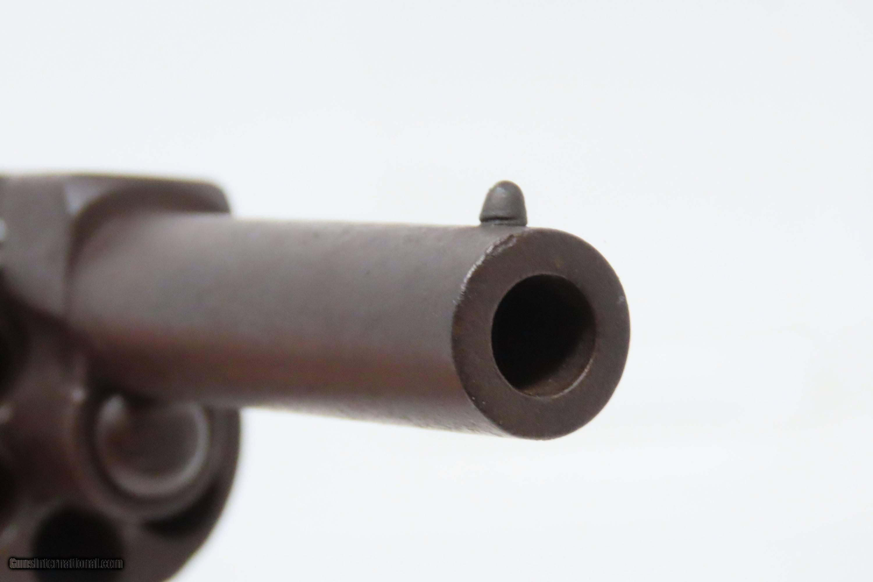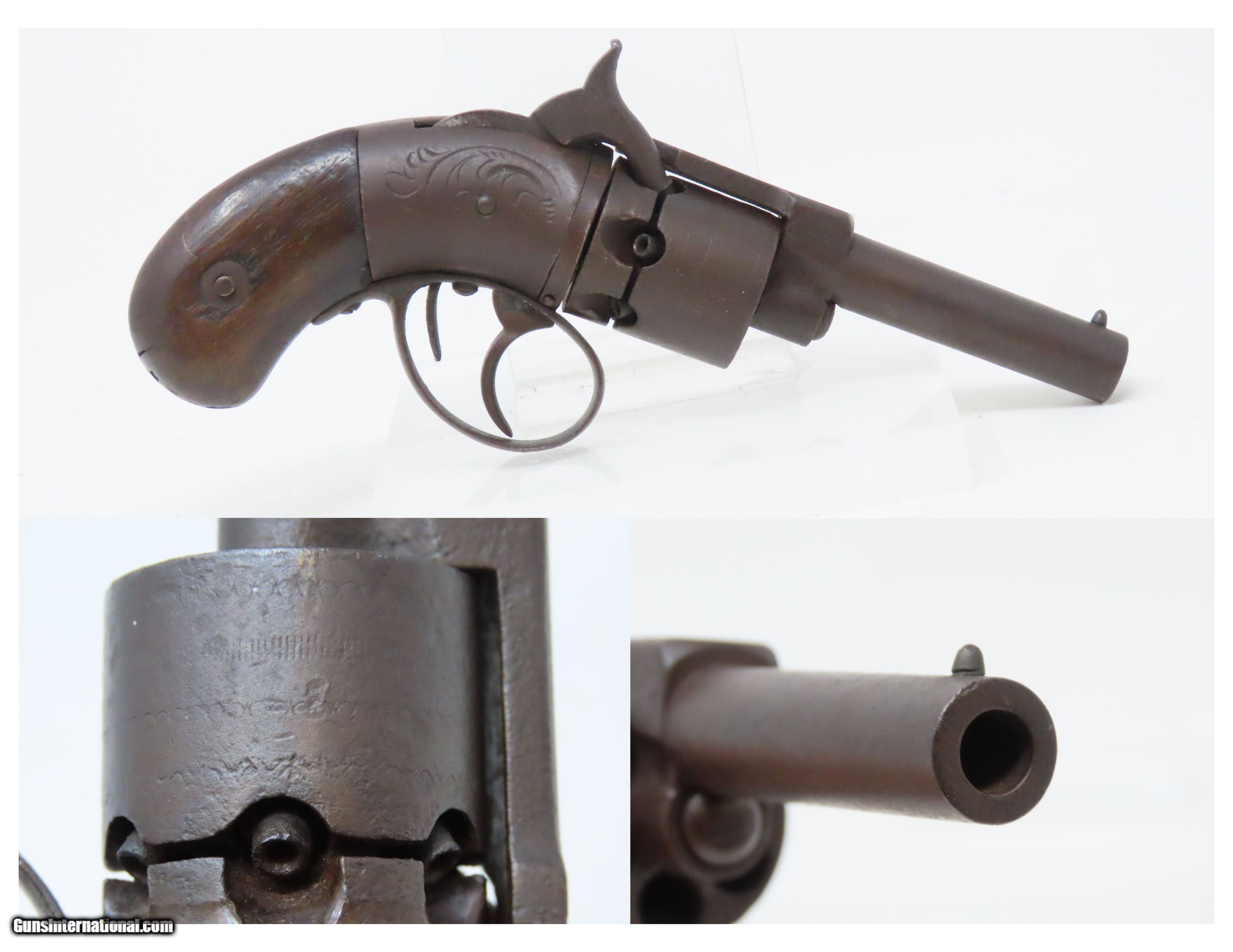 Description: Antique SPRINGFIELD ARMS Co Double Trigger POCKET Model PERCUSSION Revolver SCARCE! 1 of only 125 Manufactured in 1850-51 Here we present an antique engraved Springfield Arms Company Double Trigger Pocket Model Percussion Revolver, manufactured circa 1850-51 in Springfield, Massachusetts. The Springfield Arms Company existed only for a brief period in 1850 and 1851, making revolvers designed by its chief engineer, James Warner, before being driven out of business by Colt patent lawyers. During that time, Springfield Arms, which had no relation to the arsenal, made models in .28, .31, and .36 caliber and with a variety of barrel lengths and other features, including a well-designed safety notch to allow the guns to be carried fully loaded safely. Warner designed two different revolvers, one with two triggers and one with only one trigger. On the one trigger models, he was blatantly infringing on Colt’s Patent and only made 125 of these. On the two trigger models, in an attempt to avoid patent infringement, Warner separated the cylinder rotation and firing mechanisms into two different triggers. The front trigger would rotate and lock the cylinder, and then it would trip the rear trigger which released the sear and fired the gun. This was not sufficient to save him from copyright infringement suits, though, and only about 125 of the double-trigger revolvers were made. Out of the 250 total revolvers manufactured, 125 single trigger and 125 two triggers, this example is one of the few built, and realistically, how many total are known existing out of only 125 of these double triggers? Very few. Here is a great opportunity to pick up an extremely scare early 1850s revolver that you won’t see around very often. The overall condition is fair. Solid plum patina throughout. The action (hammer/trigger) is functional but there is no indexing or lockup of the cylinder. The bore is dim with rifling visible. The grips show much use, with the right grip showing some old damage, but they are both solid. Own the original! This is a legitimate antique and not a reproduction. Barrel is 2-5/8 inches. Caliber: .28 Percussion Overall condition as seen in photos. Very Fast. Very Safe. FREE SHIPPING WORLDWIDE. Delivered directly to your door by express mail! Guaranteed AUTHENTIC & Includes CERTIFICATE OF AUTHENTICITY. ancestryguns $1200 #233161 SOLD Antique: Yes |