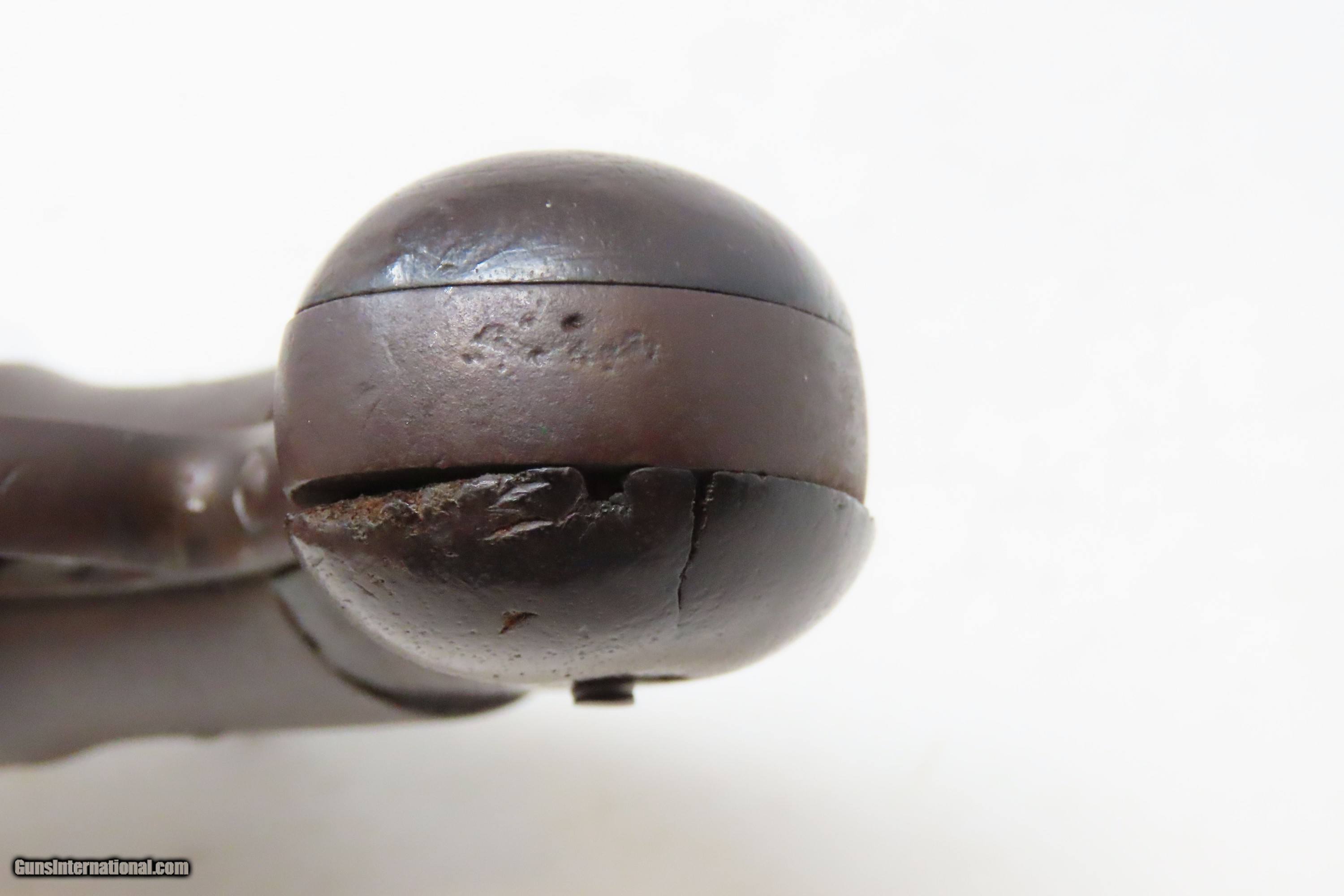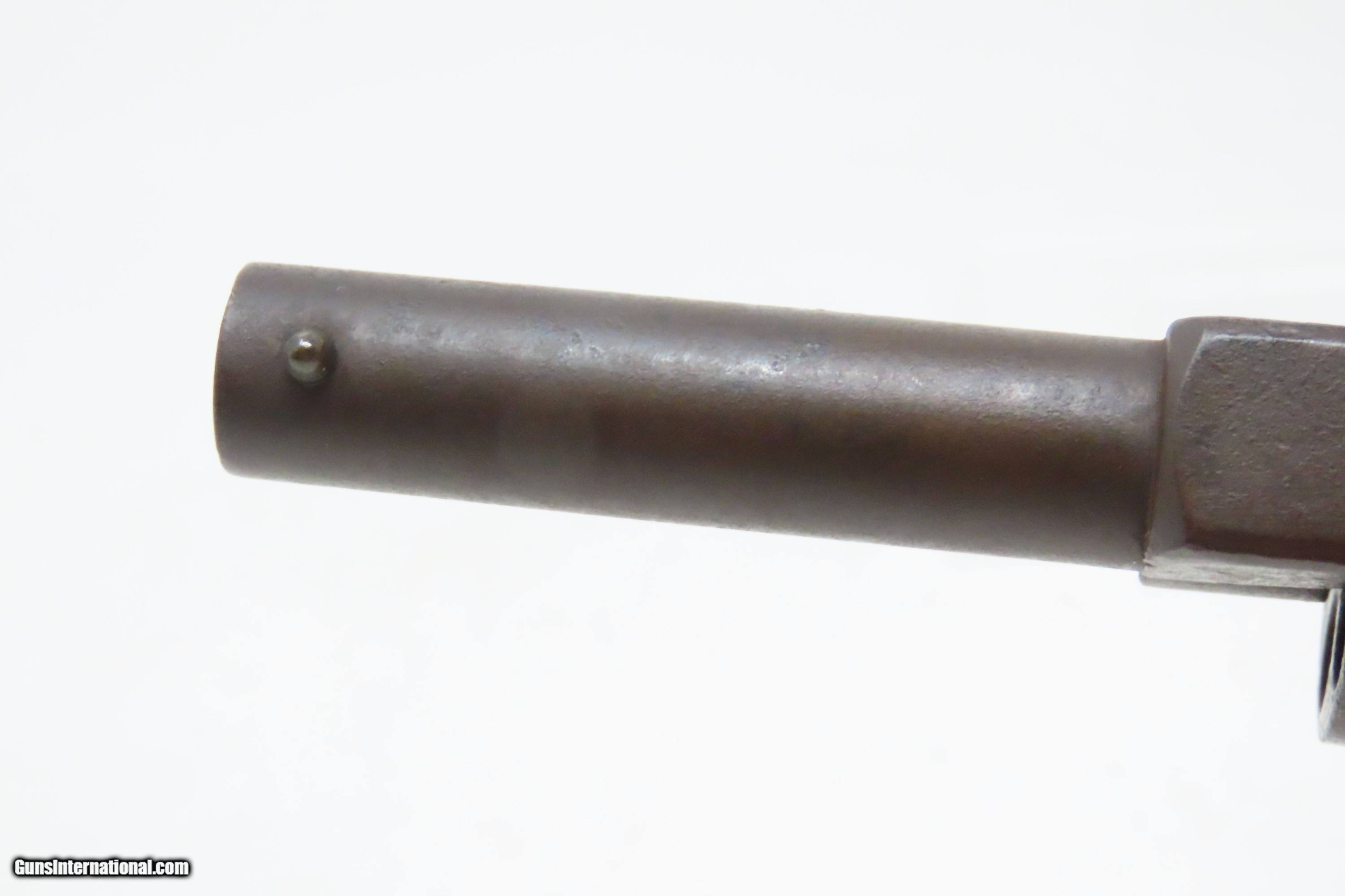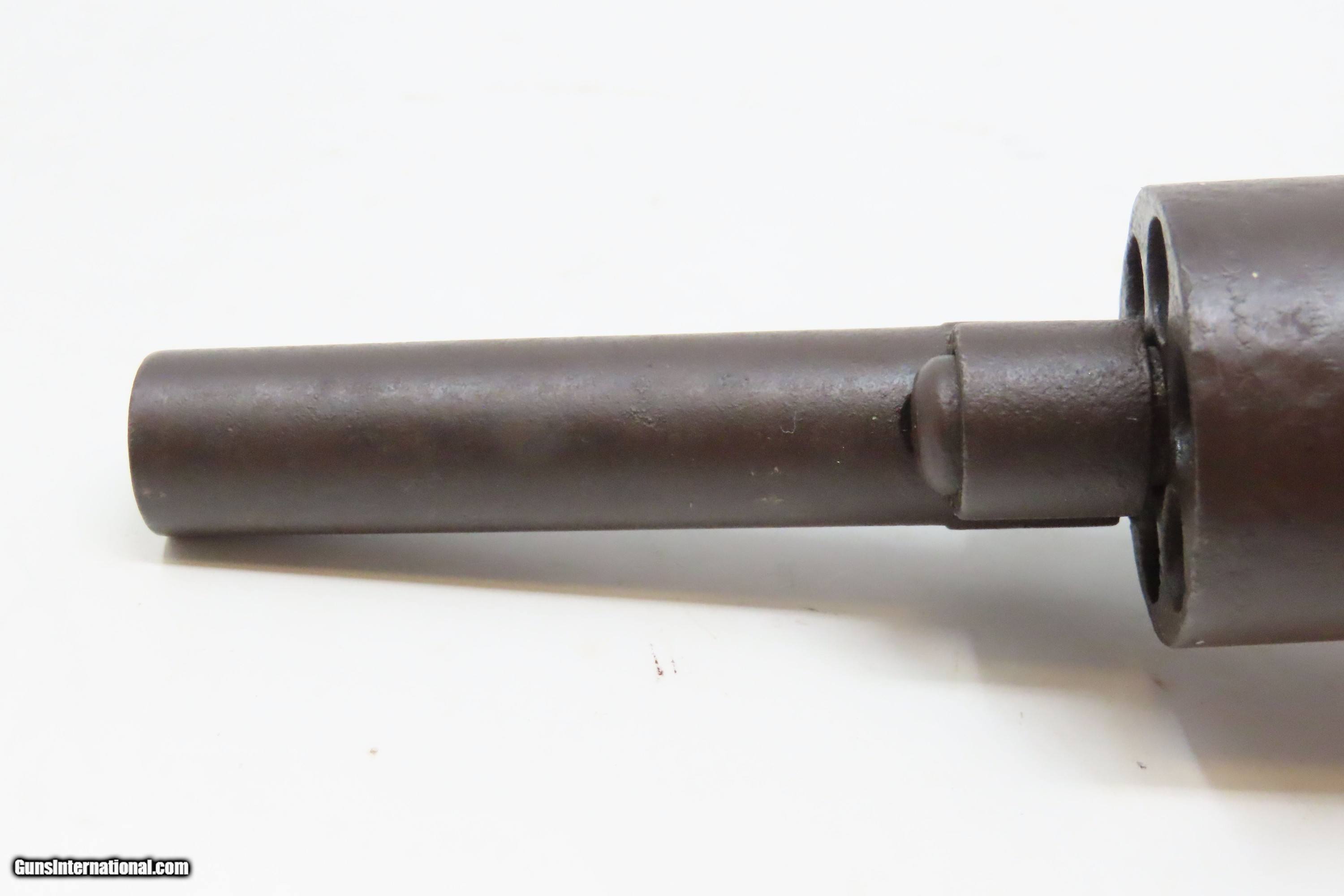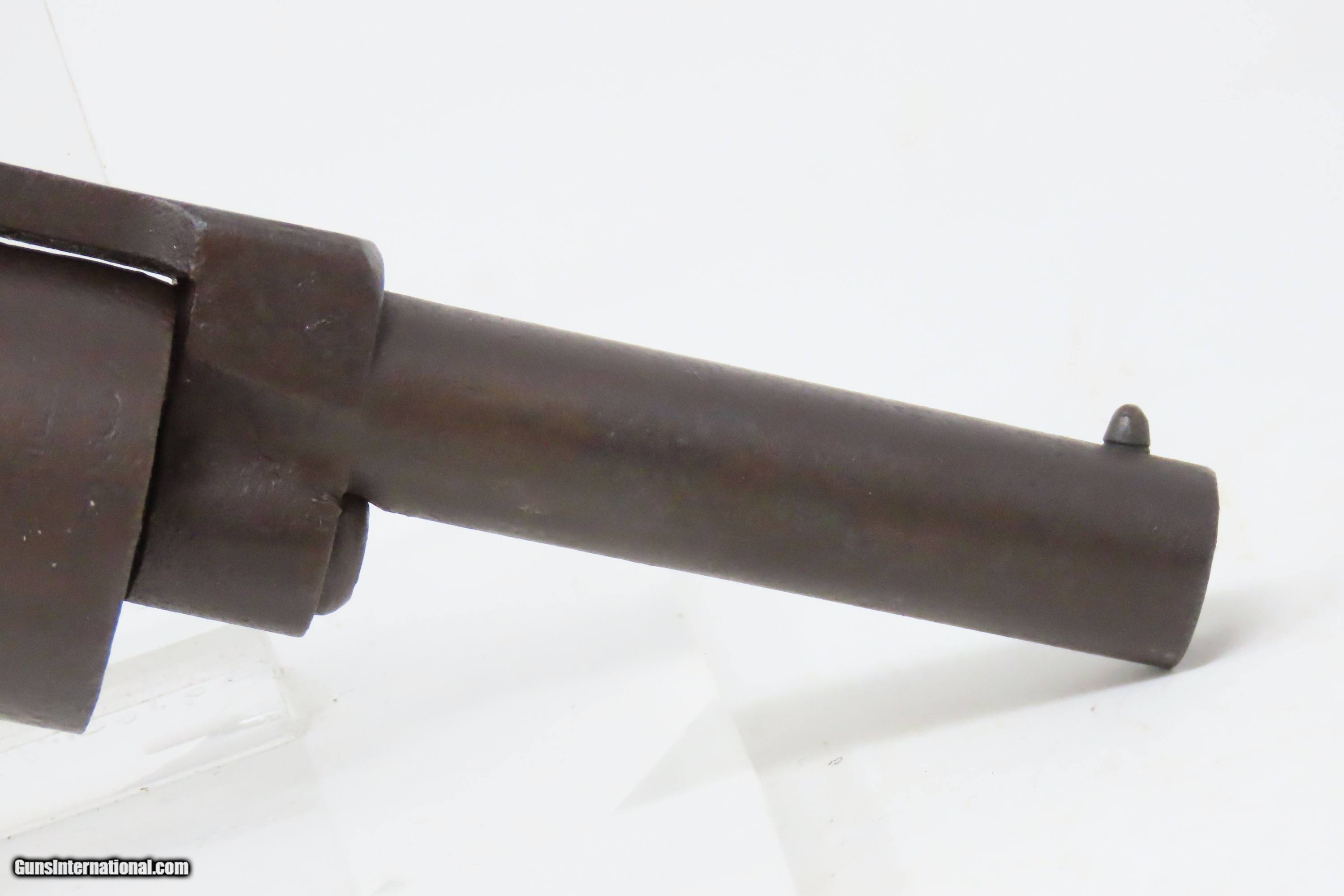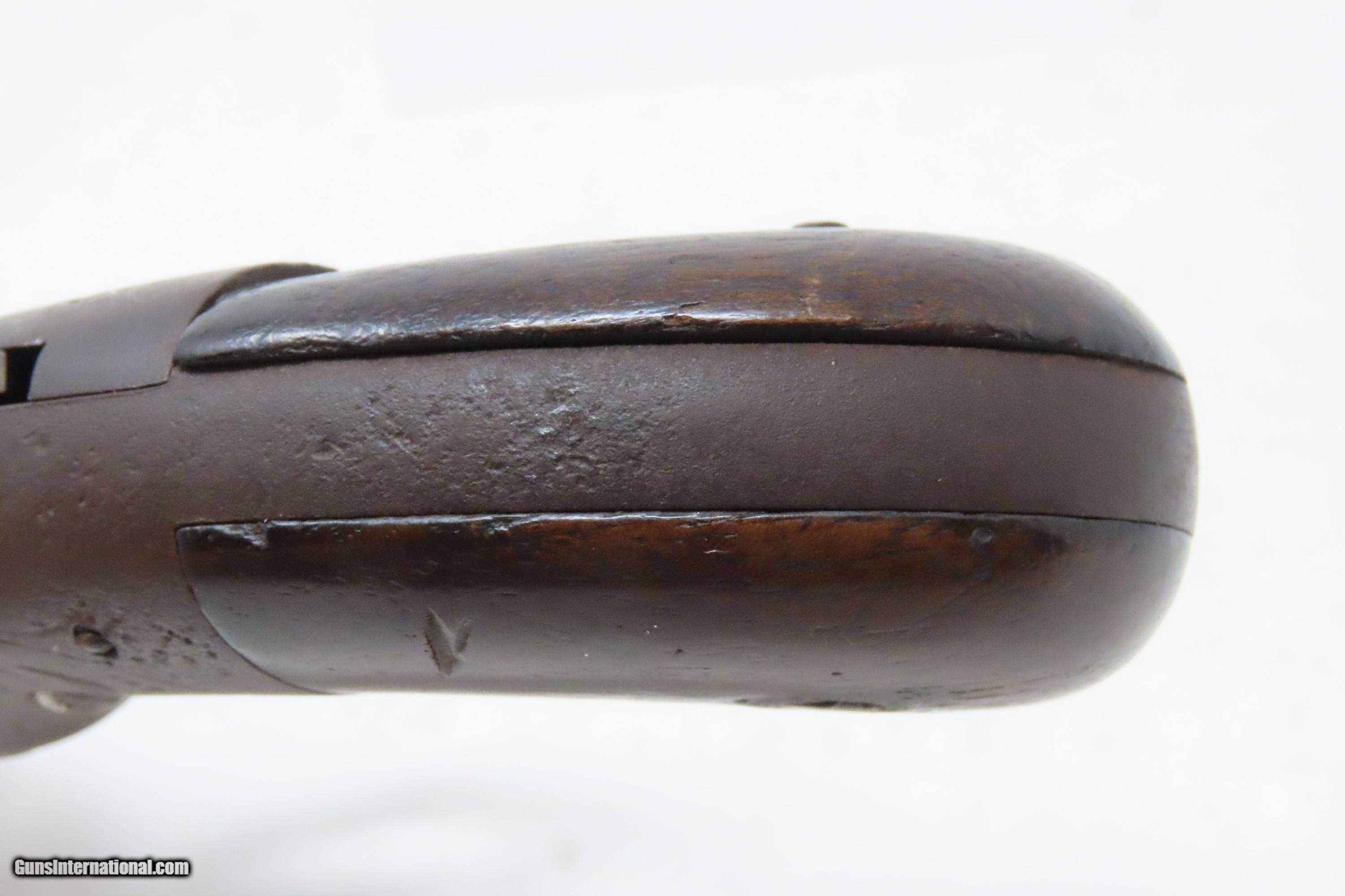 Description: Antique SPRINGFIELD ARMS Co Double Trigger POCKET Model PERCUSSION Revolver SCARCE! 1 of only 125 Manufactured in 1850-51 Here we present an antique engraved Springfield Arms Company Double Trigger Pocket Model Percussion Revolver, manufactured circa 1850-51 in Springfield, Massachusetts. The Springfield Arms Company existed only for a brief period in 1850 and 1851, making revolvers designed by its chief engineer, James Warner, before being driven out of business by Colt patent lawyers. During that time, Springfield Arms, which had no relation to the arsenal, made models in .28, .31, and .36 caliber and with a variety of barrel lengths and other features, including a well-designed safety notch to allow the guns to be carried fully loaded safely. Warner designed two different revolvers, one with two triggers and one with only one trigger. On the one trigger models, he was blatantly infringing on Colt’s Patent and only made 125 of these. On the two trigger models, in an attempt to avoid patent infringement, Warner separated the cylinder rotation and firing mechanisms into two different triggers. The front trigger would rotate and lock the cylinder, and then it would trip the rear trigger which released the sear and fired the gun. This was not sufficient to save him from copyright infringement suits, though, and only about 125 of the double-trigger revolvers were made. Out of the 250 total revolvers manufactured, 125 single trigger and 125 two triggers, this example is one of the few built, and realistically, how many total are known existing out of only 125 of these double triggers? Very few. Here is a great opportunity to pick up an extremely scare early 1850s revolver that you won’t see around very often. The overall condition is fair. Solid plum patina throughout. The action (hammer/trigger) is functional but there is no indexing or lockup of the cylinder. The bore is dim with rifling visible. The grips show much use, with the right grip showing some old damage, but they are both solid. Own the original! This is a legitimate antique and not a reproduction. Barrel is 2-5/8 inches. Caliber: .28 Percussion Overall condition as seen in photos. Very Fast. Very Safe. FREE SHIPPING WORLDWIDE. Delivered directly to your door by express mail! Guaranteed AUTHENTIC & Includes CERTIFICATE OF AUTHENTICITY. ancestryguns $1200 #233161 SOLD Antique: Yes |