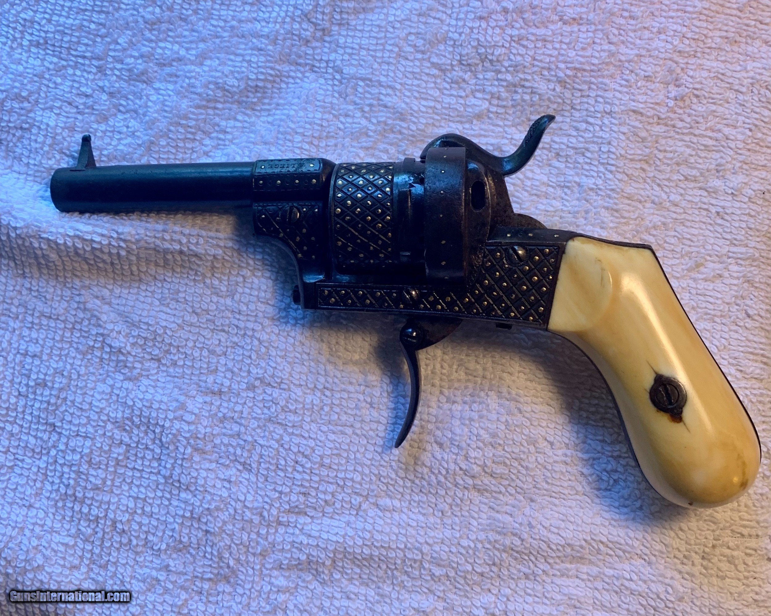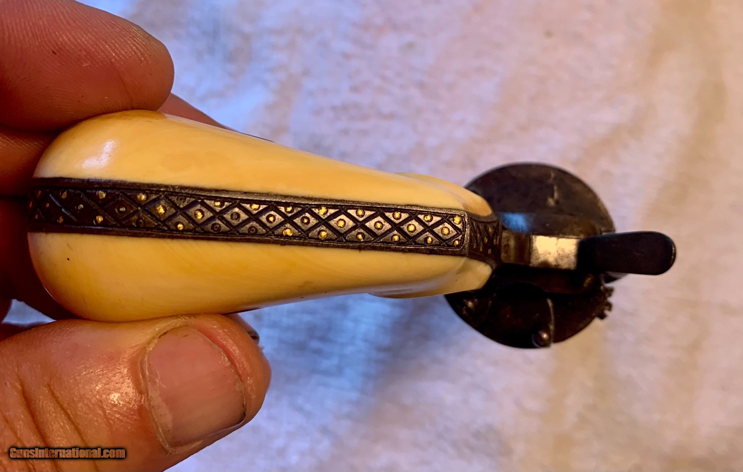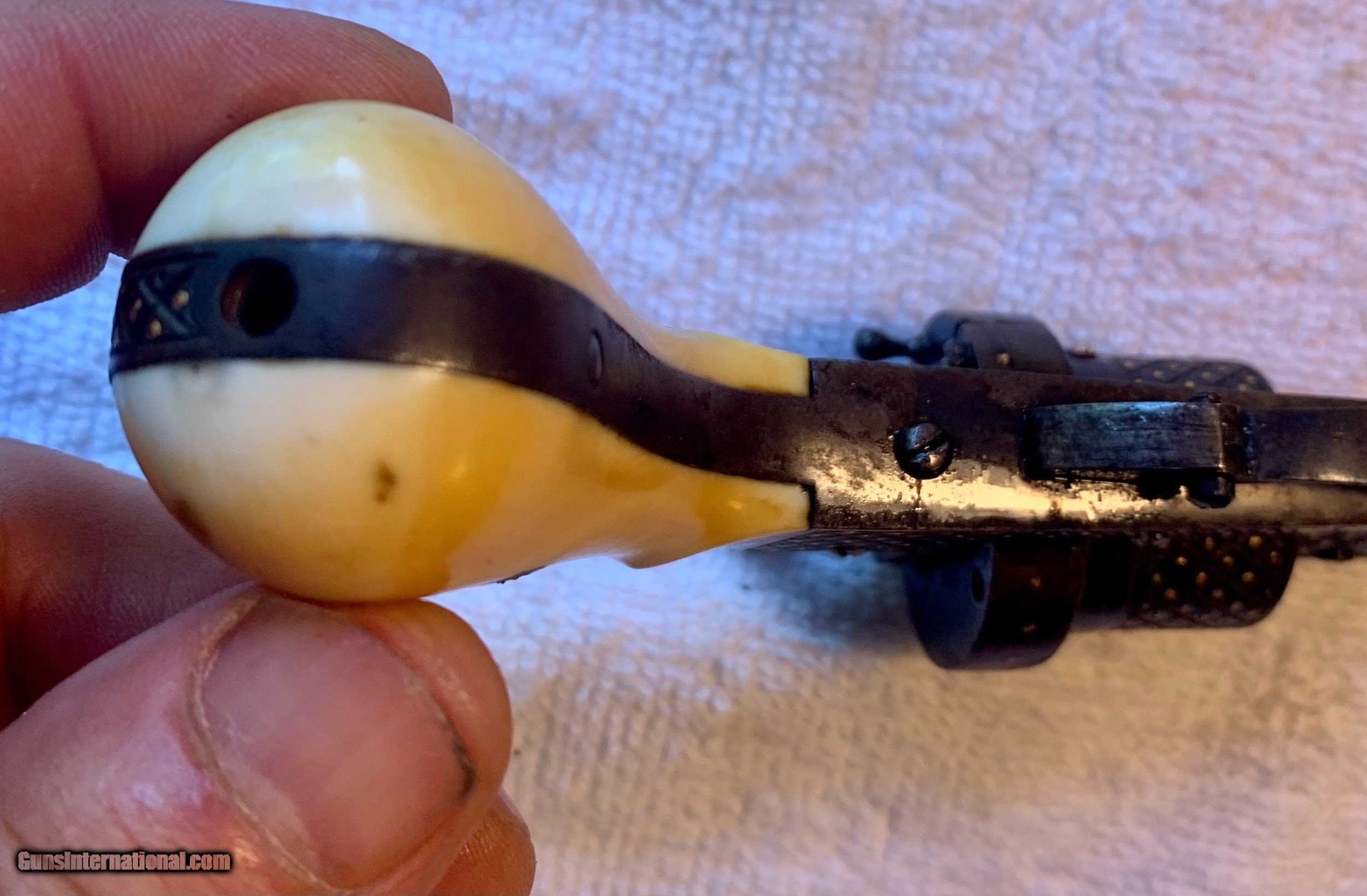 Description: Excellent condition French/Belgium made .30 caliber rim fire 6 shot revolver. neat gold tack design on frame Factory ivory grips shows as new comes in case. c1870's XF condition SOLD |