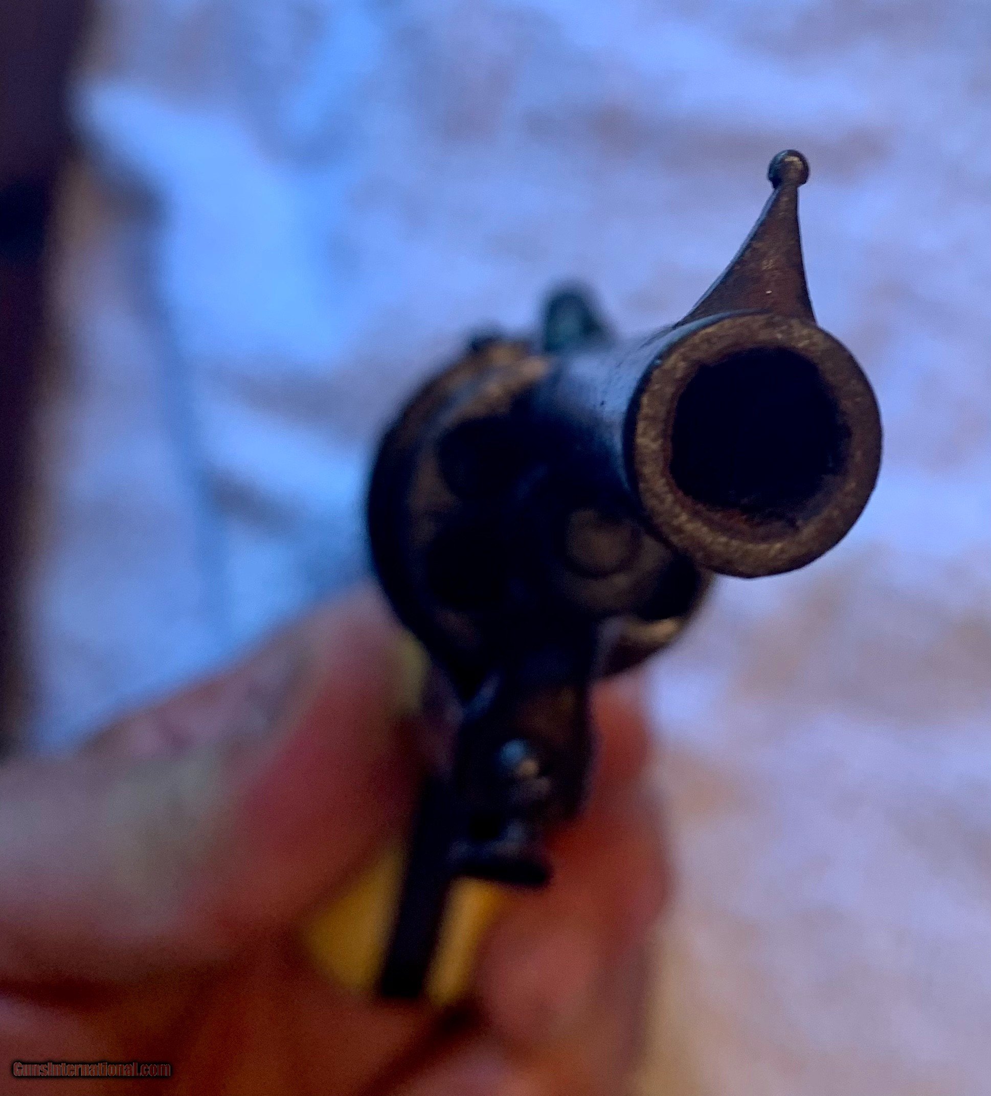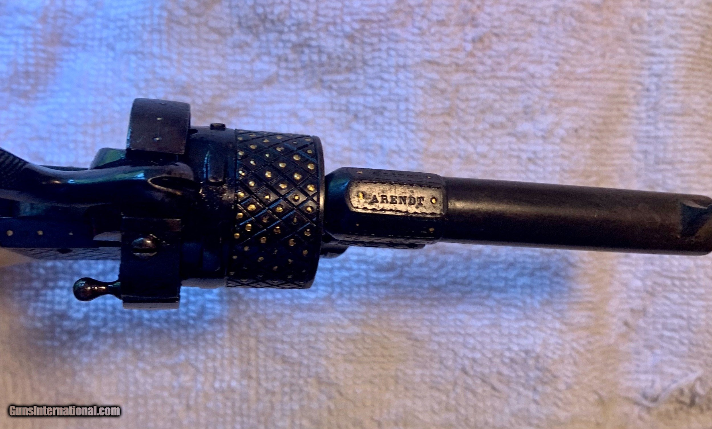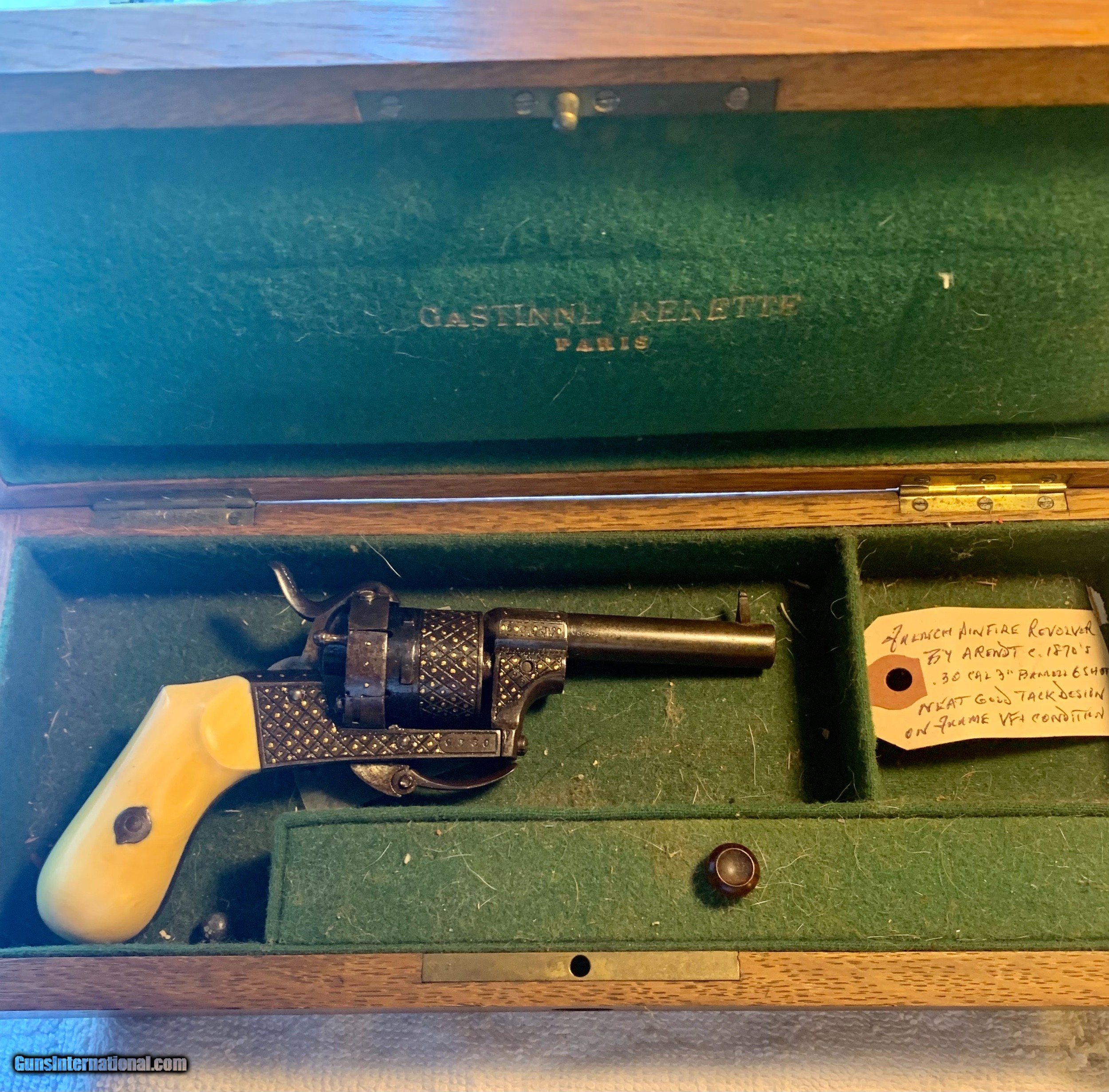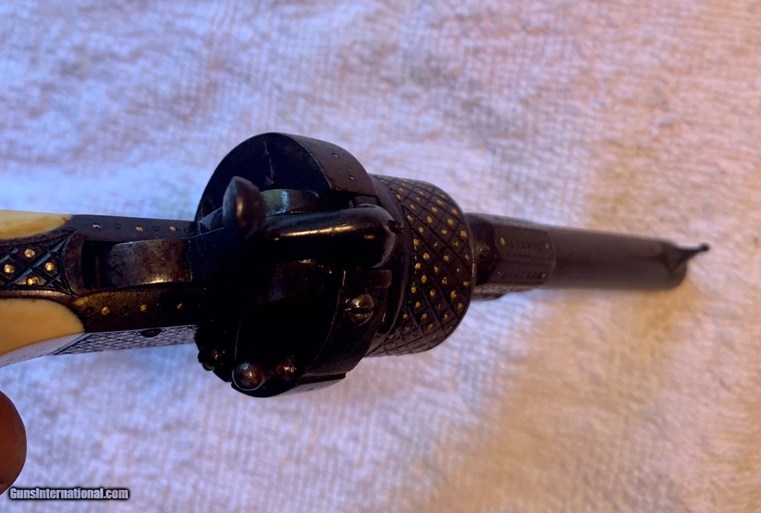 Description: Excellent condition French/Belgium made .30 caliber rim fire 6 shot revolver. neat gold tack design on frame Factory ivory grips shows as new comes in case. c1870's XF condition SOLD |