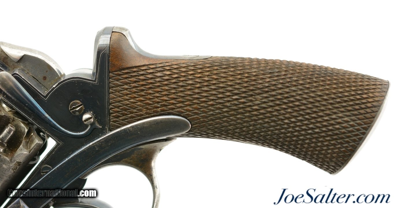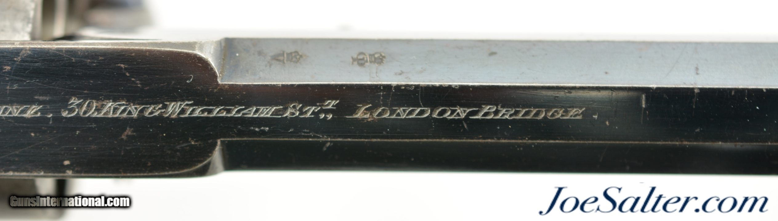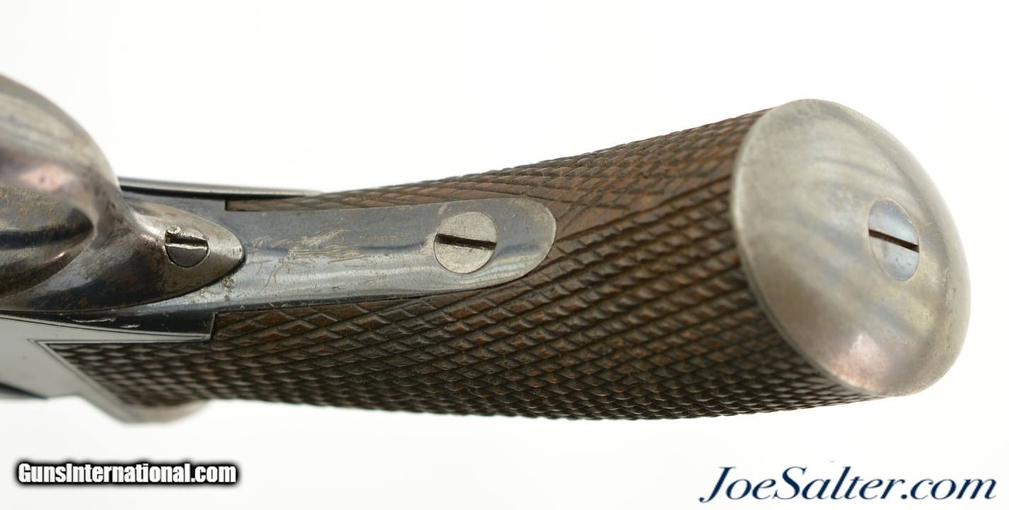 Description: Serial #16886R, 54 Bore (.442 Caliber), 6" octagon barrel with a fine, bright bore that has some spots of minor dark freckling within the grooves. This is a truly handsome five-shot, double-action revolver that retains 92-95% of the original bright blue finish, with some fading to gray at the muzzle, as well as along the high and exposed edges. A good amount of the original bright nitre blue still remains on the loading lever and hammer block on the left side as well. The cylinder has muted color case-hardening remaining, with a predominately mottled gray patina throughout, as does the spurless hammer. The checkered walnut grips are in fine-near excellent shape with only some very minor handling marks and only mild flattening of the points. The lock-up is tight and the action functions flawlessly. The revolver is housed in an oak traveling case with intact Deane, Adams & Deane label, green baize lining, and a full complement of accessories: Hawksley pistol flask; cleaning rod; ebony-handled turn-screw; double cavity mold for both flat-based and sprue-based bullets; bullet base washer cutter; pewter oil bottle; and a small bag of cast lead bullets with cardboard base washers. Also included is an extremely rare, original, suede primer bag with intact Eley Bros. and Deane, Adams & Deane paper labels (prior to metal tins becoming generally accepted by everyone, percussion caps were also sold in wash leather bags like this, or in paper-wrapped cardboard boxes.) This is an absolutely splendid Beaumont-Adams revolver, cased with some extremely hard-to-find accessories, and rates excellent condition overall. Antique SOLD |