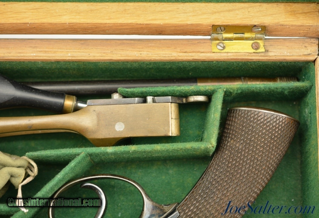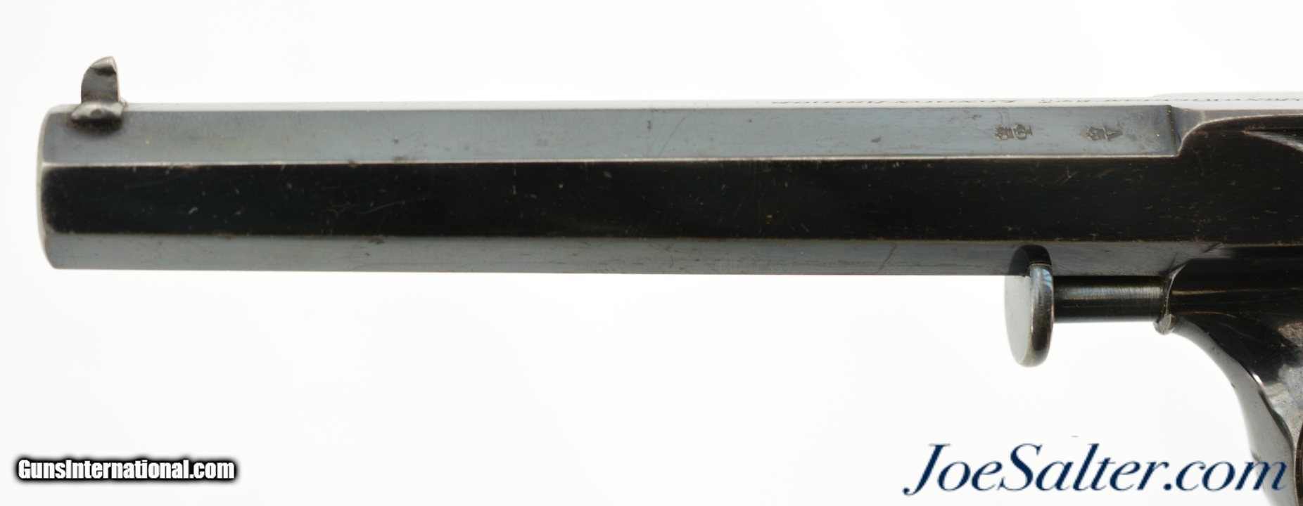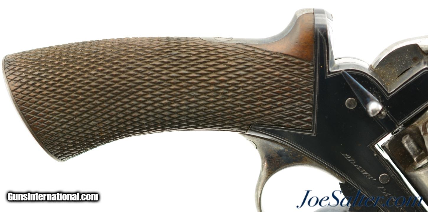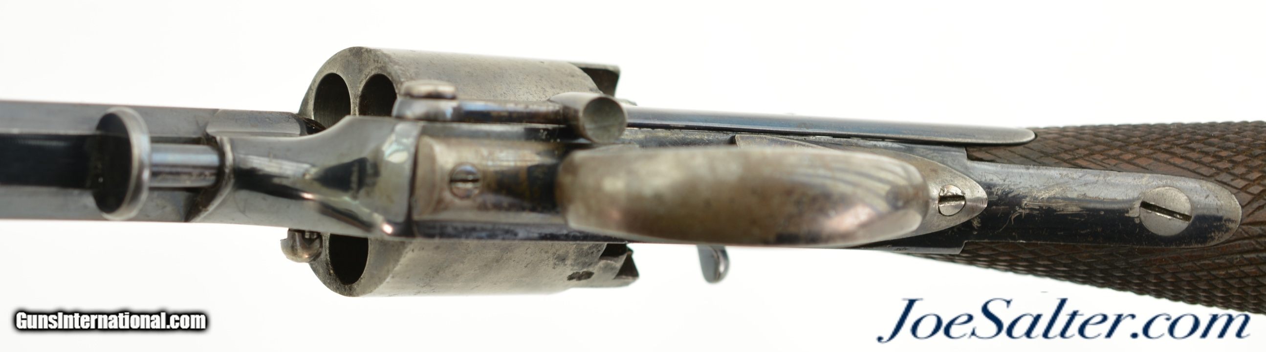 Description: Serial #16886R, 54 Bore (.442 Caliber), 6" octagon barrel with a fine, bright bore that has some spots of minor dark freckling within the grooves. This is a truly handsome five-shot, double-action revolver that retains 92-95% of the original bright blue finish, with some fading to gray at the muzzle, as well as along the high and exposed edges. A good amount of the original bright nitre blue still remains on the loading lever and hammer block on the left side as well. The cylinder has muted color case-hardening remaining, with a predominately mottled gray patina throughout, as does the spurless hammer. The checkered walnut grips are in fine-near excellent shape with only some very minor handling marks and only mild flattening of the points. The lock-up is tight and the action functions flawlessly. The revolver is housed in an oak traveling case with intact Deane, Adams & Deane label, green baize lining, and a full complement of accessories: Hawksley pistol flask; cleaning rod; ebony-handled turn-screw; double cavity mold for both flat-based and sprue-based bullets; bullet base washer cutter; pewter oil bottle; and a small bag of cast lead bullets with cardboard base washers. Also included is an extremely rare, original, suede primer bag with intact Eley Bros. and Deane, Adams & Deane paper labels (prior to metal tins becoming generally accepted by everyone, percussion caps were also sold in wash leather bags like this, or in paper-wrapped cardboard boxes.) This is an absolutely splendid Beaumont-Adams revolver, cased with some extremely hard-to-find accessories, and rates excellent condition overall. Antique SOLD |