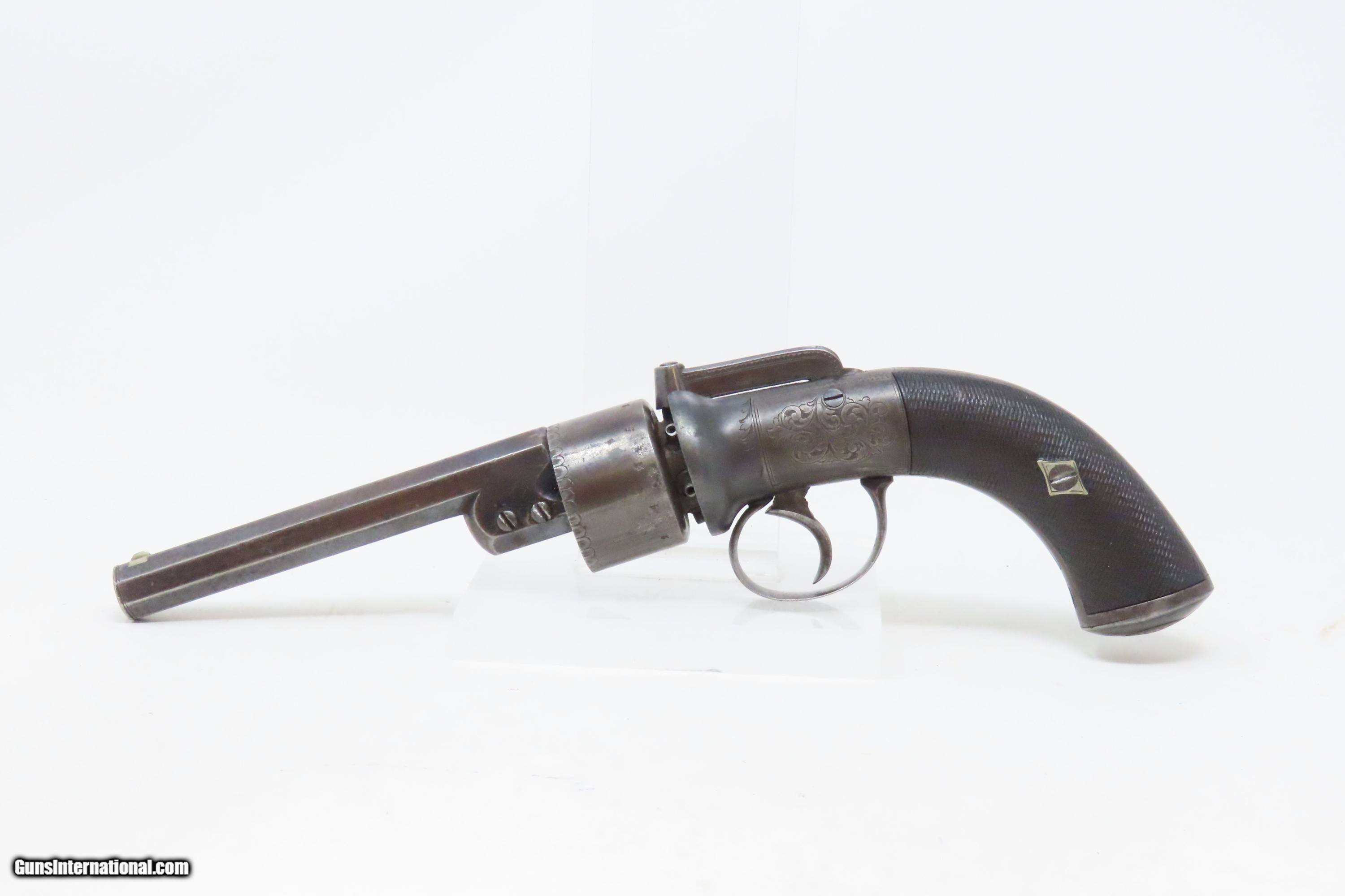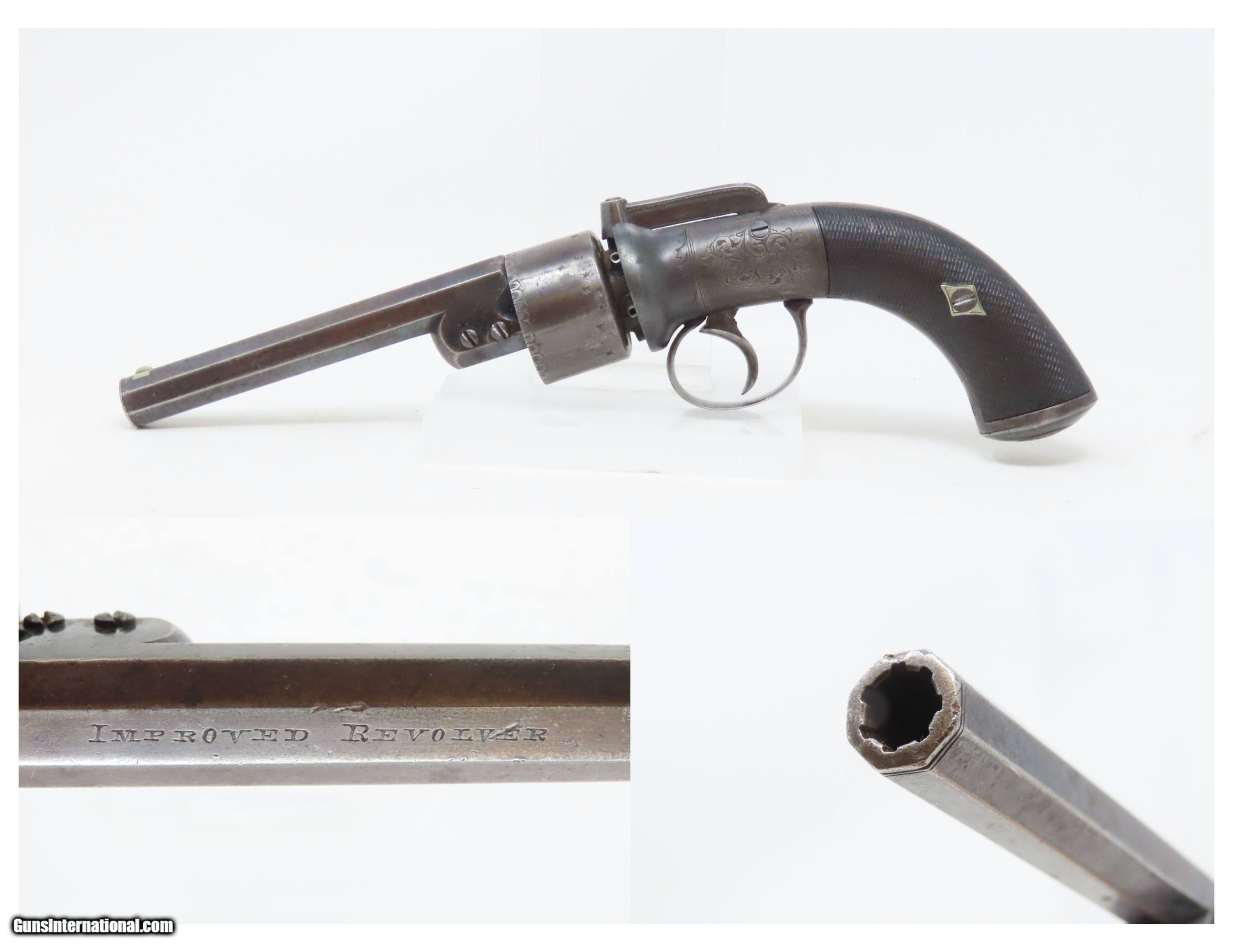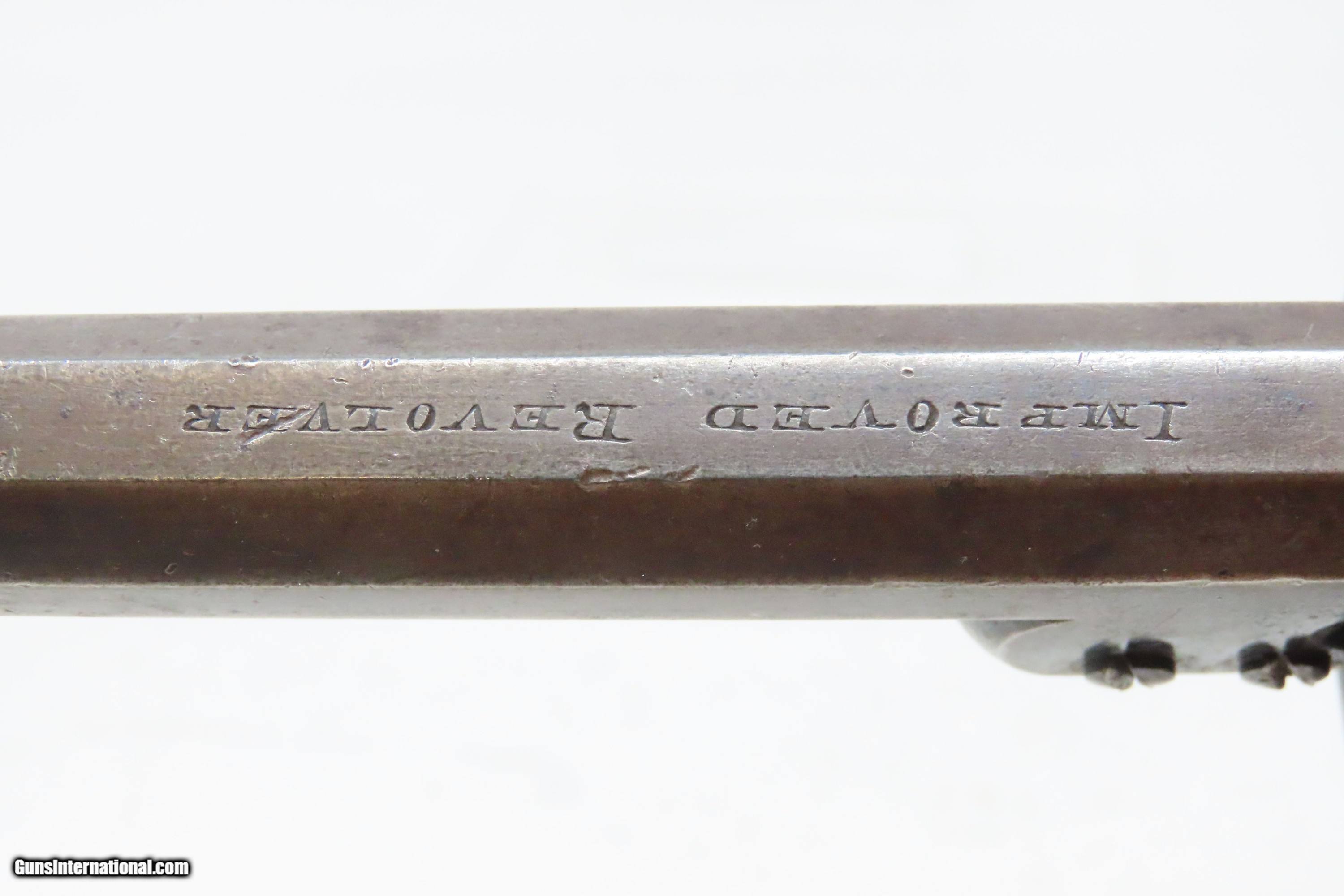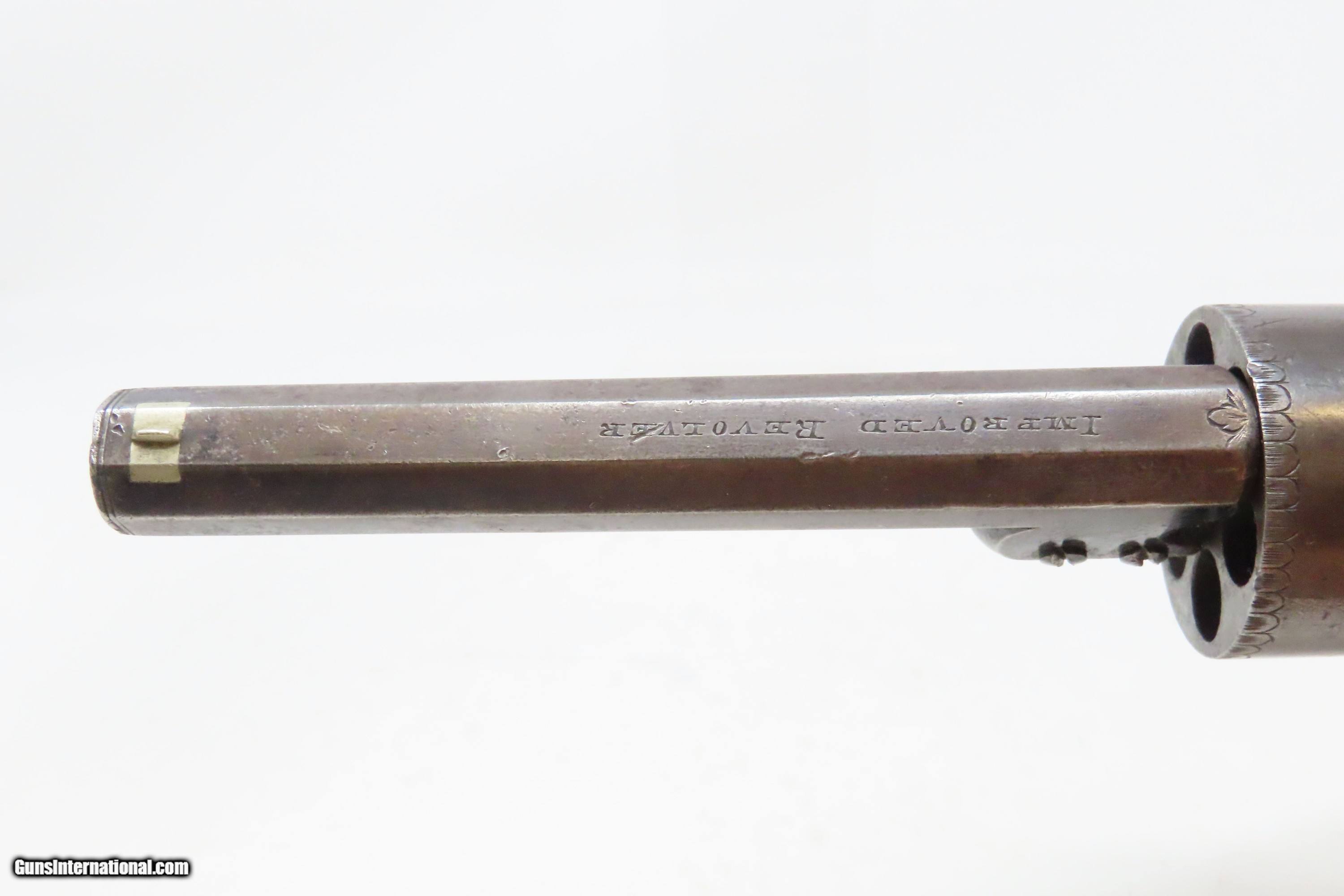 British ENGRAVED Antique BAR HAMMER Transitional .36 PERCUSSION DA Revolver “IMPROVED REVOLVER” Marked Transitional Firearm