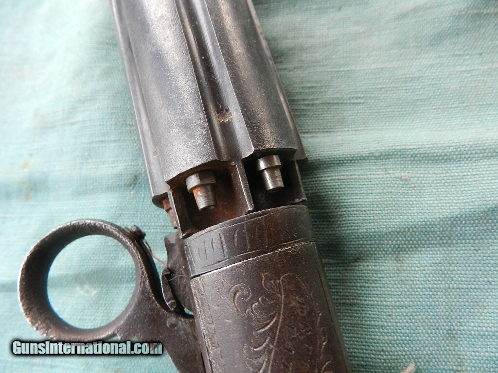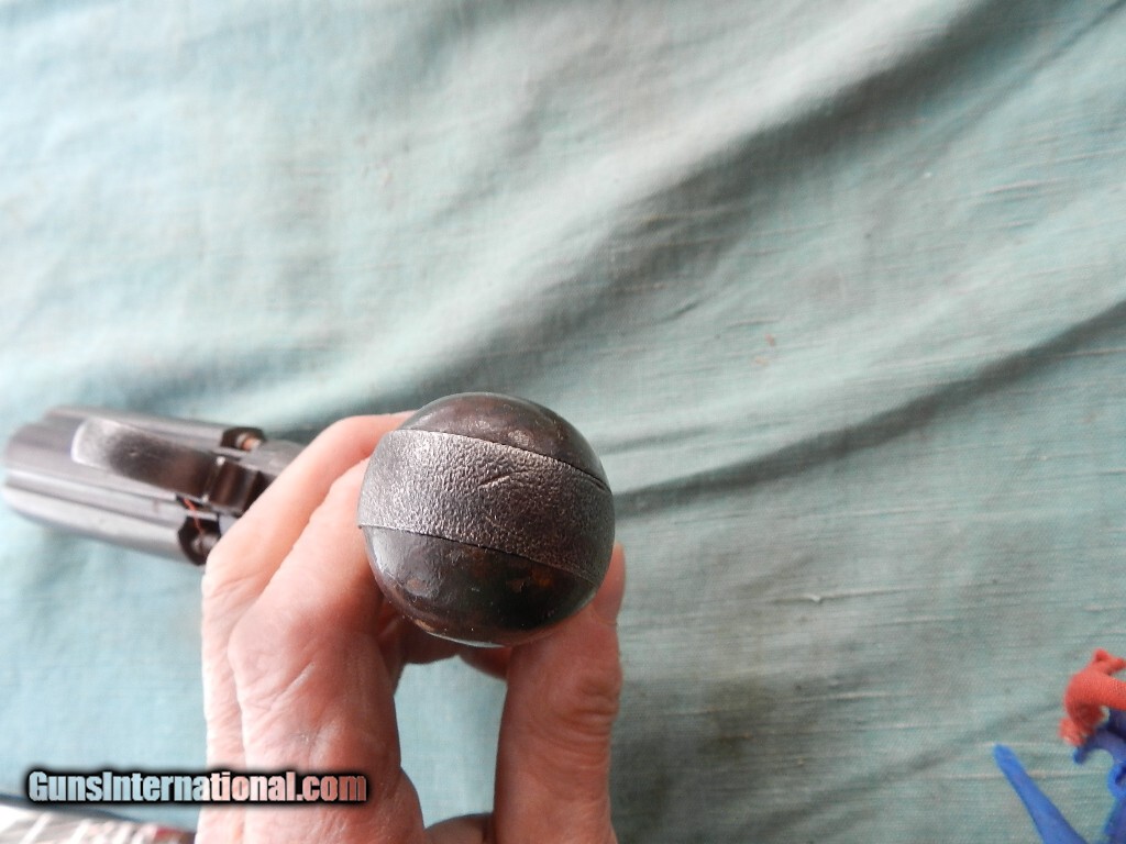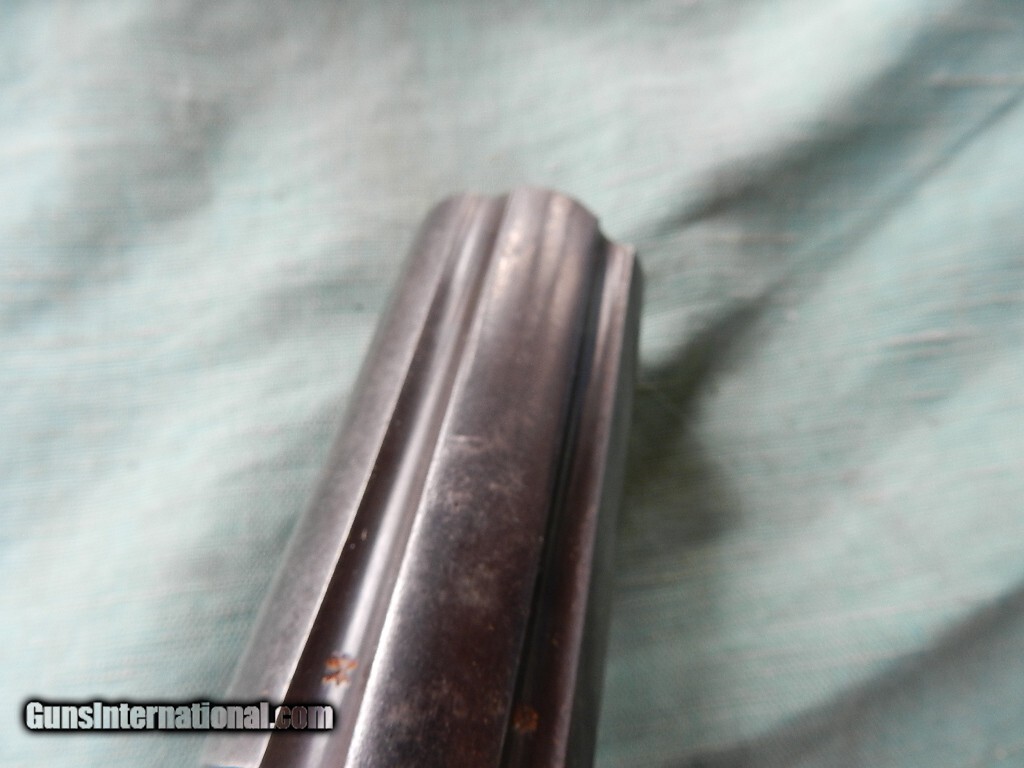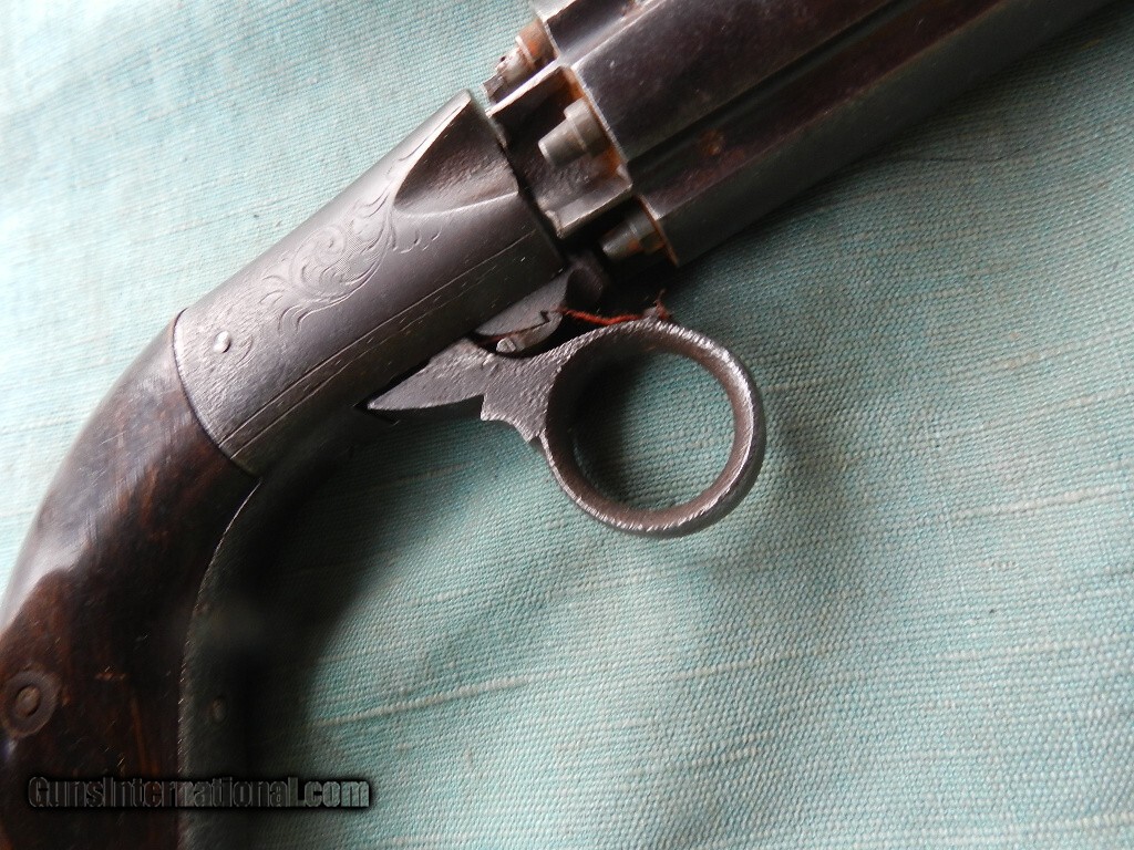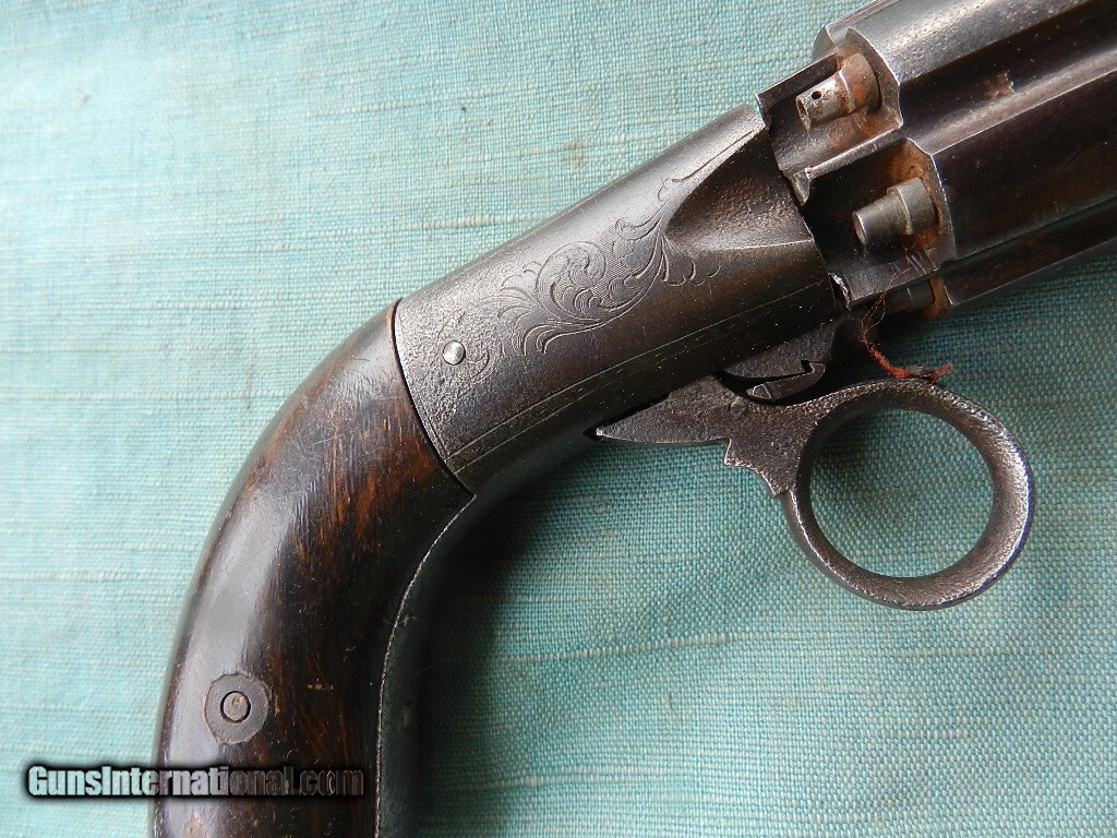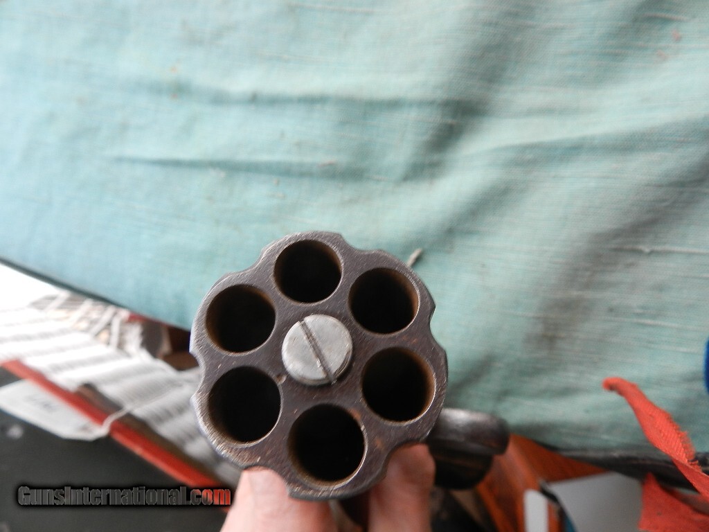 Description: . John Rock Cooper patented this design in 1843, and remained in business until 1853. The patent was apparently for the UNDERHAMMER firing mechanism, which is linked directly to the ring trigger. Most other pepperboxes use a hammer that strikes a cap nipple cone on the side of the cylinder, but these have the nipples on the rear. The only other markings present on the revolver are the CROWN / CROSSED SCEPTERS / BPC "black powder proof" and CROWN / CROSSED SCEPTERS / V "viewed" marks from the city of Birmingham, stamped on the breech end of the cylinder flutes. This city was well known for its firearms industry, which supplied many guns to smaller gun shops and outfitters. Year of Manufacture: circa 1850 Caliber: approx .39" Ammunition Type: Cap and Ball Barrel Length: 3 1/2 inches Overall Length: 7 3/4 inches Action: Double Only Feed System: 6 Shot Revolver Indexes good and .locks up as underhammer striked the nipple.ouple ned nippled look more recent , but all are complete.Chisel engraving on the frame and backstrap,however the backstrap has pitting from handling. When buying a gun always have it examined by a competent gunsmith before shooting. To buy a gun from me you must get a direct email for me, with details, and shipping cost. We don’t have a web site .I prefer money orders or a check. Item ships when funds come in. I try to keep guns affordable, which means I make less money than most dealers. You won’t get altitude sickness, or nose bleed, with my prices! I consistently have the best selection of older guns If you attempt to buy, you must still contact us for details . Best to email to buy. Sometimes a local person can stop buy and purchase before the gun is removed. Sometimes not home to get calls. Some guns are required shipment to a gun dealer near you for a transfer to you when it arrives. Otherwise many older or black powder guns ship to your door. With the widest selection of older guns at great prices, We don’t have a store, and sell on the internet only. I’m easy to get along with. Thank You Antique: Yes Price: $950.00 Contact Seller |