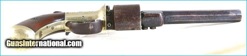 Description: T.K. BAKER, LONDON A .54 caliber PERCUSSION TRANSITIONAL REVOLVER, MODEL 'BAKER'S PATENT REVOLVING LEVER COCK PISTOL', The back strap has the serial number ("No. 1098.") The top of the frame is marked "REGISTERED/APRIL 24 1852." circa 1850's, Has an octagonal 5 1/2 inch barrel. London's Birmingham proof marks on the cylinder, and is a plain six-shot revolver, with rounded boxlock border and scroll engraved action signed 'T.K. BAKER LONDON'... There is a sliding safety on the left, and a central bar hammer signed 'BAKER'S PATENT' with a "Long Cocking Spur Hammer", the revolver has fine Walnut grips and a guarded single action trigger. The long spur hammer has been repaired. This old chesnut still indexes, cocks, and fires. These early TRANSITION REVOLVERS have a certain elegance all their own. SOLD Antique: Yes |