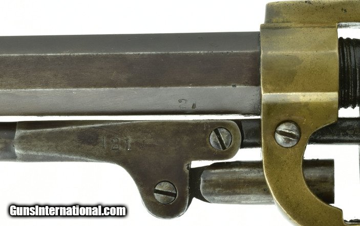 Description: Butterfield Army .44 Percussion Revolver. Manufactured 1861-62 . Approximately 640 manufactured. Brass frame. Butter field markings, patent date and “Philad” on brass top strap. This revolver was made on a US Government contract for 2280 guns but the contract was canceled and only 640 were made. This is serial # 121. Bore is very good, action works perfectly. This revolver uses a disc primer feed which is a tube with primers screwed into the frame just in front of the trigger guard. Barrel has plum Brown even patina - The brass frame has its natural patina and has a very pleasing appearance. The Grips are near excellent, with only two or three light handling marks. As American percussion revolvers go the Butterflied ranks as one of the More unusual inventions of the period. Overall condition is very good plus. Grips are very good. SOLD Antique: Yes |