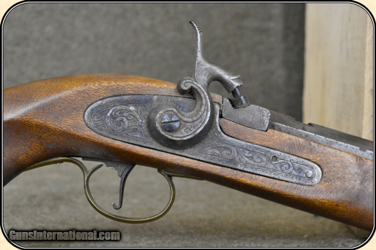 Description: Model: Cap lock pistol Serial Number: 072500 Year of Manufacture: Ca. approximately 1970 Caliber: .45 Action Type: Cap Lock Markings: The top of the barrel is marked “Jukar 072500" Barrel Length: 7 inches Sights / Optics: none Stock Configuration & Condition: excellent Type of Finish: oiled Finish Originality: kit gun Bore Condition: very good Overall Condition: good Mechanics: excellent Box, Paperwork & Accessories: None Our Assessment: Jukar (Made in Spain)5.5" .45 cal blk Powder pistol stainless steel octagon barrel (nice clean hard brown wood stock)Cap & ball w/external hammer. (see Pictures) No FFL required because it's black powder. SOLD Antique: Yes |