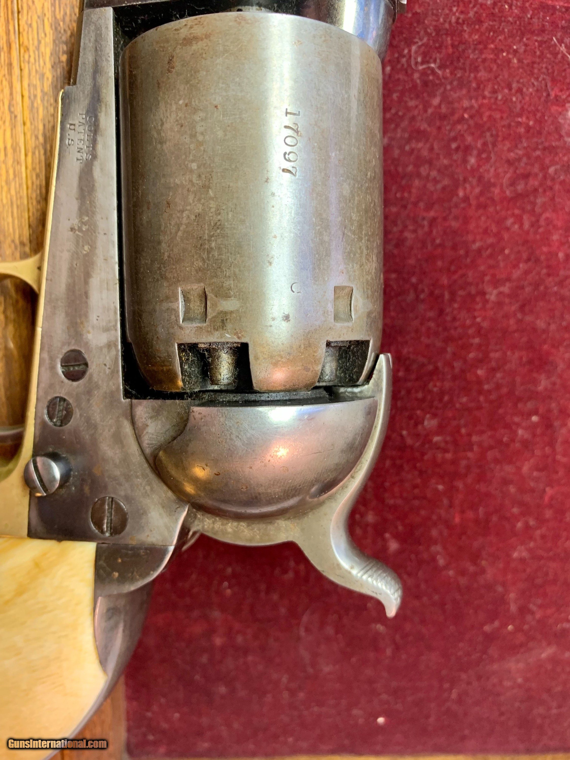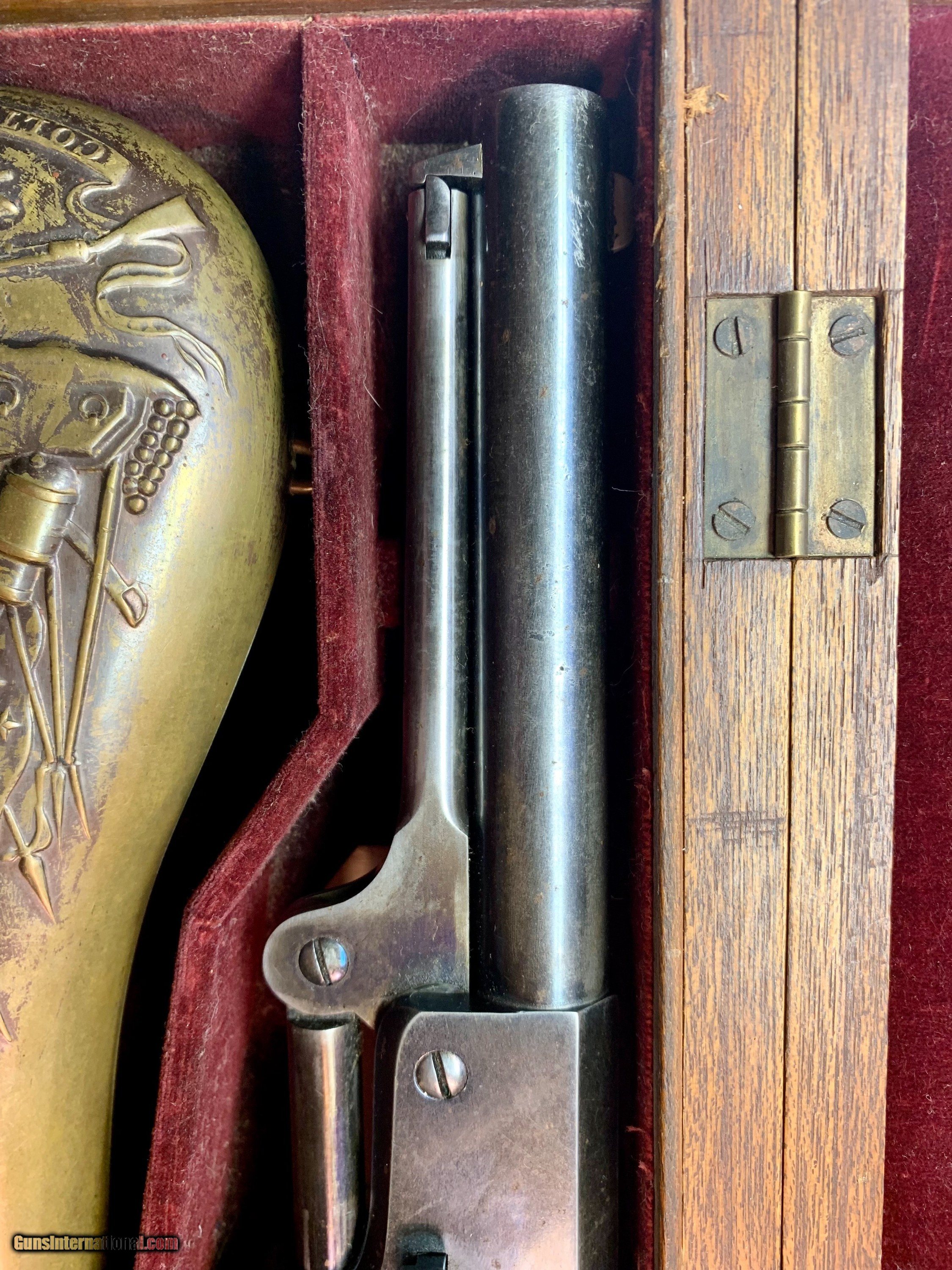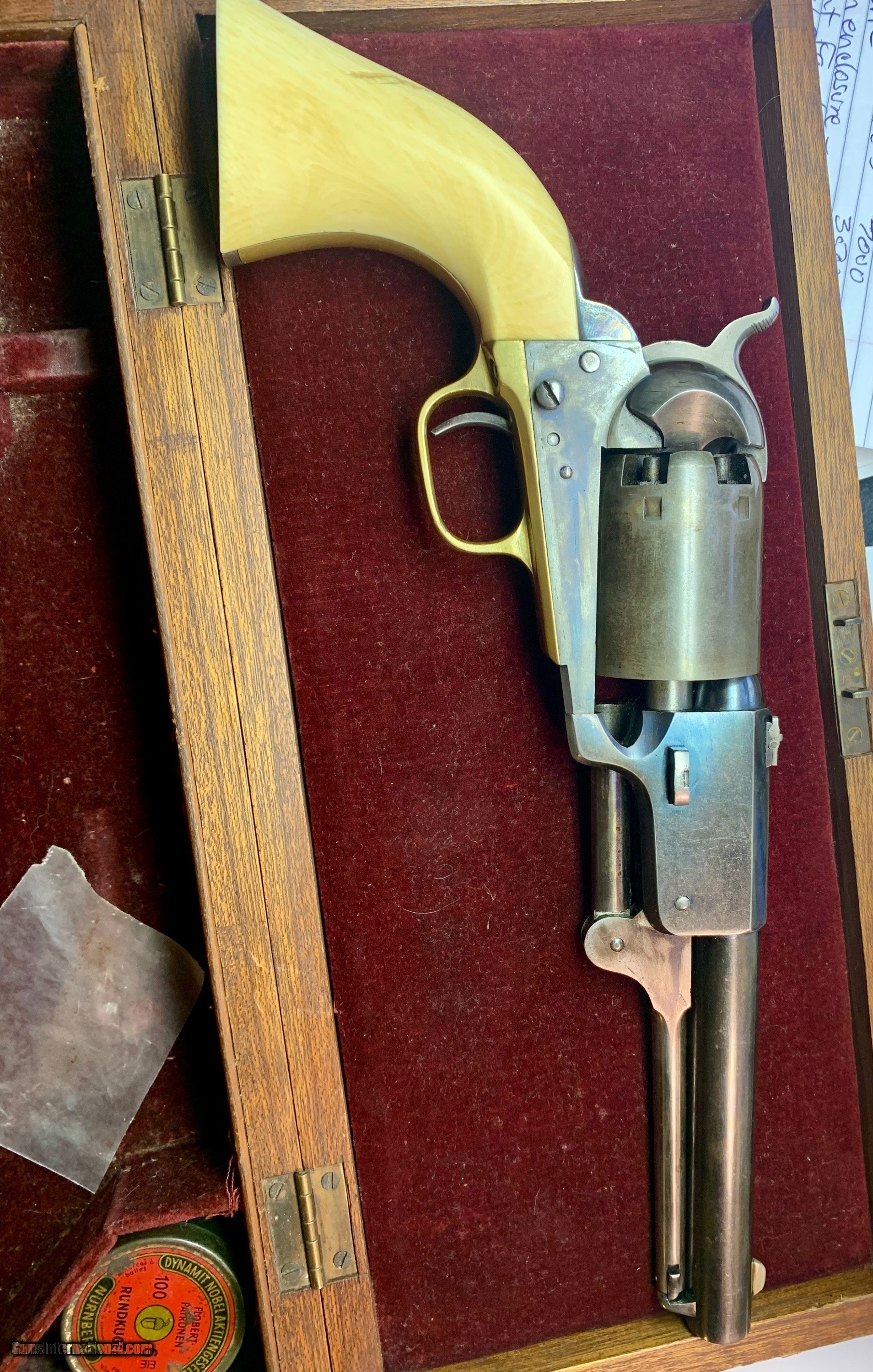 Description: Beautiful all numbers matching gun, Civilian marked, beautiful finish retained, factory ivory grips, matching original case 7 1/2" Barrel, .44 caliber Serial # 17097 SOLD Antique: Yes |