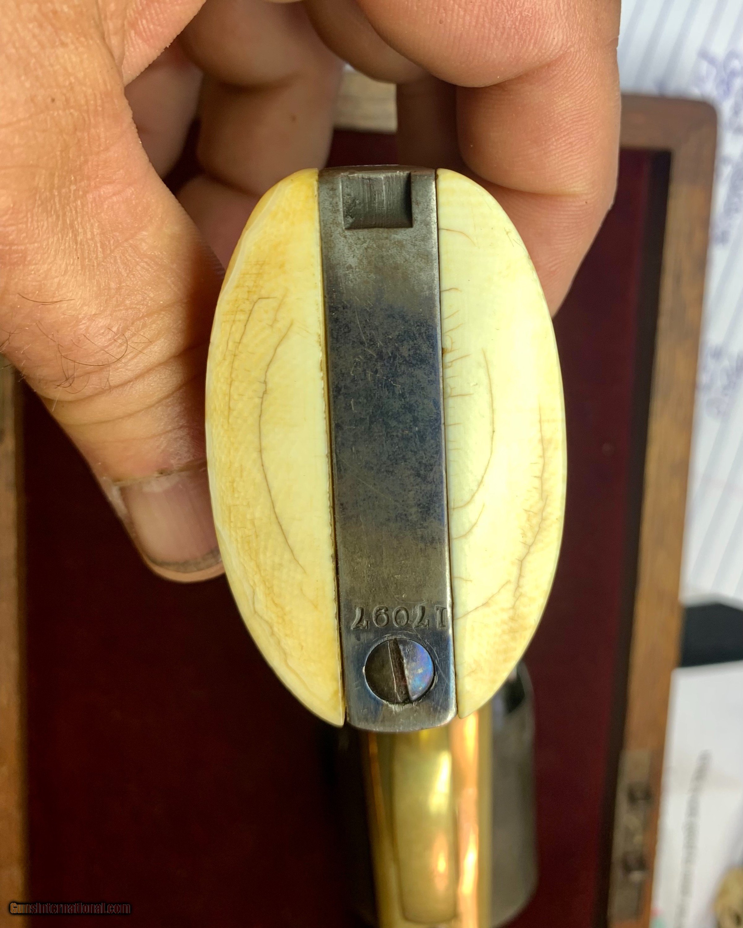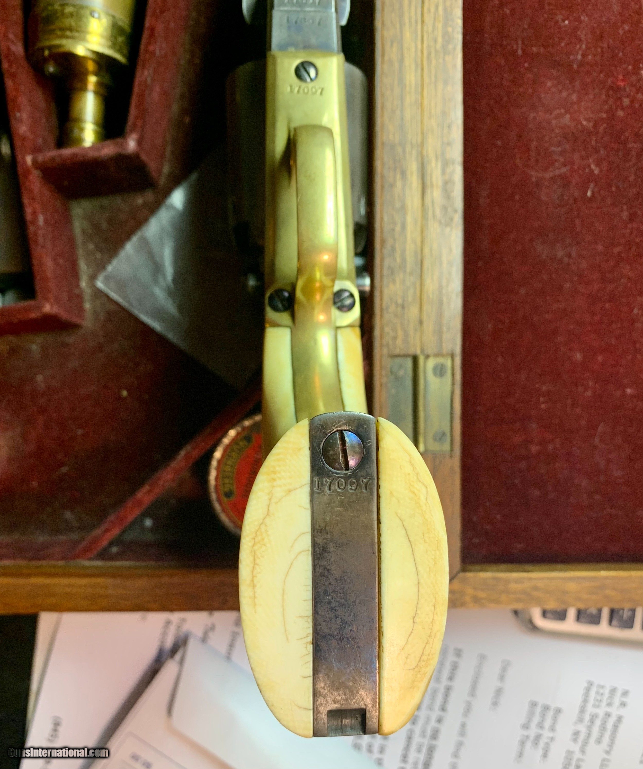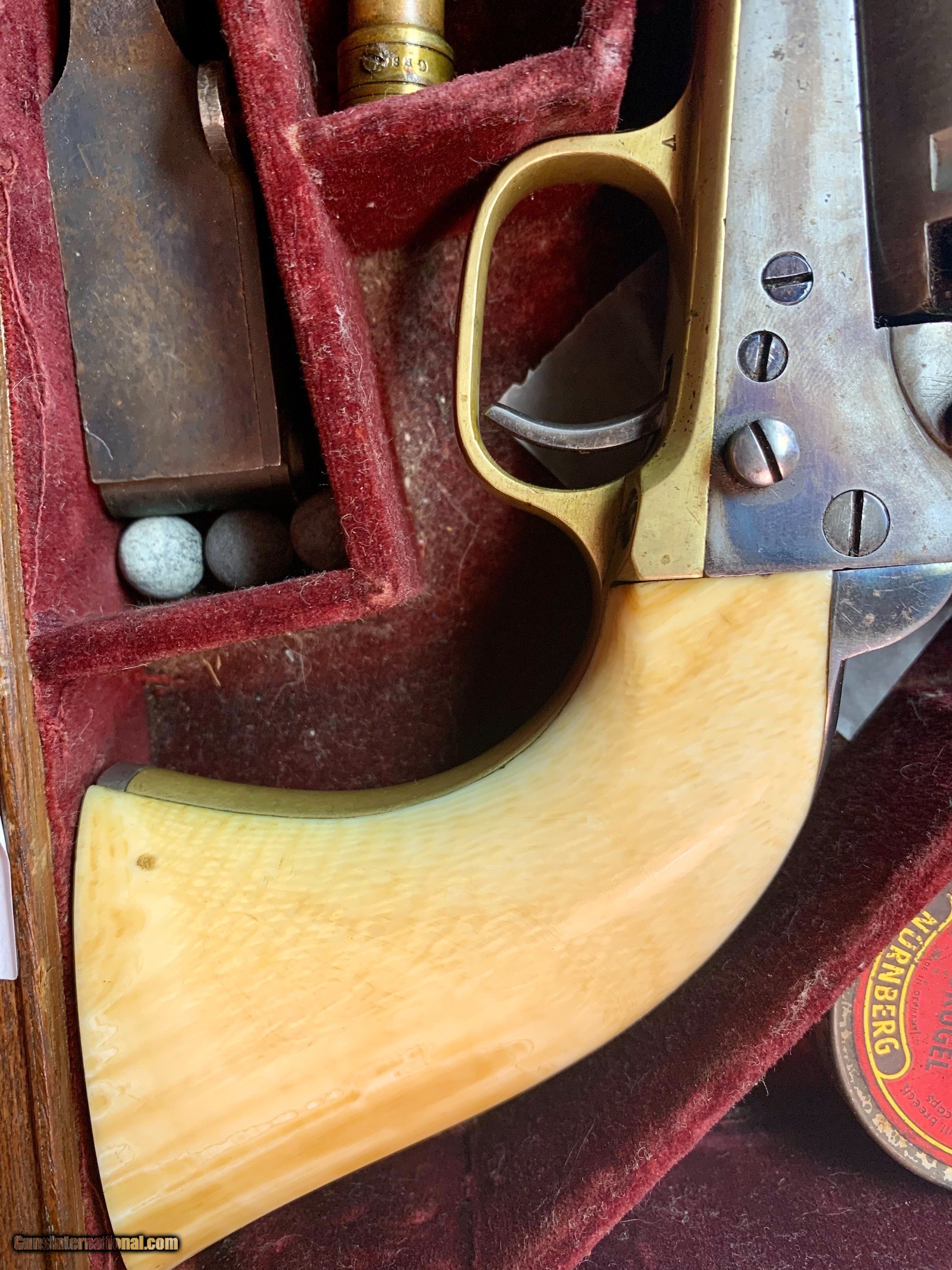 Description: Beautiful all numbers matching gun, Civilian marked, beautiful finish retained, factory ivory grips, matching original case 7 1/2" Barrel, .44 caliber Serial # 17097 SOLD Antique: Yes |