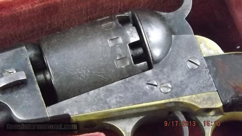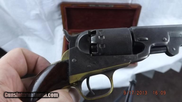 S/N 7621, these Navy type pistols were manufactured between 1859 and 1868. This is the second of 5 types made with total production aroud 78,000. This one has a 6 1/2" octogon barrel. All barrel markings are sharp and clear, as are the panel scenes around the cylinder. The lockup works fine and is tight. There are areas of light pitting, but very slight. There is still some blue around the takedown wedge. The grips still retain most of the original finish. Overall a very nice grey gun. Included in the period case is a powder flask and a Manhatten marked bullet mold.