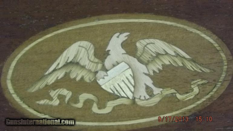 Description: S/N 7621, these Navy type pistols were manufactured between 1859 and 1868. This is the second of 5 types made with total production aroud 78,000. This one has a 6 1/2" octogon barrel. All barrel markings are sharp and clear, as are the panel scenes around the cylinder. The lockup works fine and is tight. There are areas of light pitting, but very slight. There is still some blue around the takedown wedge. The grips still retain most of the original finish. Overall a very nice grey gun. Included in the period case is a powder flask and a Manhatten marked bullet mold. As always, we will entertain any legitimate offer, we love trades and are happy to do lay a ways at 30% down and balance in 90 days. We also are well informed on International Shipments and are registered dealers to ship to CA and welcome all of your business. If you are looking for something specific, please let us know as we get upwards of 50 new guns a month and will always buy guns, parts, memorbilia, Vintage Western holsters, collectable ammo, Old scopes and sights, grips, etc, etc. We attend many National shows and look forward to meeting with you at one of these venues. SOLD Antique: Yes Manufacturer: Manhatten Model: Navy Serial Number: 7621 Caliber Info: 36 |