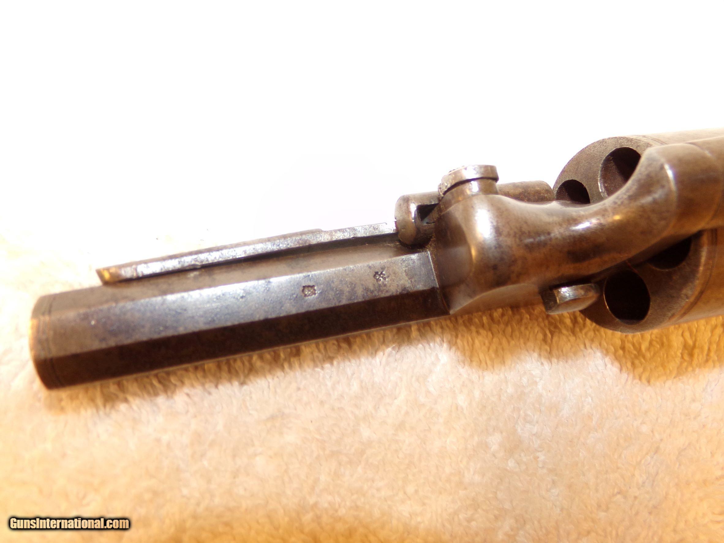 Description: This “self cocking” London D.A. revolver was made by a gunmaker between 1857-1863. The revolver is maker marked. “Gilks & Co Tower Hill London” is engraved on the top of the barrel. In addition to the maker marks there are numerous London proof marks. The revolver is an English 120 bore or about a .34 cal. The metal has a silver gray patina with some scattered black staining. The grips are excellent. The revolver is complete and original. The bore is clean and shows some scattered roughness. The nipples show very little wear. The barrel is 3 ½” long and the revolver is about 8 ½” overall. This is a rare wedge frame model. The trigger requires a strong squeeze to make the double action work and the trigger has to be nudged forward to return to the ready position after the hammer falls. I think the trigger spring adjusting screw may be stripped because it cannot be tightened much. Overall it’s a nice little Civil War period firearm (1857-1863) imported from England as were many other items especially by the South. Paypal is a payment option but only if the "To Family and Friends" option is used. SOLD |
