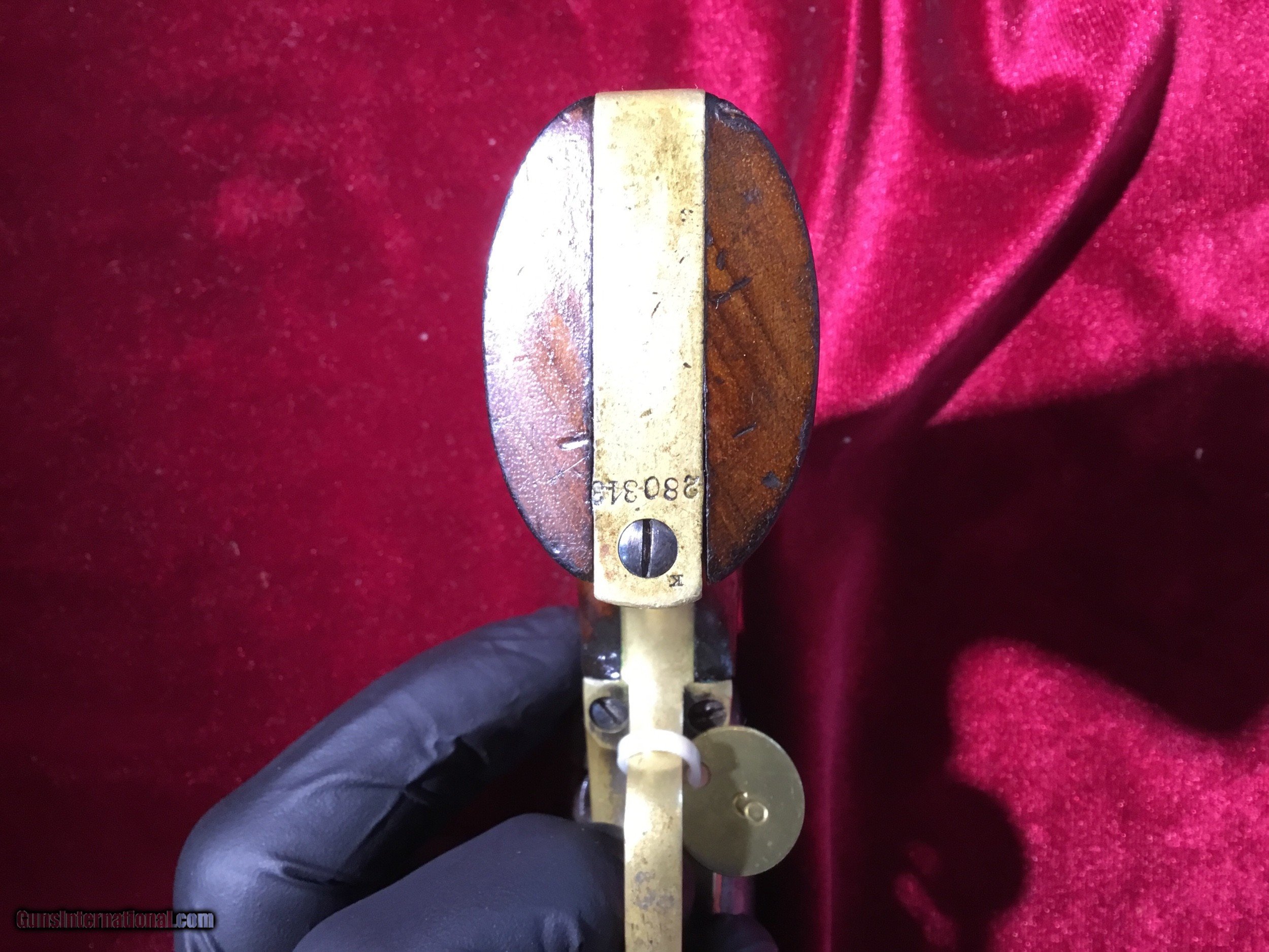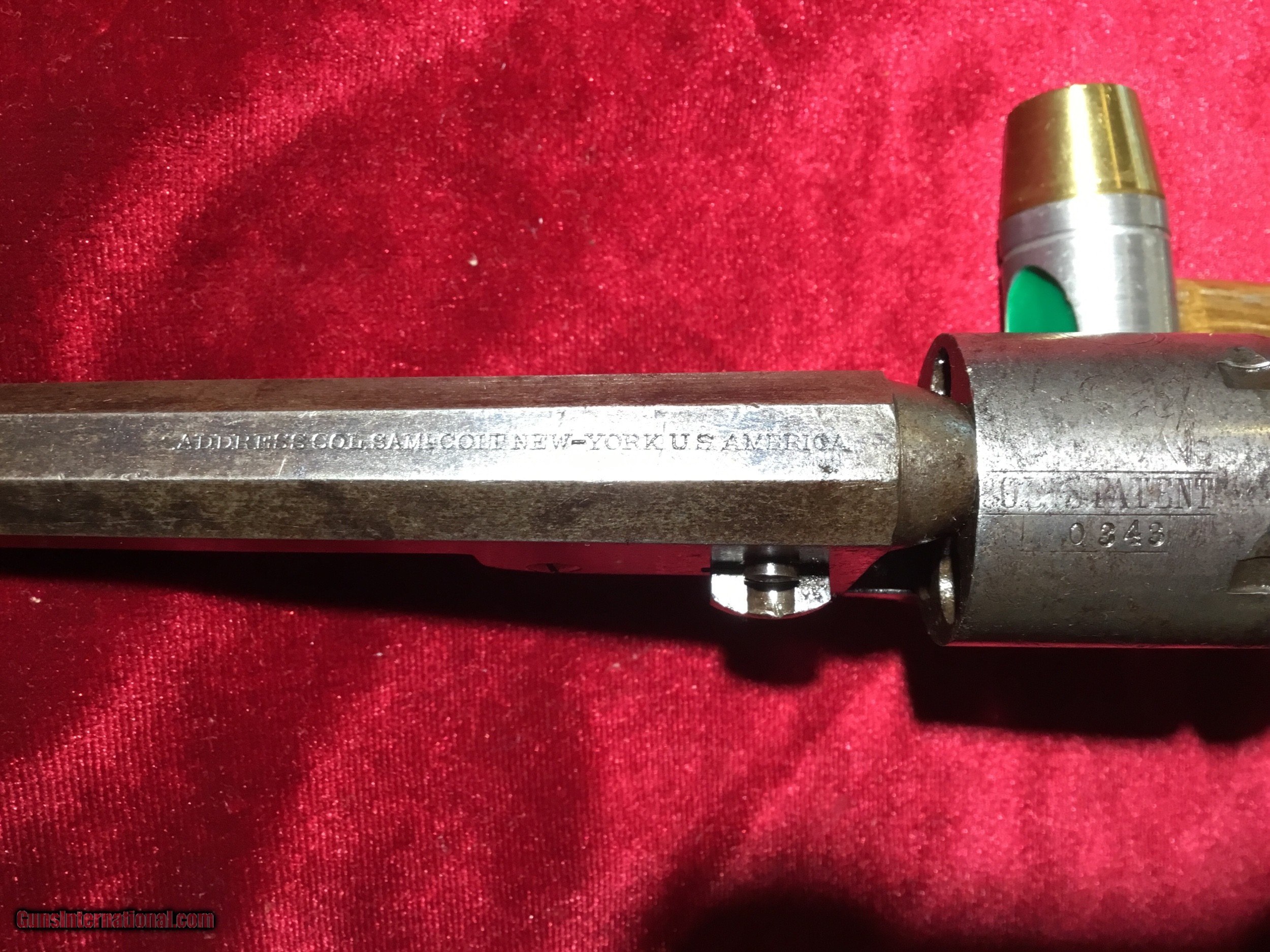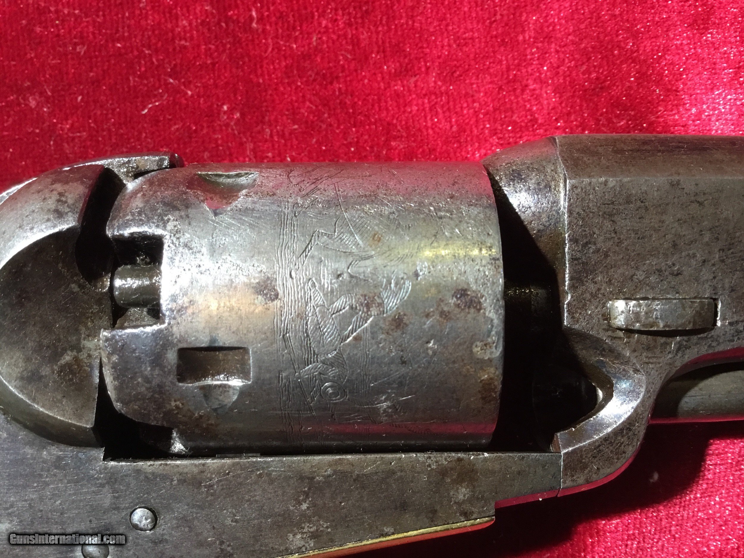 Description: Colt 1849 Pocket Model .31 cal - Mfg 1866 with matching numbers. Once Samuel Colt had great success with his miltary contracts it was an easy decision to enter the civilian market, and he did it by reducing the size of his massive Walker . The first pocket models were called “Colt Baby Dragoon’s“ and became hugely popular. These were very, very small, light and handy pistols for their day (especially for a 5 shot repeater)! This one has a 4” barrel, with very little holster wear. The front sight is sharp and very “pointy “. There is a stagecoach robbery scene on the cylinder and stamped “ COLTS PATENT” then “ No 0343”. See the photos. The matching numbers are on the lower barrel frame, the frame, the trigger guard, the cylinder, the bottom of the back strap, and the barrel wedge! The barrel is marked “ADDRESS COL. SAML.COLT NEW-YORK US AMERICA”. On the left side the frame is marked “COLT PATENT”. The left side of the brass trigger guard is marked “31 CAL” and forward of it, is a very small “ P”. The wooden grips are nice and most of the varnish is still on the grips. There is no silver plate left at all on the trigger guard. Very nice example of a rare piece. Thanks for looking, call if you have any questions. No international shipping. SOLD Antique: Yes Manufacturer: Colt Model: 1849 Pocket Model Serial Number: 280343 Caliber Info: .31 Wood Condition: Nice Barrels: 1 Barrel Type: 4 inch Weight: 1.5 lbs |
