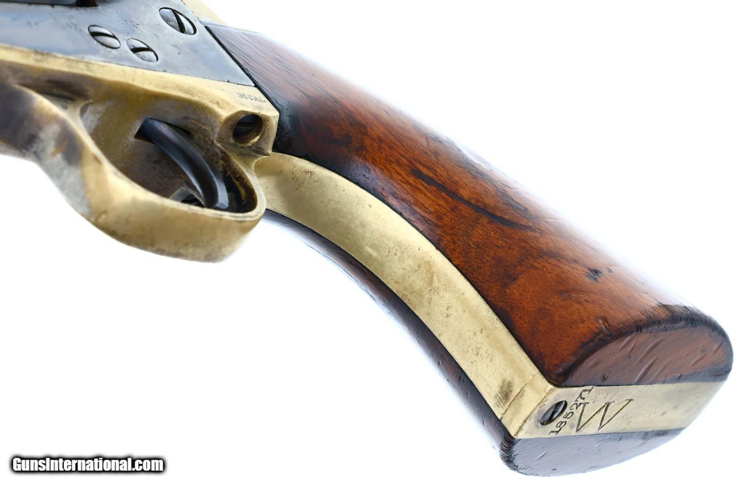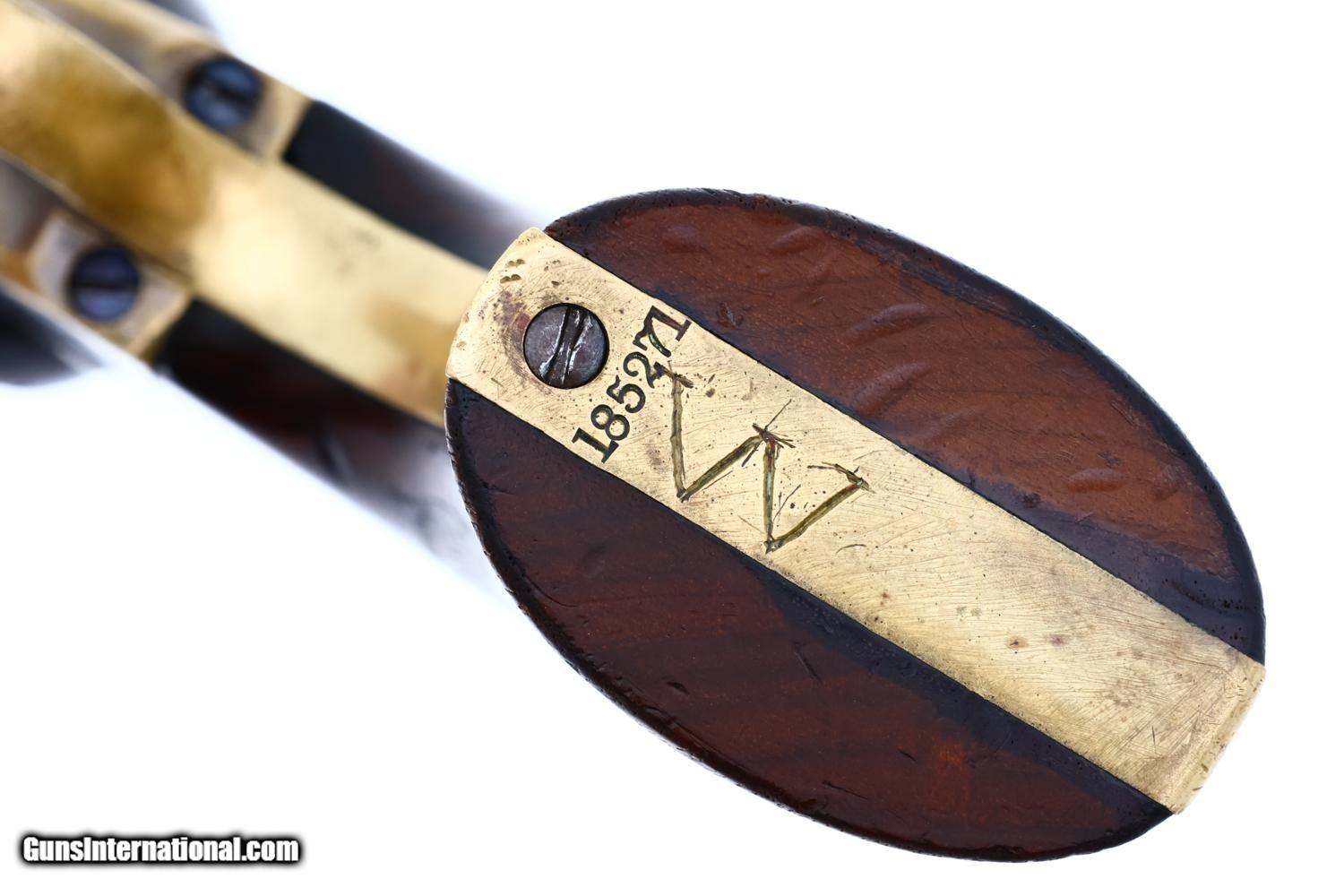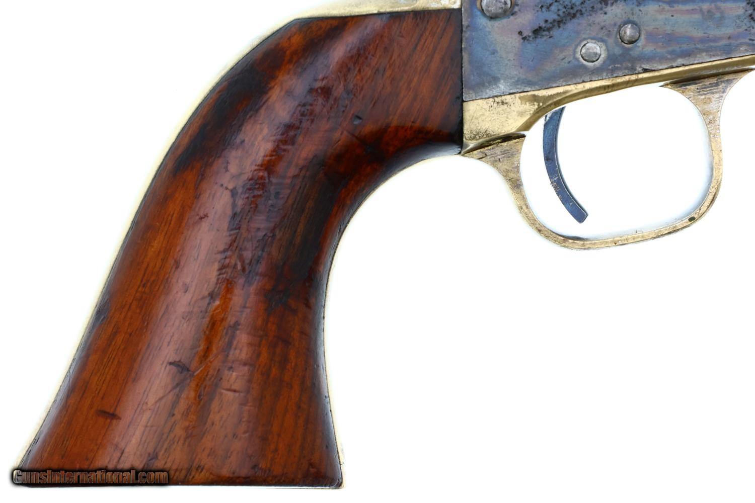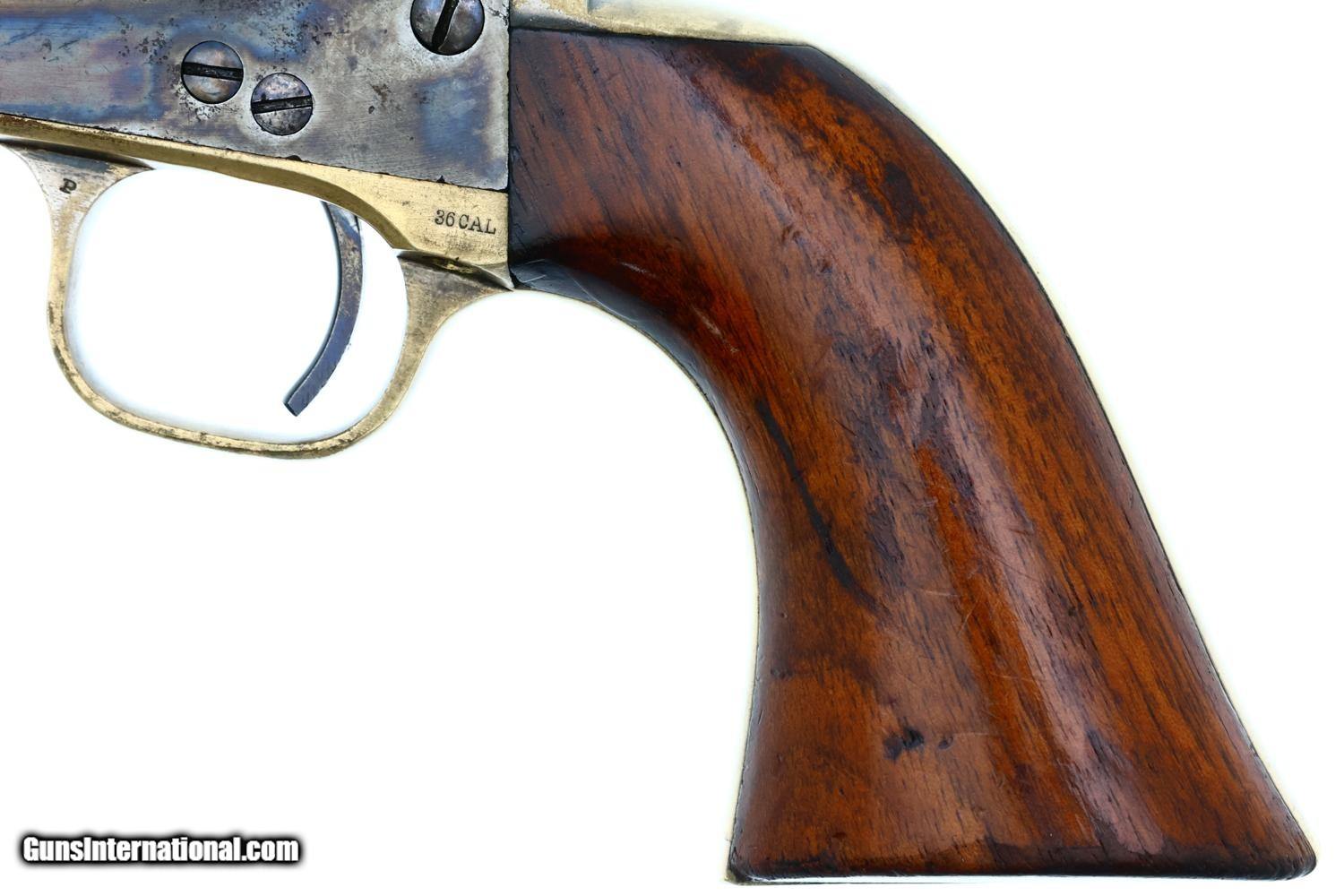 VG/VG+ original high luster blue on the barrel (whose front sight is a replacement) and cylinder, with sharp edge wear and patchy areas of thinning. Comparable condition color case hardening with the colors more vivid on the ramrod lever than on the hammer or frame whose ears have begun to tone, fine pinprick indentations on both ears, mainly the left. Bottom of backstrap with a prominently inscribed "W". Grips with most of their original finish, scattered oil darkened handling marks, the right panel with a noticeable patch of missing varnish centrally. Mirror bright bore. Correct manual mechanics with each cylinder indexing properly upon full cock. ANTIQUE!