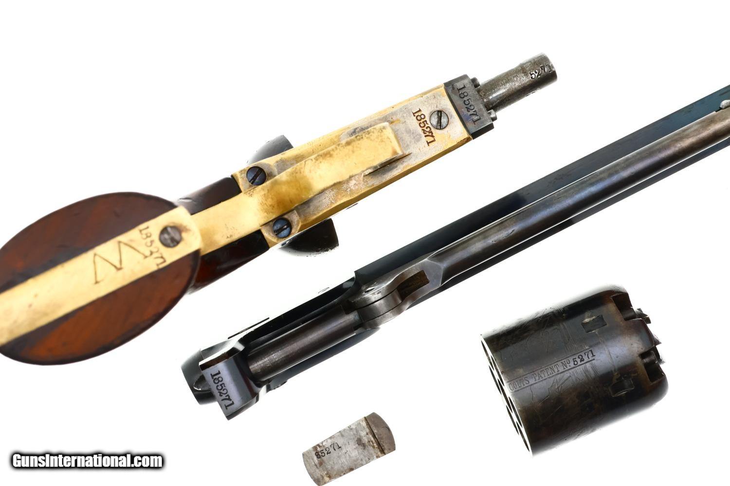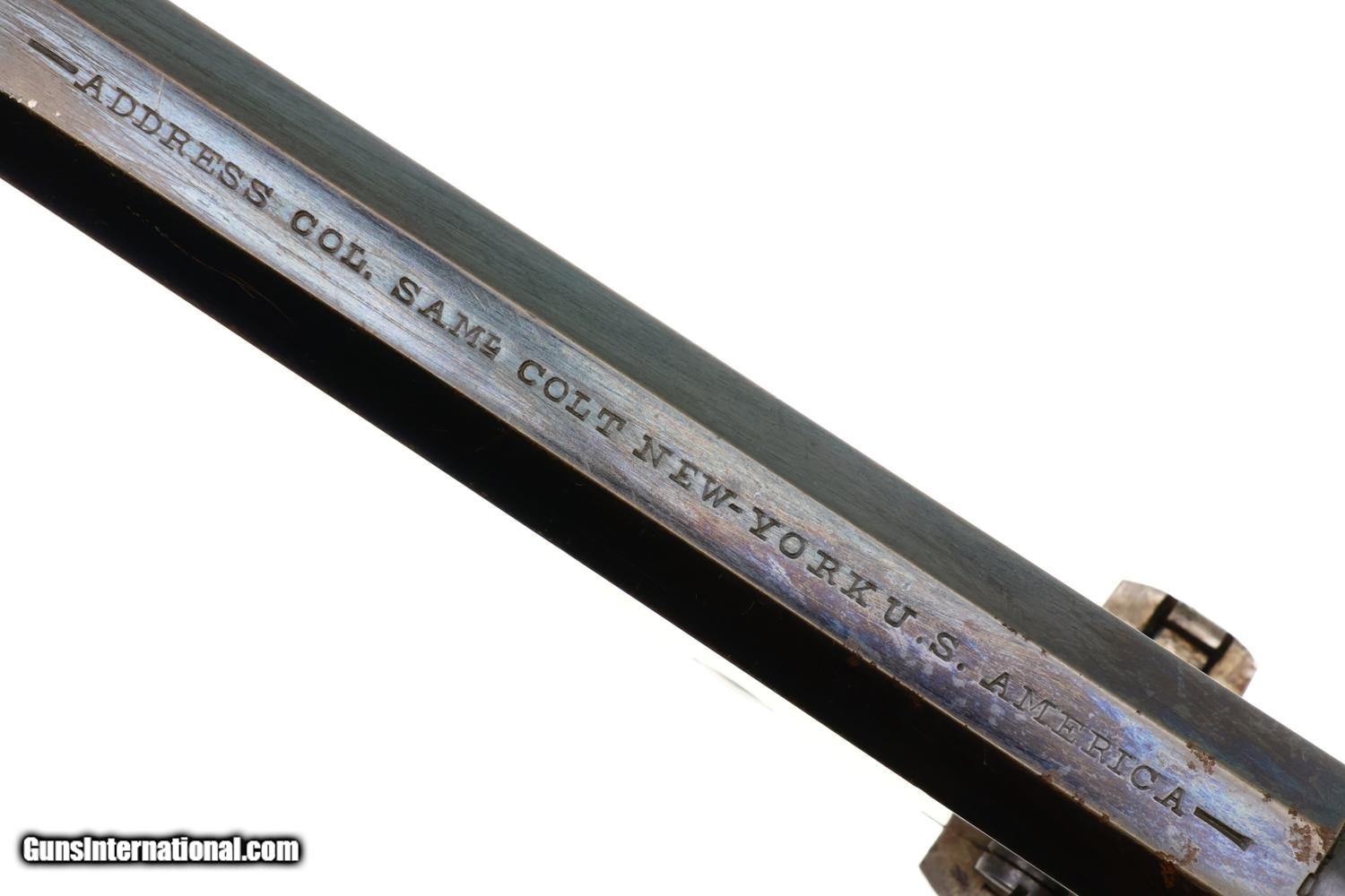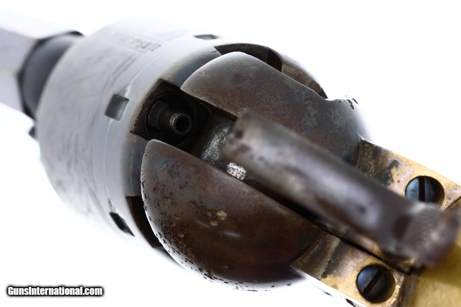VG/VG+ original high luster blue on the barrel (whose front sight is a replacement) and cylinder, with sharp edge wear and patchy areas of thinning. Comparable condition color case hardening with the colors more vivid on the ramrod lever than on the hammer or frame whose ears have begun to tone, fine pinprick indentations on both ears, mainly the left. Bottom of backstrap with a prominently inscribed "W". Grips with most of their original finish, scattered oil darkened handling marks, the right panel with a noticeable patch of missing varnish centrally. Mirror bright bore. Correct manual mechanics with each cylinder indexing properly upon full cock. ANTIQUE!