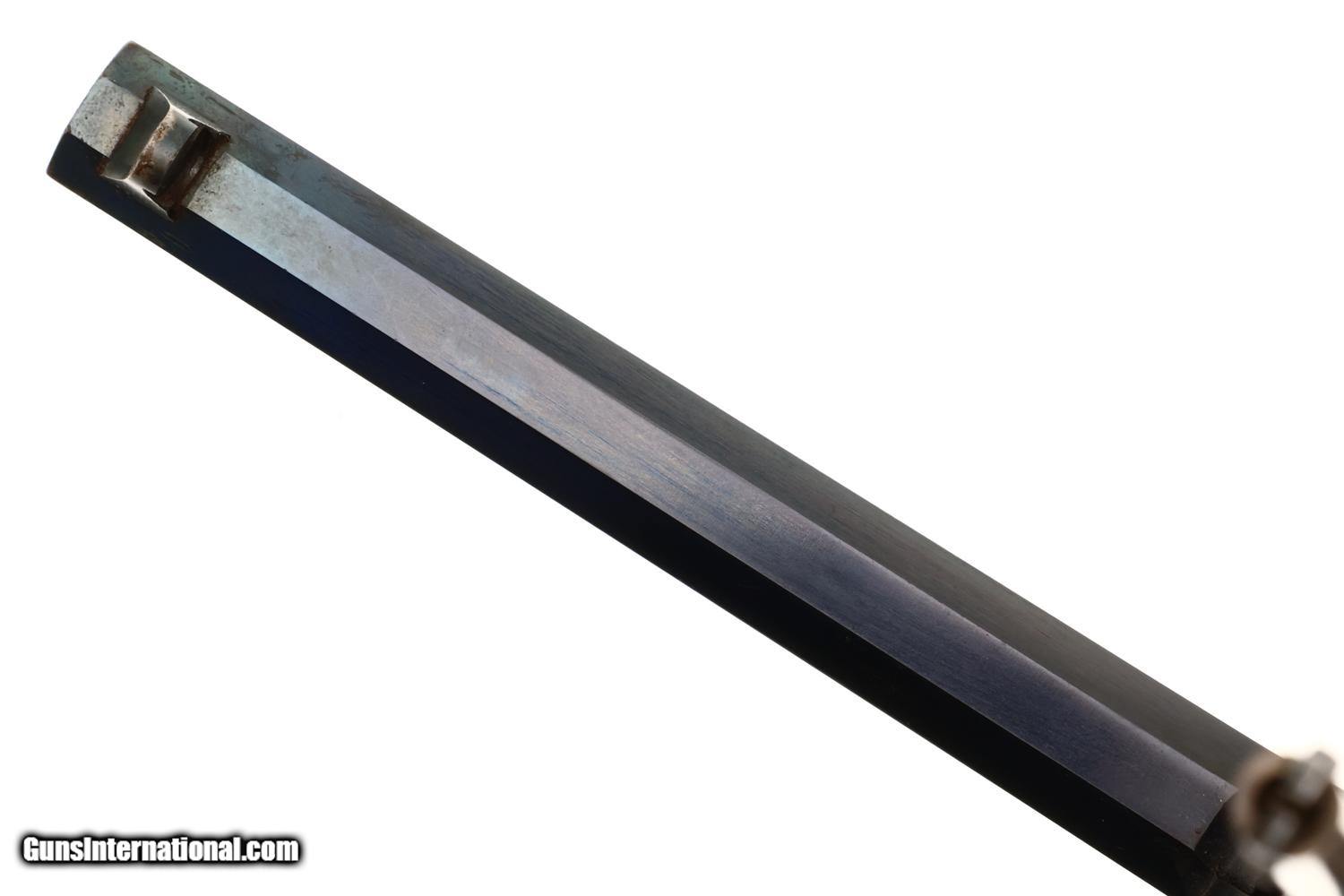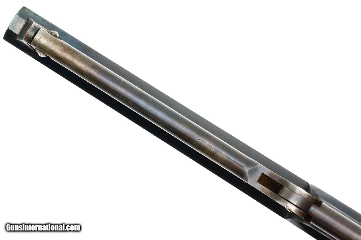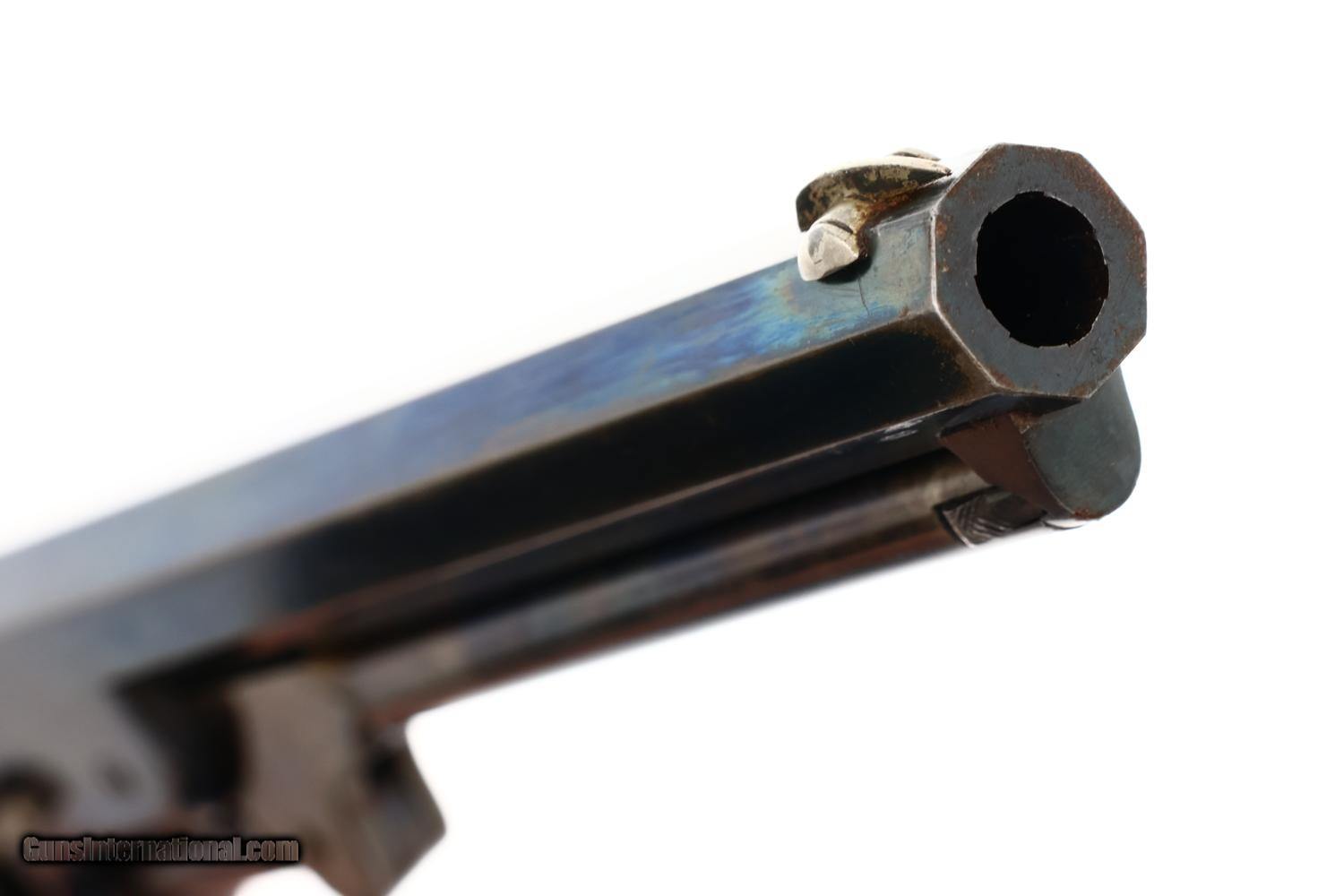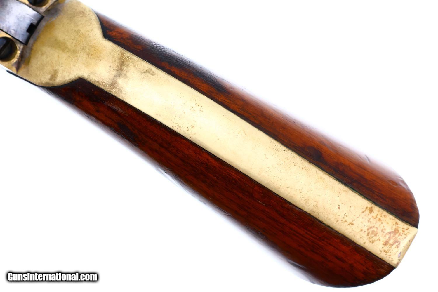 VG/VG+ original high luster blue on the barrel (whose front sight is a replacement) and cylinder, with sharp edge wear and patchy areas of thinning. Comparable condition color case hardening with the colors more vivid on the ramrod lever than on the hammer or frame whose ears have begun to tone, fine pinprick indentations on both ears, mainly the left. Bottom of backstrap with a prominently inscribed "W". Grips with most of their original finish, scattered oil darkened handling marks, the right panel with a noticeable patch of missing varnish centrally. Mirror bright bore. Correct manual mechanics with each cylinder indexing properly upon full cock. ANTIQUE!
