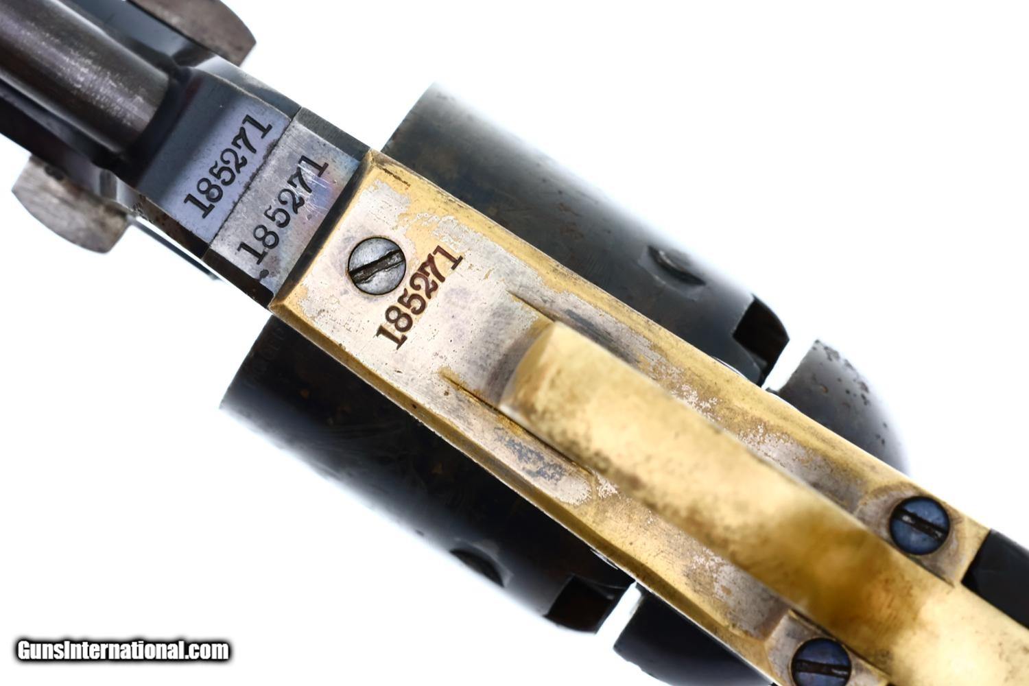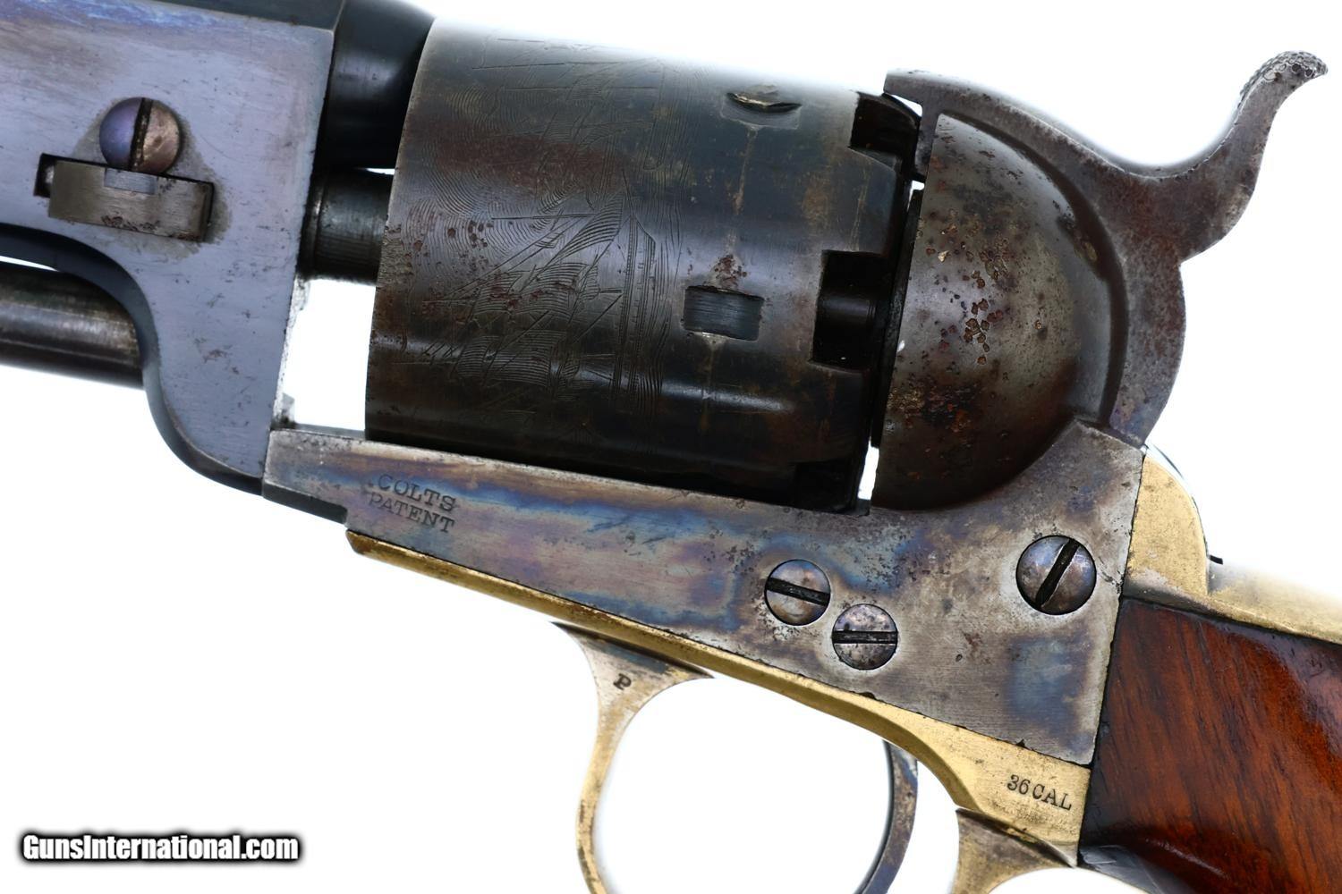 Standard configuration and all-matching Colt 1851 Navy Commercial revolver in .36 percussion, SN: 185271, made from 1850-1873, this example circa 1866, with 7.5-inch octagonal barrel and six-shot percussion cylinder. Drift adjustable front sight, hammer notch rear sight. Top of barrel marked “ADDRESS COL. SAML COLT NEW-YORK U.S. AMERICA”. Left side of frame marked: "COLTS PATENT". Brass backstrap and trigger guard, left side marked "36 CAL." Matching serial number “185271” appearing on the frame, trigger guard housing, underside of barrel, and butt. Cylinder, locking wedge, and cylinder axle marked with "5271", the last four digits of the serial number. The cylinder displays Waterman Ormsby’s engraved scene depicting the victory of the Second Texas Navy at the Battle of Campeche on May 16, 1843, a naval theme chosen by Colt as appreciation to the Texas Navy who had purchased the earlier Colt Paterson Revolver though, despite the “Navy” designation, this model was chiefly purchased by civilians and military land forces. Fitted with smooth walnut grips, neither panel with a cartouche.