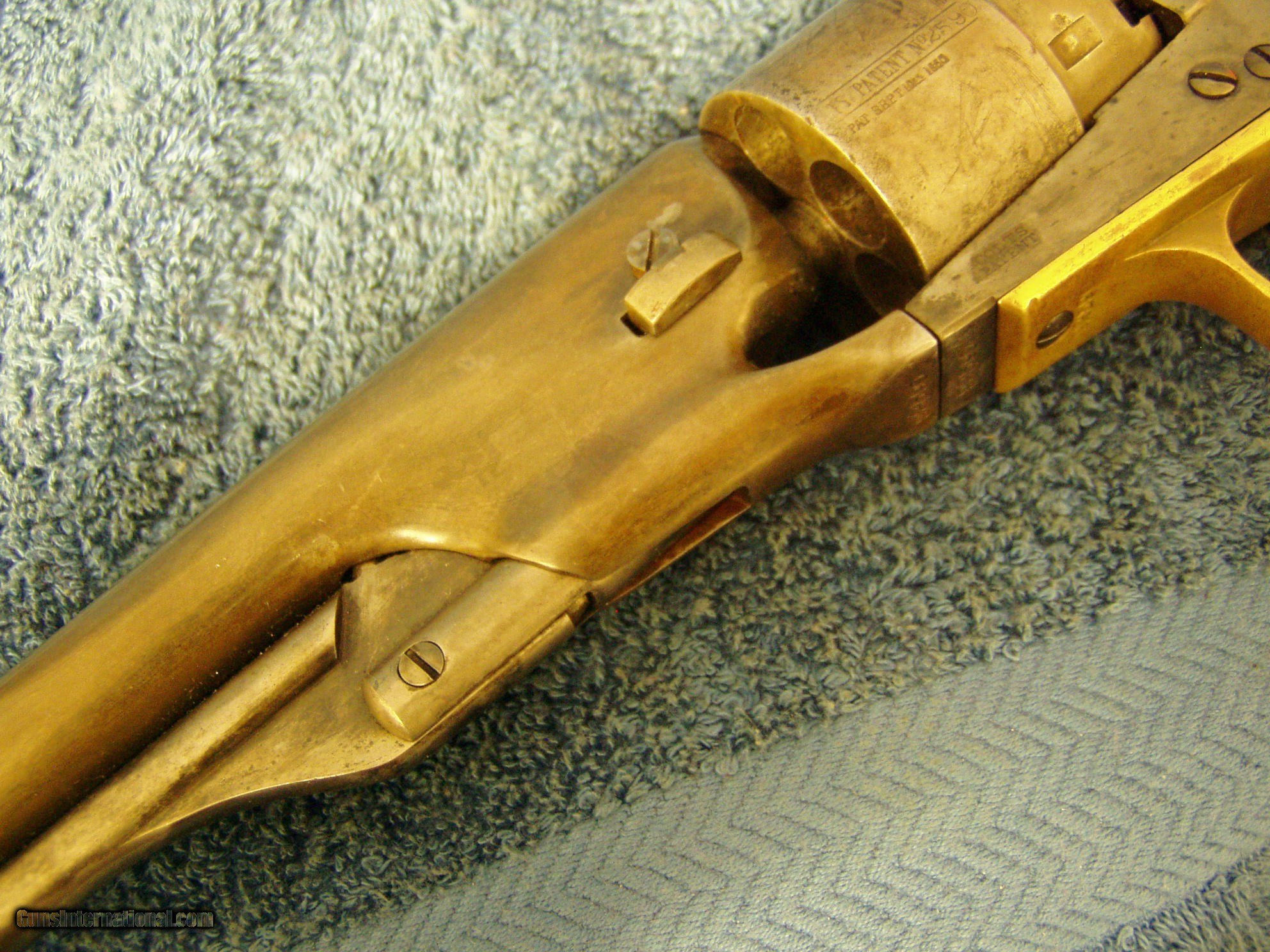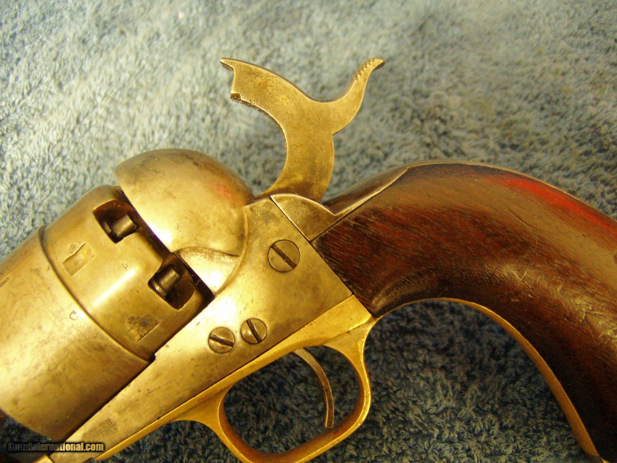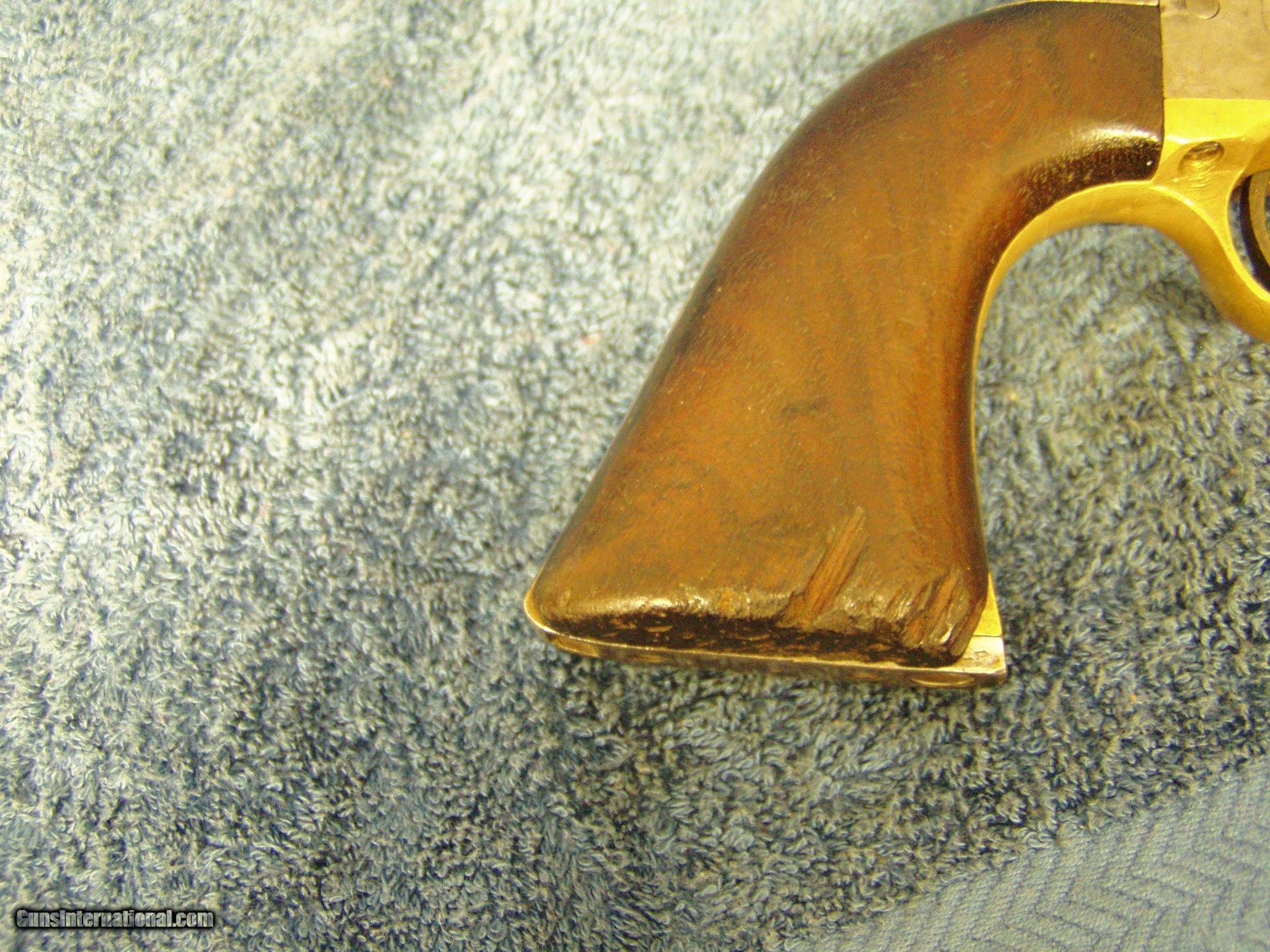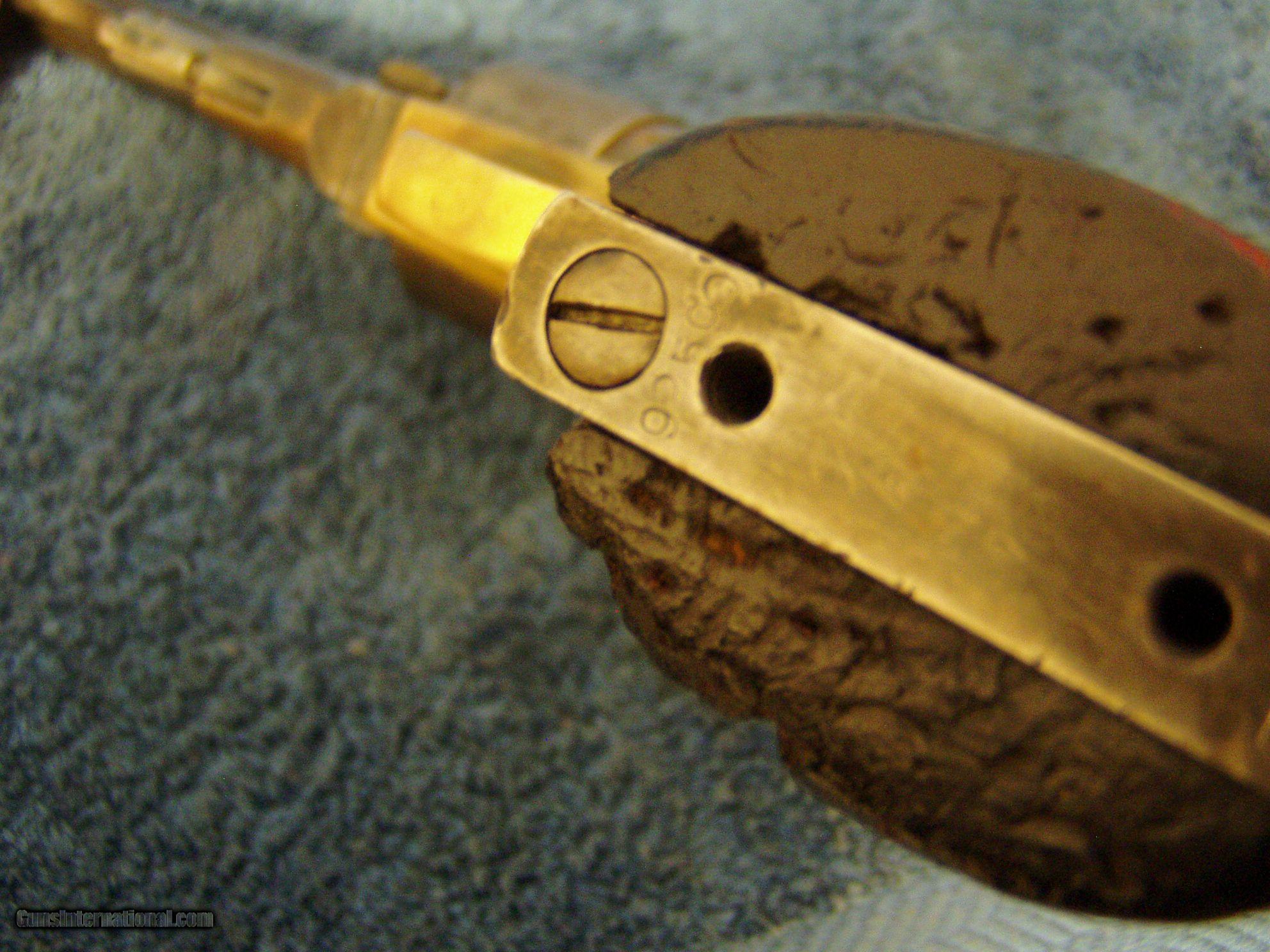 Description: This is a very nice used Colt 1860 Army Revolver. Three screw .44 caliber, percussion, with an 8" barrel and a strong bore, showing pitting. Serial number #92590 and all matching numbered parts including the arbor and wedge. Circa 1863 during the Civil War. Approx. 90% of cylinder scene remains visible. "COLT'S/PATENT" on left side of frame is also lightly struck. Has military inspector's markings on barrel, backstrap and trigger guard. Barrel address reads: "ADDRESS COL. SAML COLT NEW-YORK U.S. AMERICA". Indexes properly and has no looseness in action. Walnut grips show small loss on edges and some shrinkage. Has a brass trigger guard and a steel backstrap with a small screw in upper neck area along with two small drilled holes in buttplate, possibly for a lanyard attachment. Has original grips that are solid and show some loss on right side. The government inspector cartouches on each side are thin, and barely visible. Metal finish are a pleasing, lightly cleaned , grey patina. Buyer pays $25.00 shipping to lower 48 states. International shipping is $90.00 for Express Shipping to most locations, plus a $20.00 Bank Wire Fee. I accept USPS Money orders or Bank cashier's check. Add 3% for Credit Card Purchase. Will accept personal check, with shipping hold. 3 day ,non- disassembly, non firing inspection period. If returned for any reason, full refund less shipping. More pictures available. Layaway Available. Antique SOLD Antique: Yes Manufacturer: COLT Model: MODEL 1860 ARMY Serial Number: Serial #92590 Caliber Info: .44 Percussion Bore: 8 inches Chambers: 6 shot Condition: Very Good Metal Condition: Very Good Wood Condition: solid, very good, light loss Bore Condition: Very strong, light pitting Barrels: ONE Barrel Type: round Action: Single Action Triggers: one Finish: PATINA Weight: 2.5 lbs. Sights: open Manufacture Date: 1863-64 |