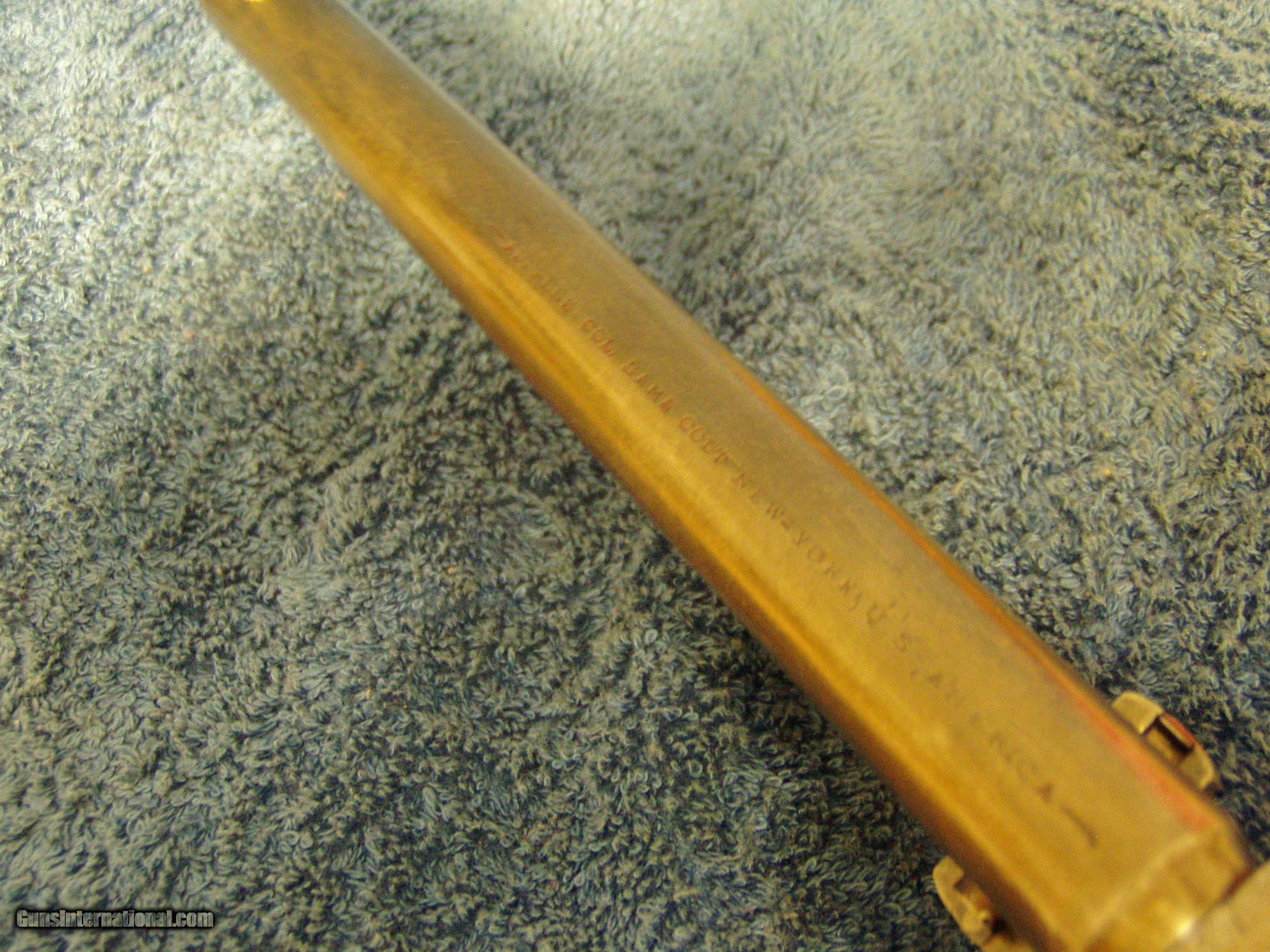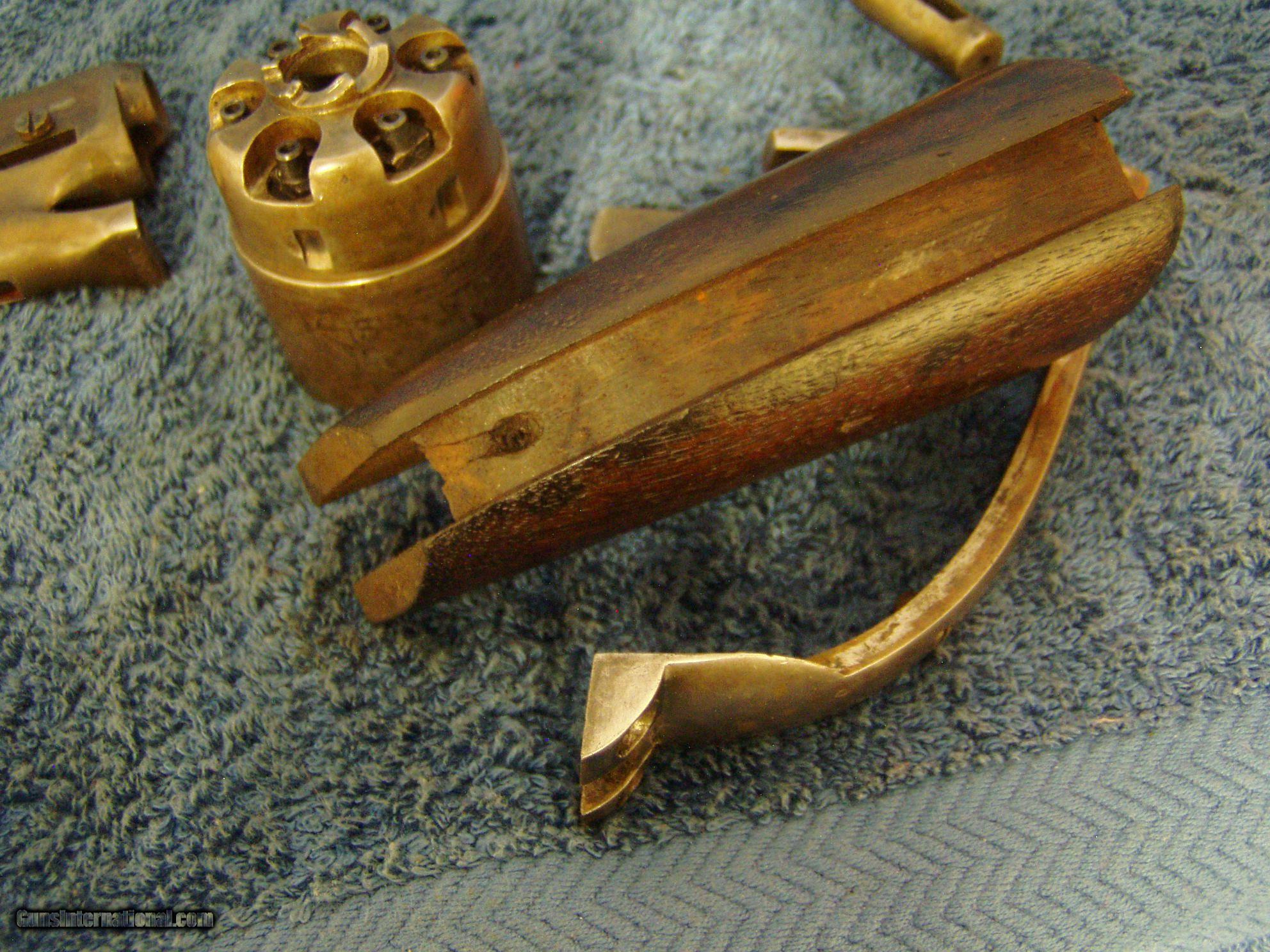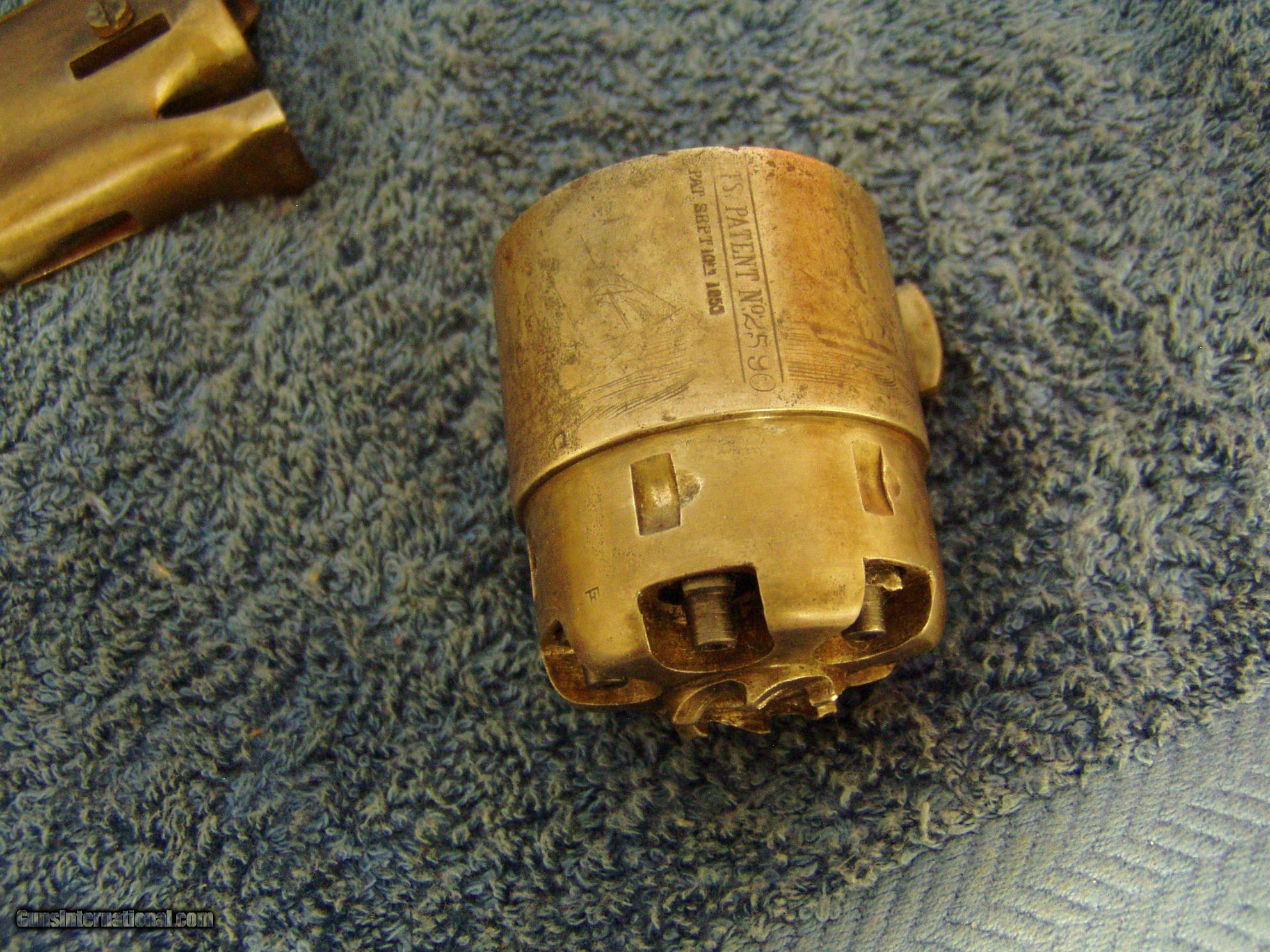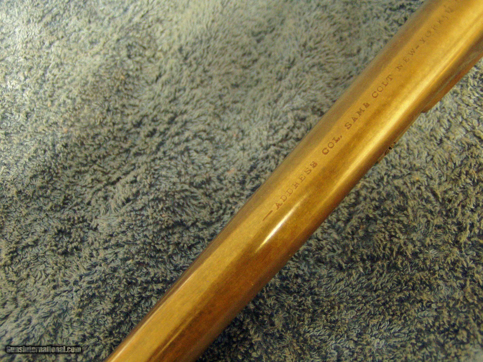 Description: This is a very nice used Colt 1860 Army Revolver. Three screw .44 caliber, percussion, with an 8" barrel and a strong bore, showing pitting. Serial number #92590 and all matching numbered parts including the arbor and wedge. Circa 1863 during the Civil War. Approx. 90% of cylinder scene remains visible. "COLT'S/PATENT" on left side of frame is also lightly struck. Has military inspector's markings on barrel, backstrap and trigger guard. Barrel address reads: "ADDRESS COL. SAML COLT NEW-YORK U.S. AMERICA". Indexes properly and has no looseness in action. Walnut grips show small loss on edges and some shrinkage. Has a brass trigger guard and a steel backstrap with a small screw in upper neck area along with two small drilled holes in buttplate, possibly for a lanyard attachment. Has original grips that are solid and show some loss on right side. The government inspector cartouches on each side are thin, and barely visible. Metal finish are a pleasing, lightly cleaned , grey patina. Buyer pays $25.00 shipping to lower 48 states. International shipping is $90.00 for Express Shipping to most locations, plus a $20.00 Bank Wire Fee. I accept USPS Money orders or Bank cashier's check. Add 3% for Credit Card Purchase. Will accept personal check, with shipping hold. 3 day ,non- disassembly, non firing inspection period. If returned for any reason, full refund less shipping. More pictures available. Layaway Available. Antique SOLD Antique: Yes Manufacturer: COLT Model: MODEL 1860 ARMY Serial Number: Serial #92590 Caliber Info: .44 Percussion Bore: 8 inches Chambers: 6 shot Condition: Very Good Metal Condition: Very Good Wood Condition: solid, very good, light loss Bore Condition: Very strong, light pitting Barrels: ONE Barrel Type: round Action: Single Action Triggers: one Finish: PATINA Weight: 2.5 lbs. Sights: open Manufacture Date: 1863-64 |