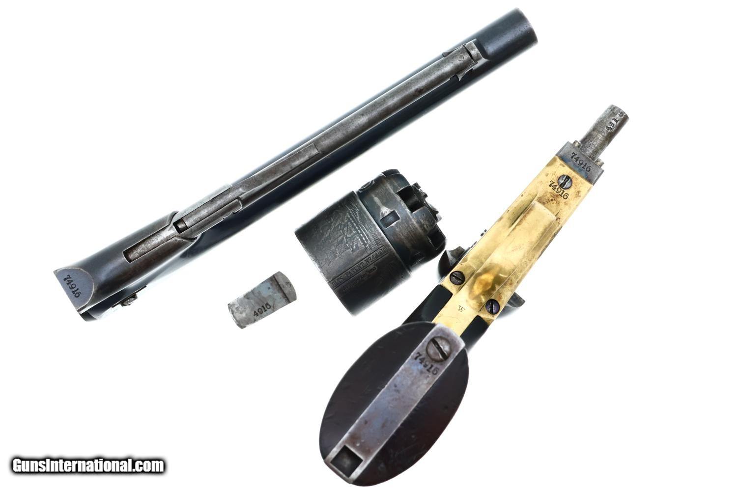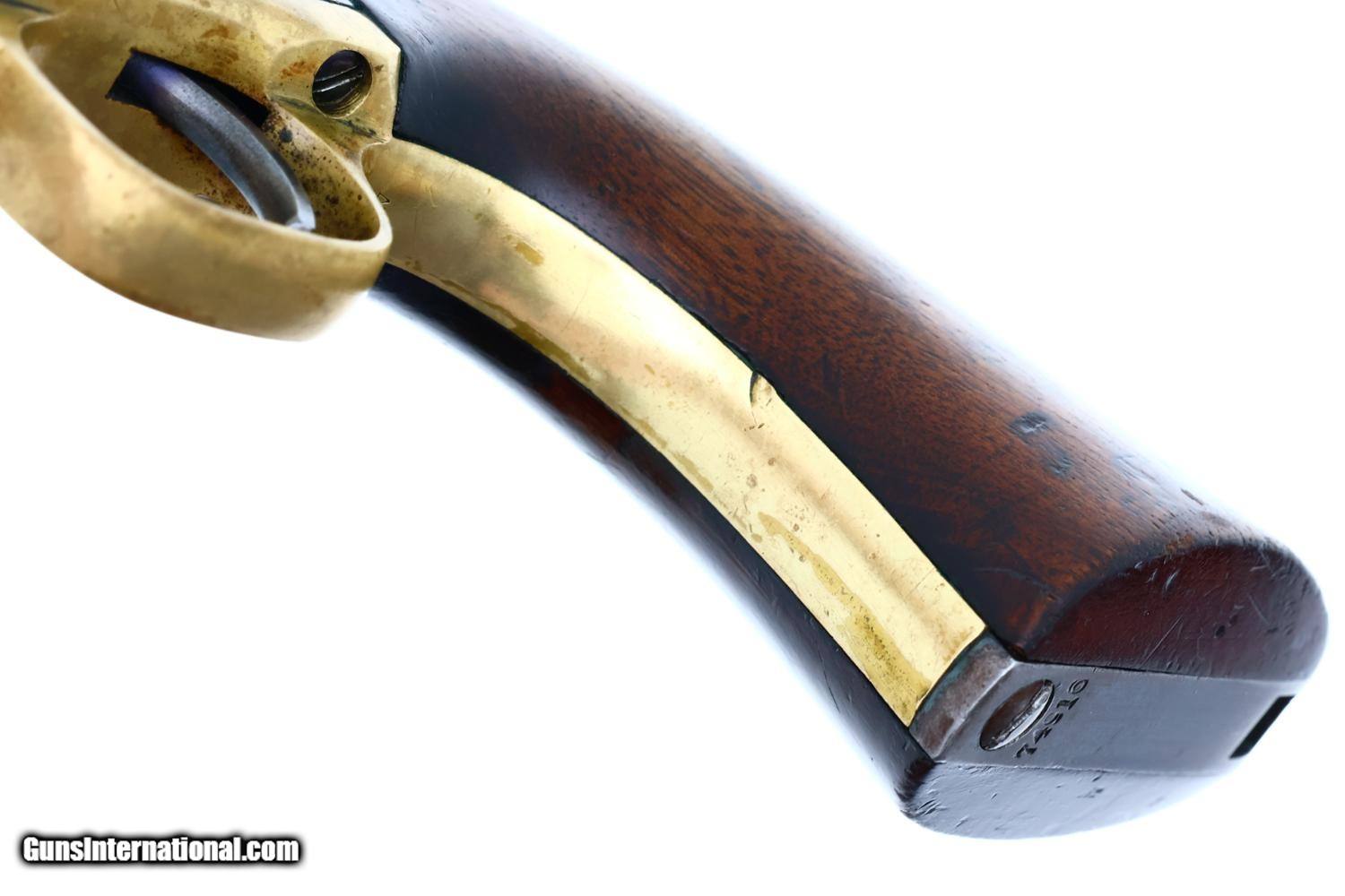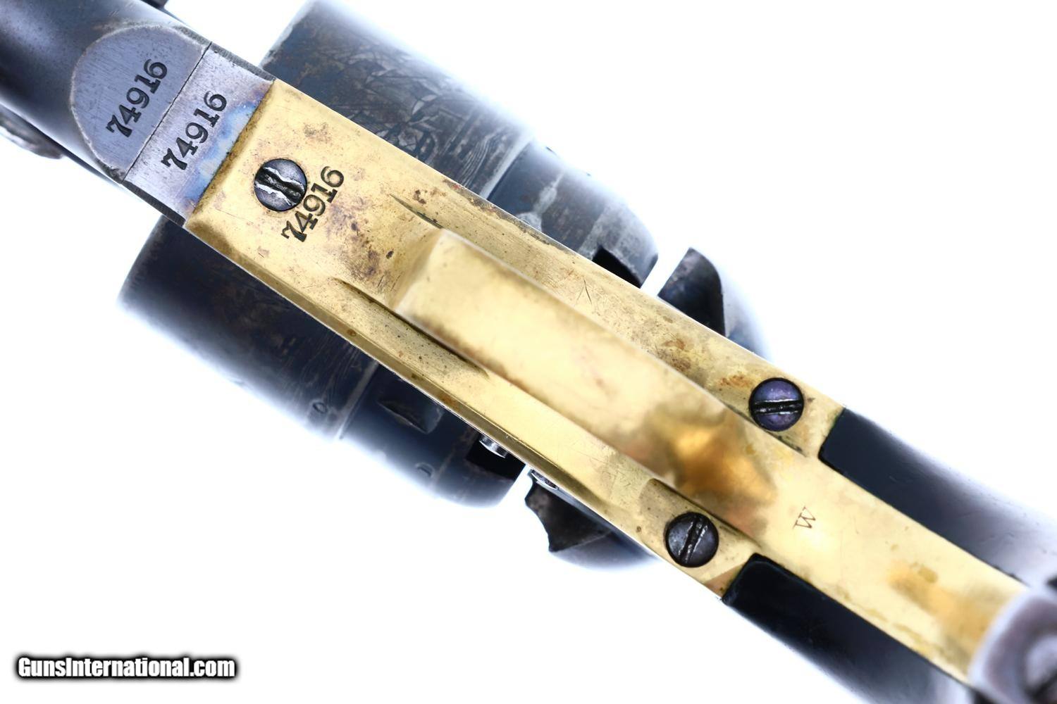 VG+ original condition with fading in usual areas of holster contact and handling. Faded/dulled color case hardening on ramrod, hammer and frame. Brass trigger guard having toned to a pleasant mustard color. Grips oil stained with scattered handling marks, inspection cartouches easily discernible. Bright bore with light oxidation, sharp rifling. Correct manual mechanics with each of the cylinders indexing nicely on full cock. EXC original discharge document with expected fading and folds.
