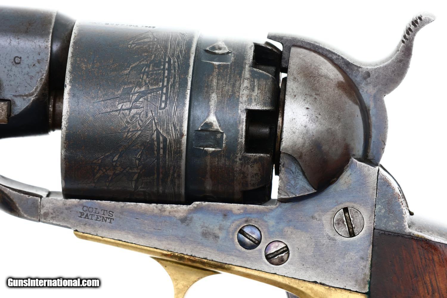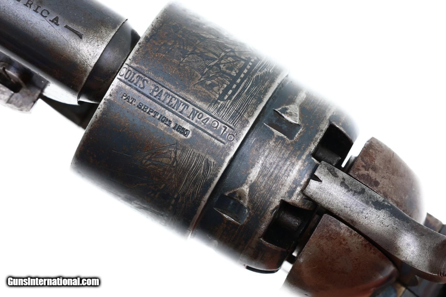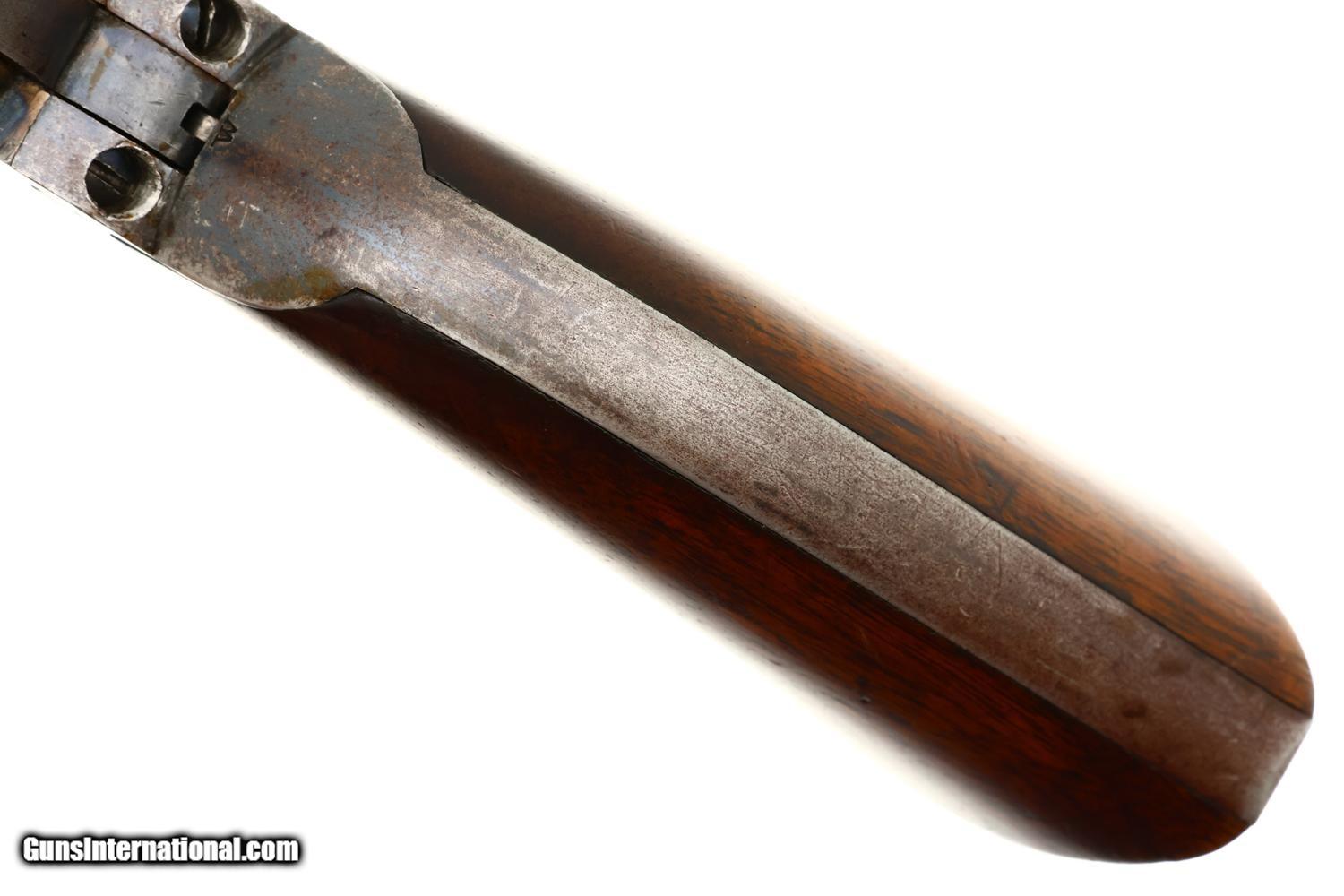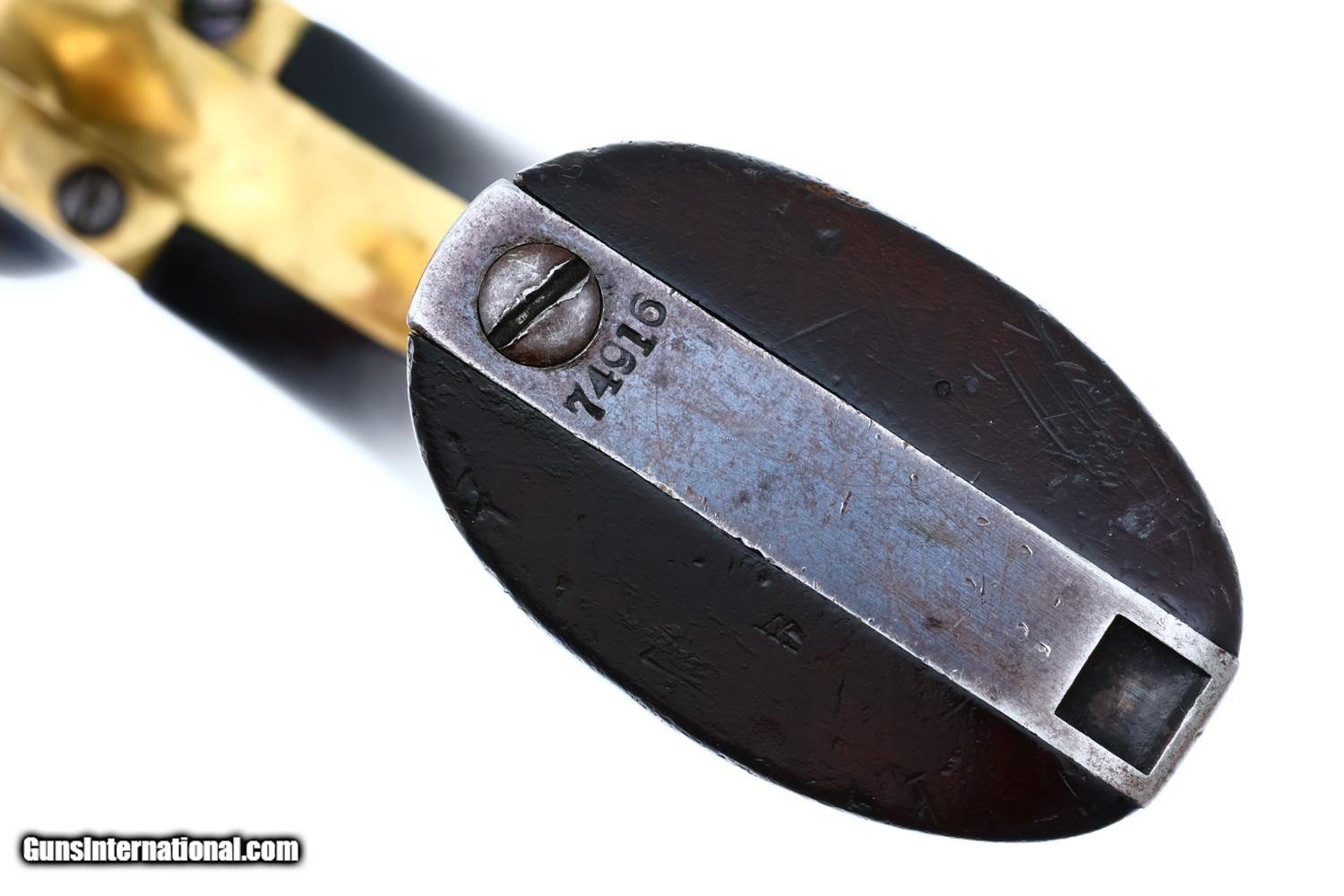 VG+ original condition with fading in usual areas of holster contact and handling. Faded/dulled color case hardening on ramrod, hammer and frame. Brass trigger guard having toned to a pleasant mustard color. Grips oil stained with scattered handling marks, inspection cartouches easily discernible. Bright bore with light oxidation, sharp rifling. Correct manual mechanics with each of the cylinders indexing nicely on full cock. EXC original discharge document with expected fading and folds.