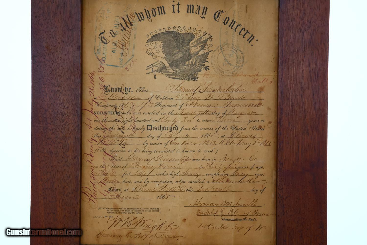 All matching standard configuration Colt 1860 Army revolver, .44 percussion, SN: 74916, manufactured in 1862 with over 129,000 having been purchased by the US Government. Features include a round 7.5" barrel with fixed blade front sight and hammer-notch rear sight, engraved rebated cylinder depicting naval battle scenes of the Battle of Campeche on May 16, 1843, and brass trigger guard. Top of barrel marked "ADDRESS COL. SAML COLT NEW-YORK U.S. AMERICA" with matching cylinder showing "COLTS PATENT No 4916" and "PAT SEPT 10TH 1850" patent markings. Left side of frame marked "COLTS PATENT" below the cylinder. Fitted with smooth walnut grips showing natural wood grain and cartouche acceptance on each panel. Grip strap is inspection-stamped "W". Serial number 74916 appears on brass trigger guard, under barrel, steel frame, and butt. Wedge and cylinder axle marked "4916". Accompanying this revolver is a framed, original discharge paper of Samuel Linsenbigler, dated 16 June 1865, referencing his three years of duty during the Civil War. On the back are additional notes dated 6 August 1870. The Colt 1860 Army became one of the most successful revolvers in firearms history and was widely used during the American Civil War and western expansion, favored by military forces and civilians including Wild Bill Hickok and Buffalo Bill Cody!